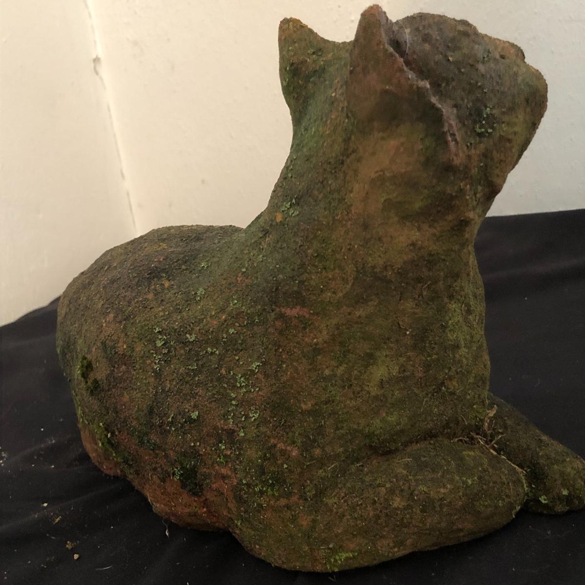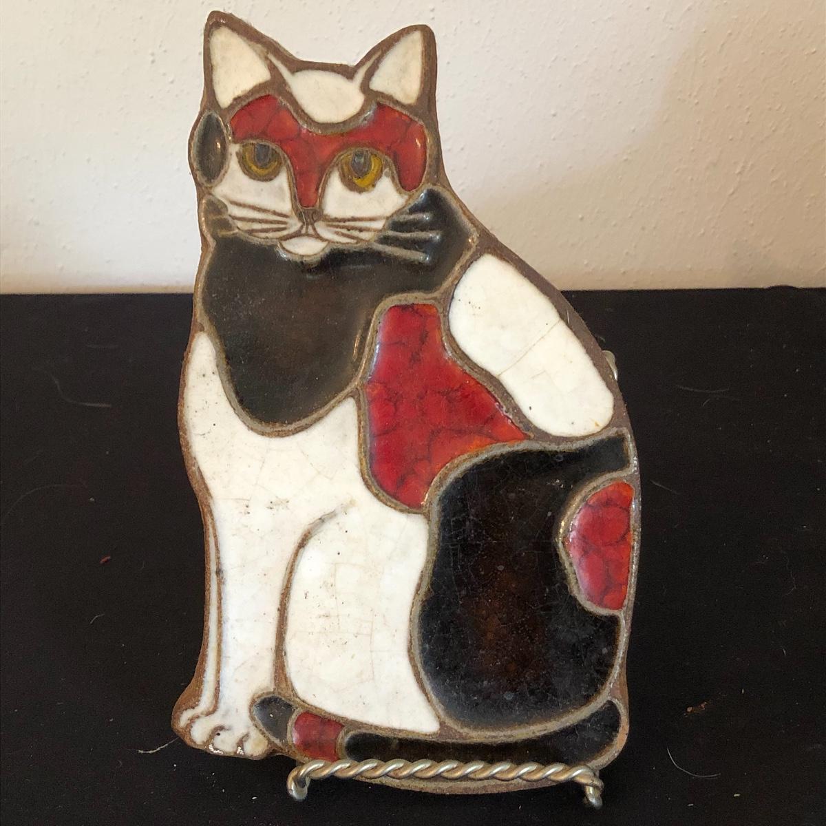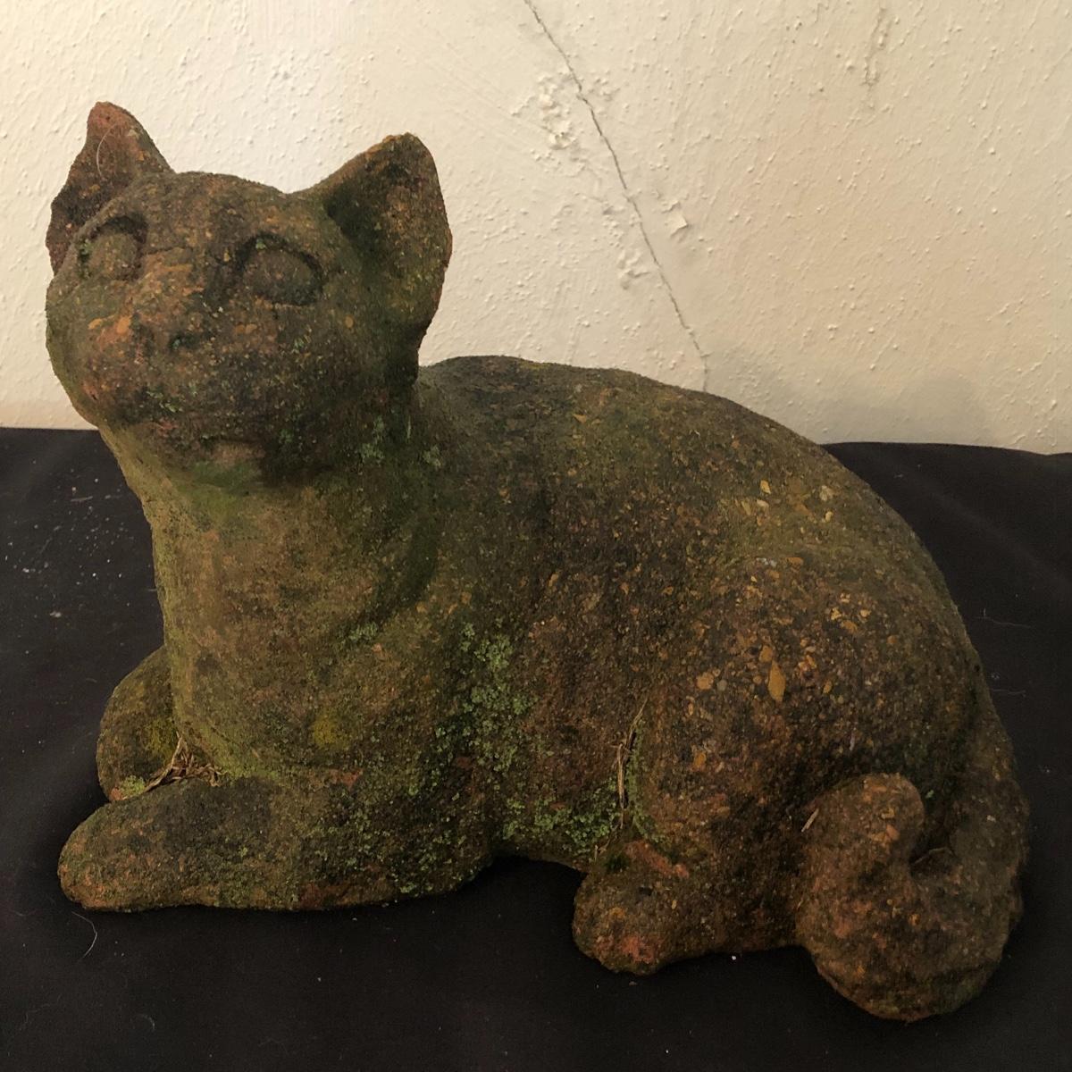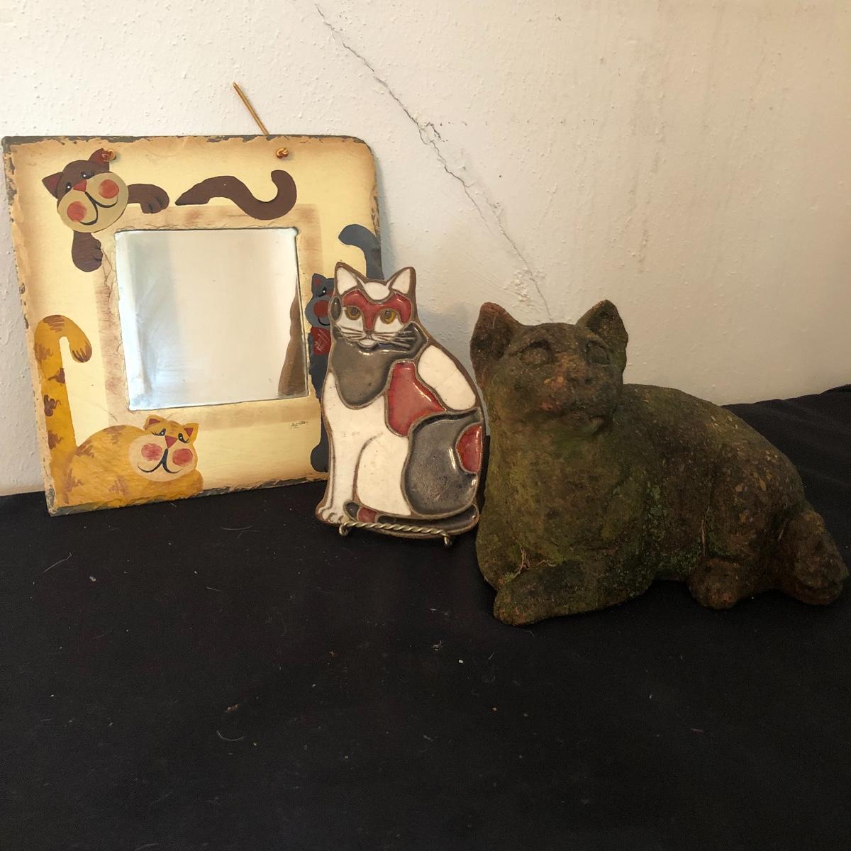 This lovely trio celebrating our feline friends includes a hand cut ,stenciled mirror (leather hanging strap needs replacing, easy fix), a pottery decorative cat and a cat statue from Brookfield Co. that would look great indoors or out. Statue has a hairline crack on its base, therefore hidden from view and it appears to be made out of stone. It measures approximately 14” x 8” x 9”.