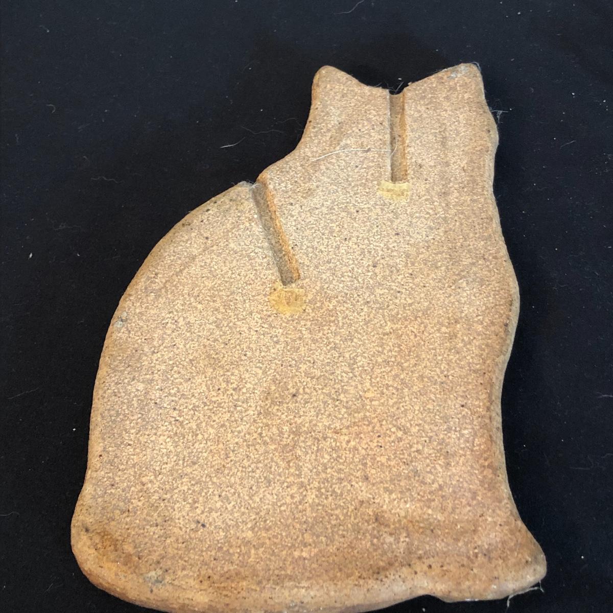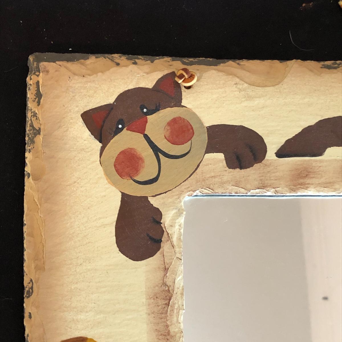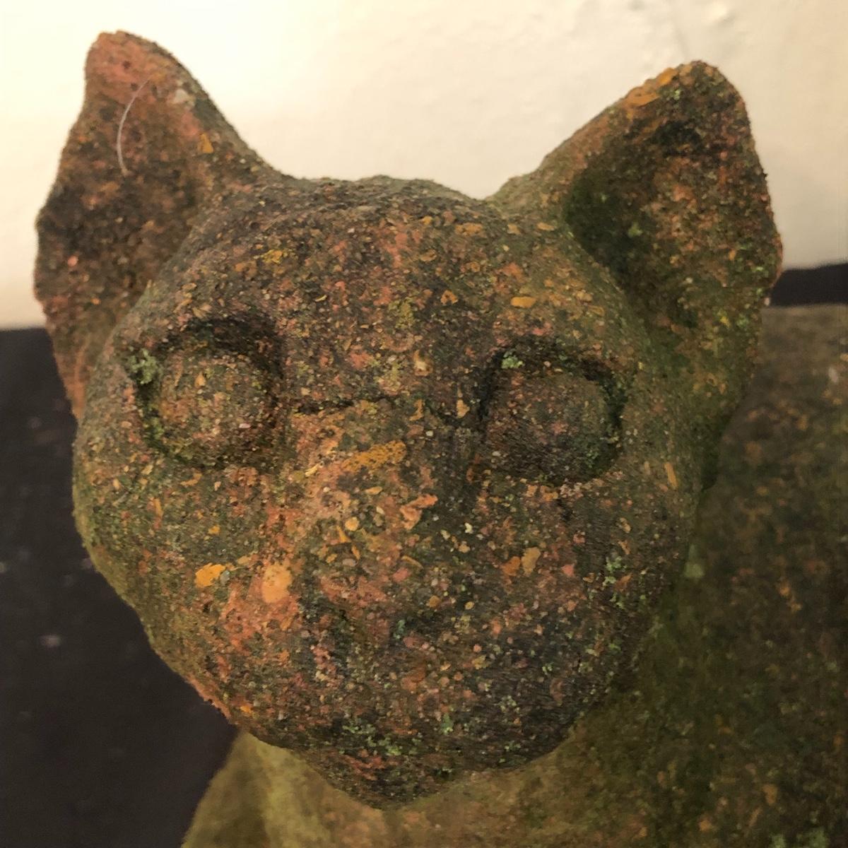 This lovely trio celebrating our feline friends includes a hand cut ,stenciled mirror (leather hanging strap needs replacing, easy fix), a pottery decorative cat and a cat statue from Brookfield Co. that would look great indoors or out. Statue has a hairline crack on its base, therefore hidden from view and it appears to be made out of stone. It measures approximately 14” x 8” x 9”.