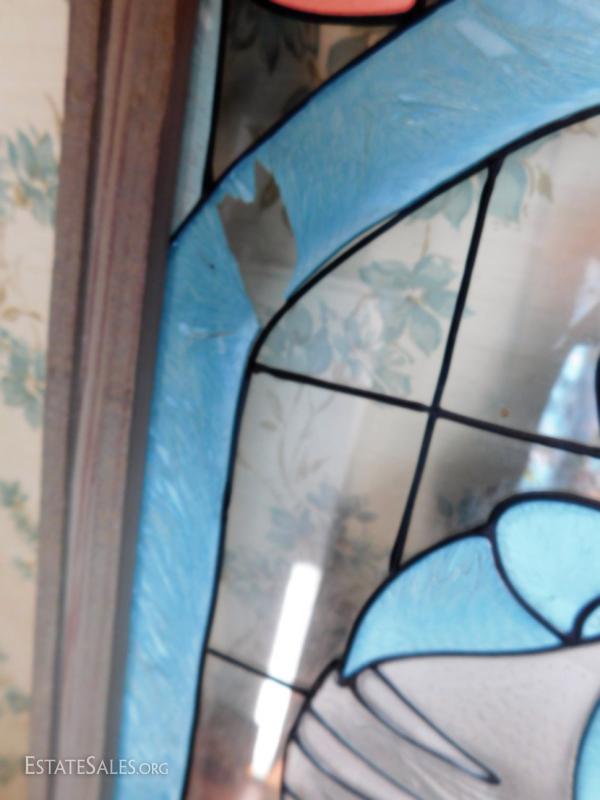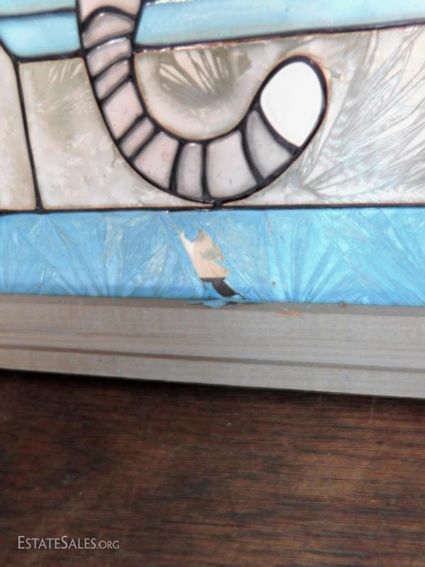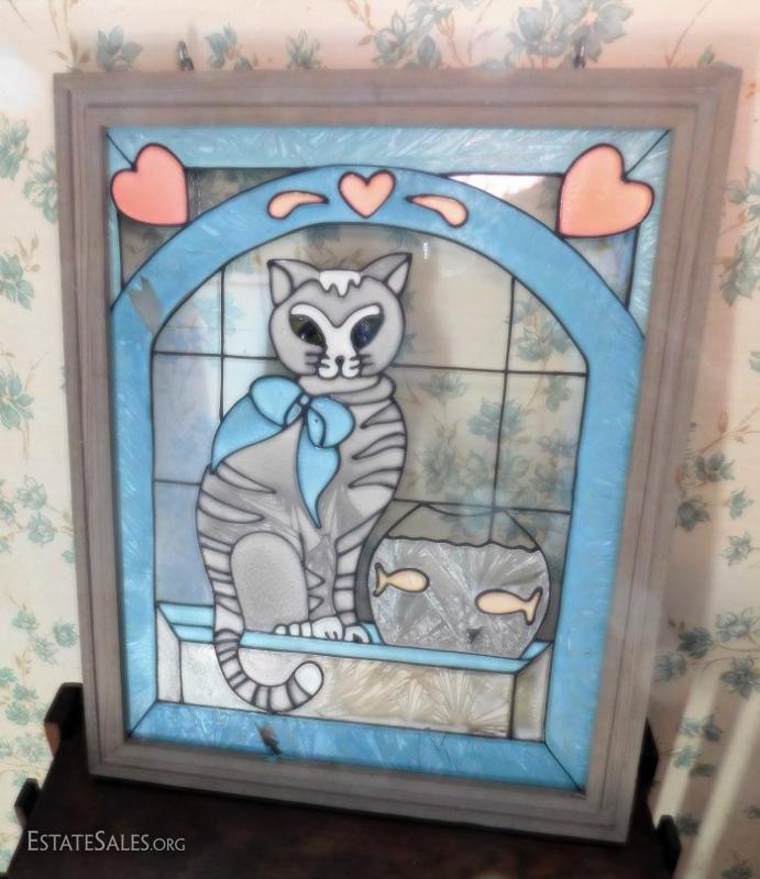 Painted window with cat and fish bowl. Wood framed with hooks and chains for easy display. Paint is weak in a couple of spots as seen in photographs. Nice looking.
