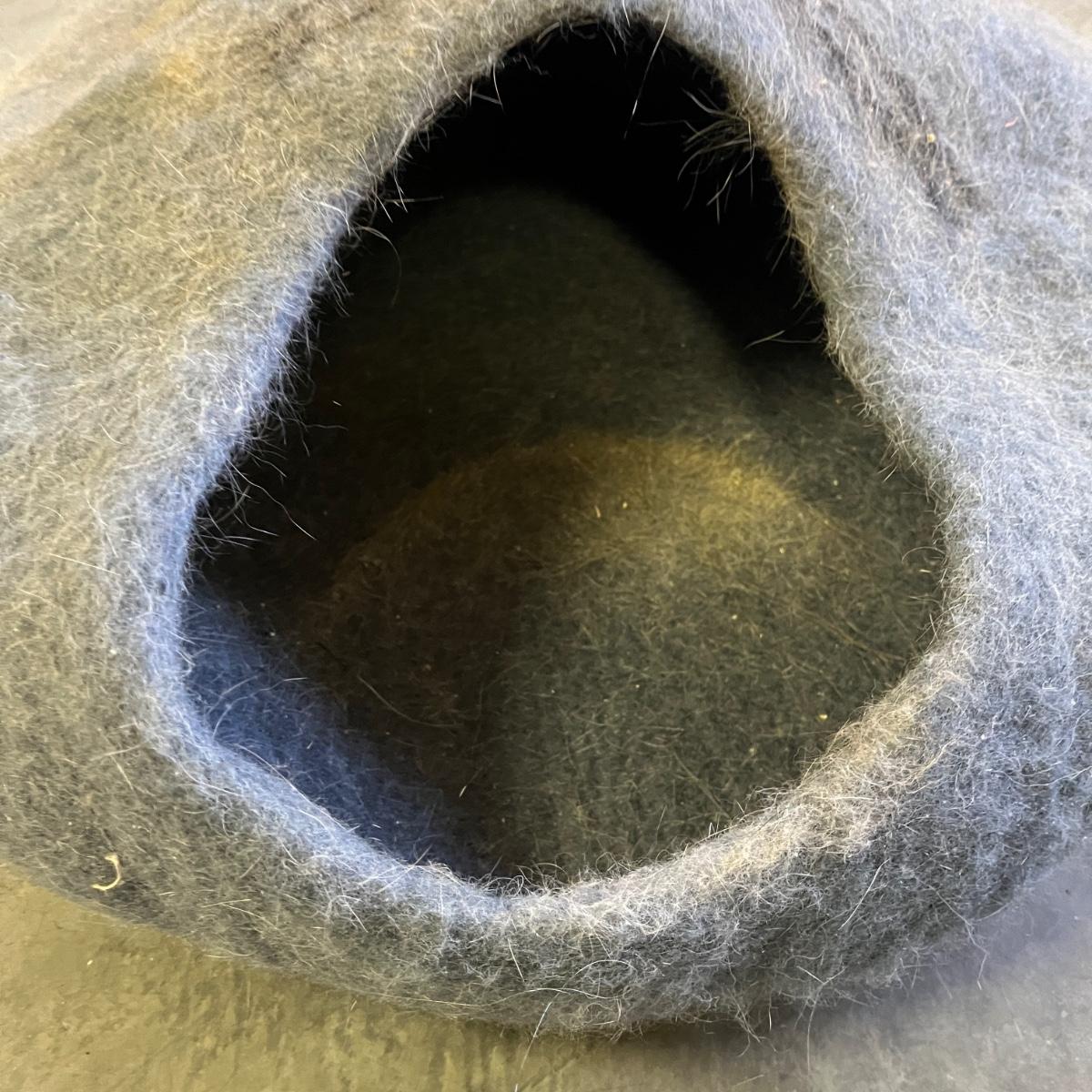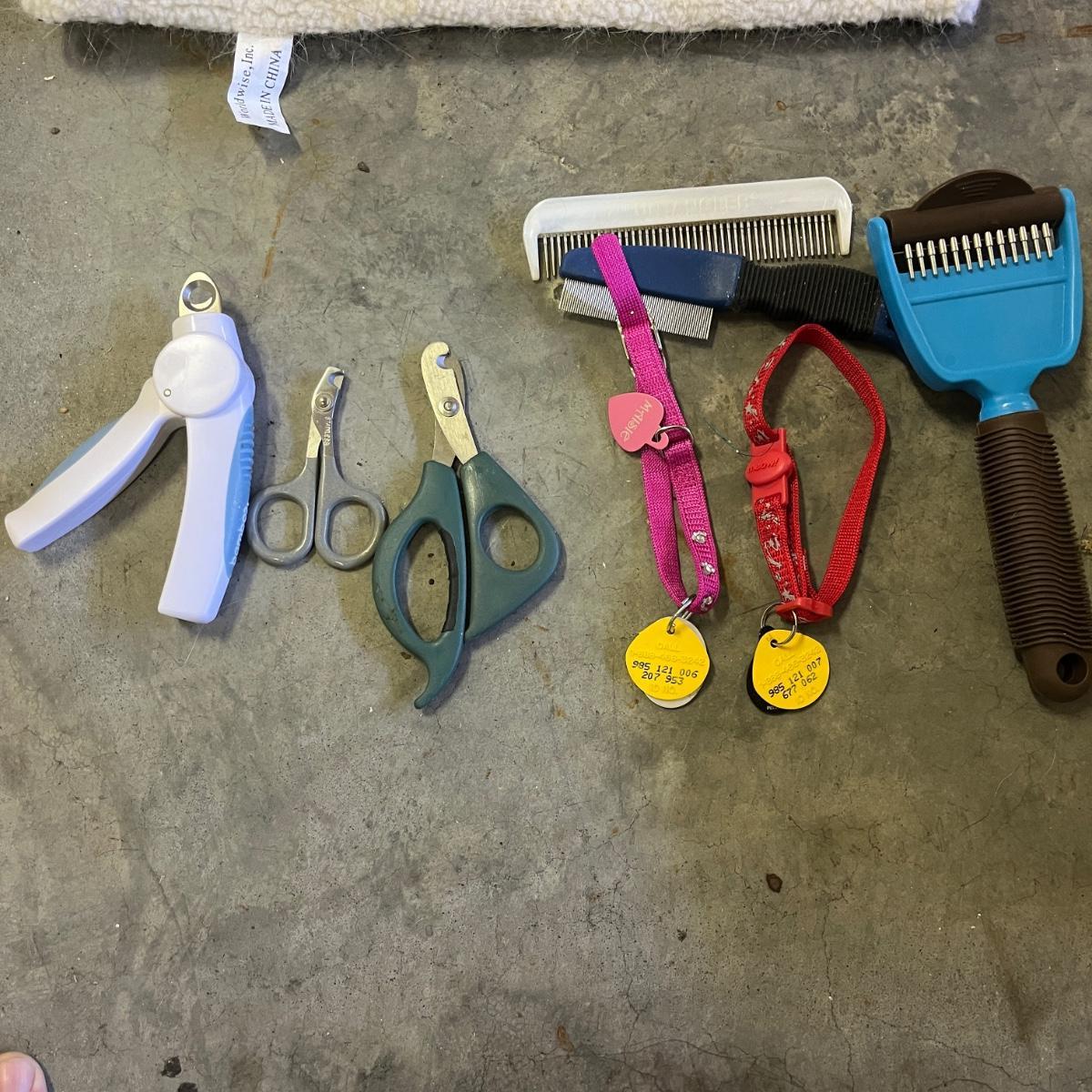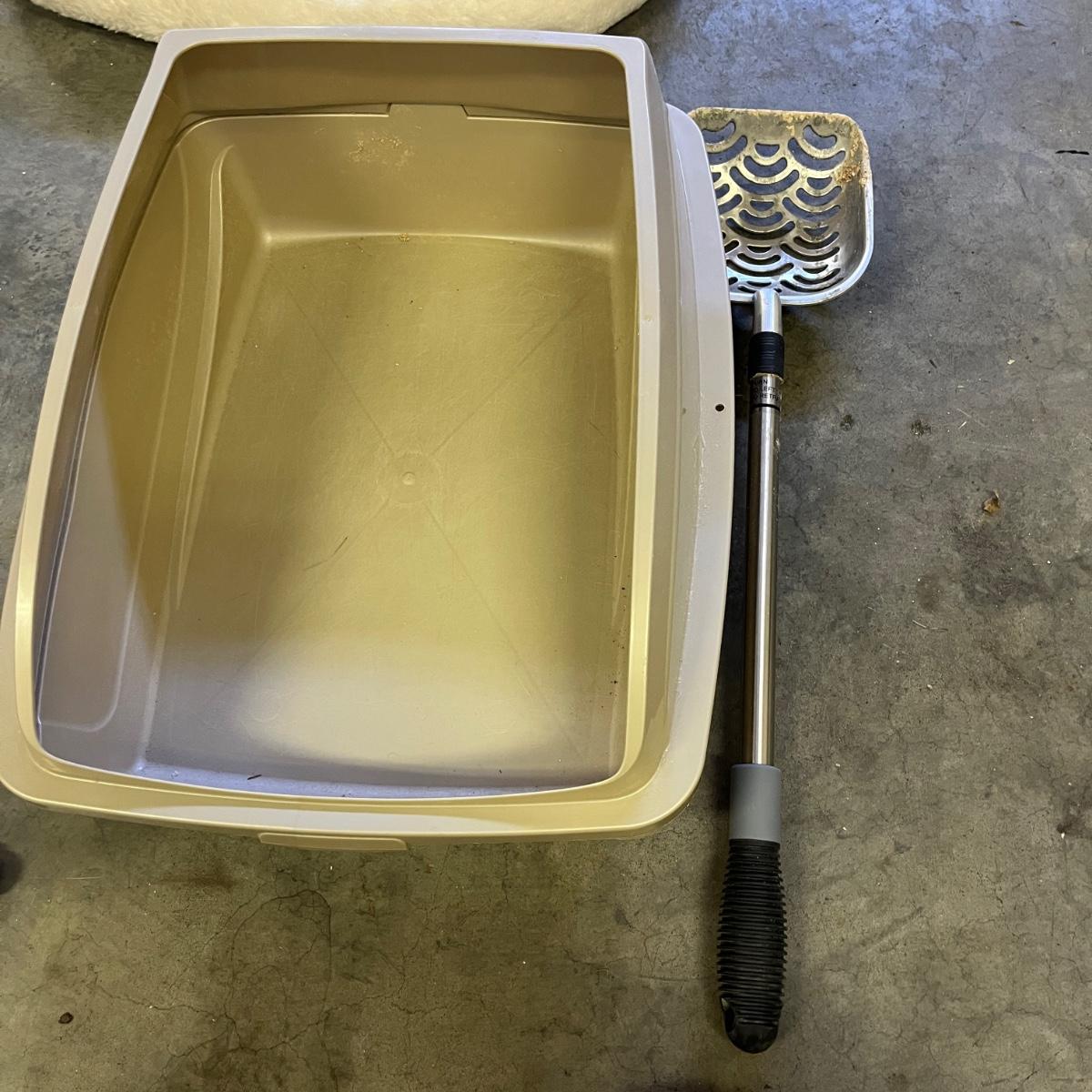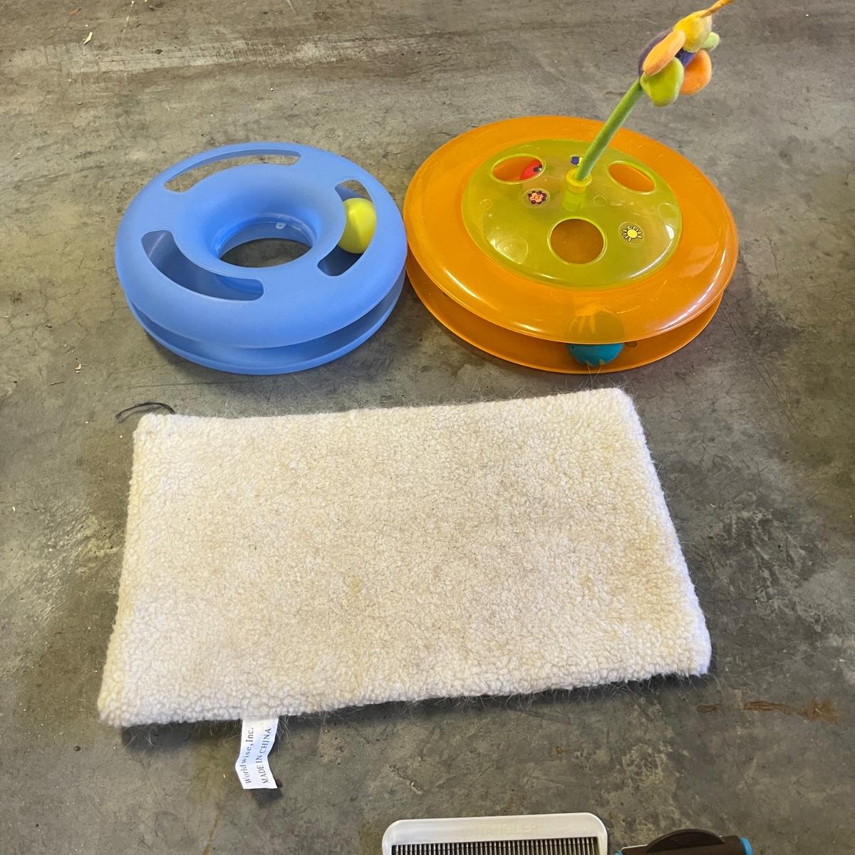 Lot includes two cat ball toys, combs, two collars, litter box mat, bowl, metal telescoping scoop litter box, bed and mouse shaped bed that measures 22” x 18” x 8”H.