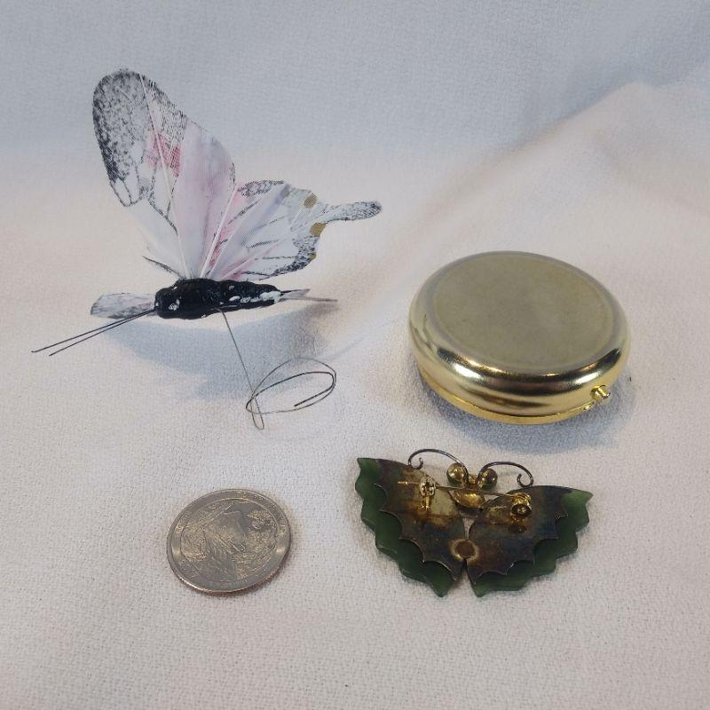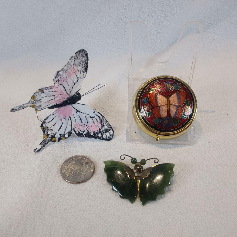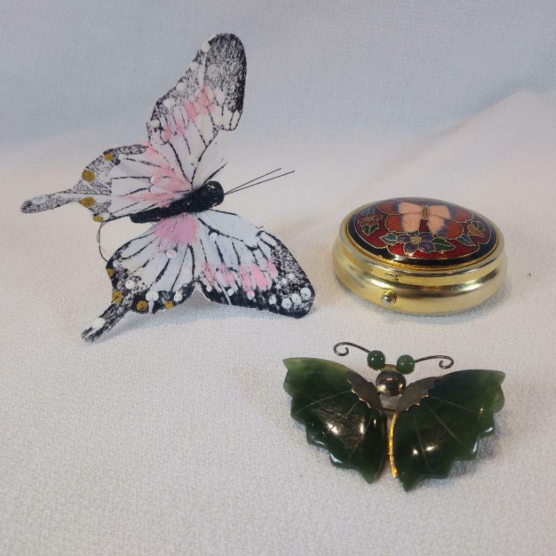 This lot is for a trio of Butterflies. One is a pretty small and useful pill box, another is a fluttery decorative paper butterfly for display and the third is a very nice carved jade and silver crafted Butterfly jewelry pin. Butterflies are usually free - but not here, you gotta bid.