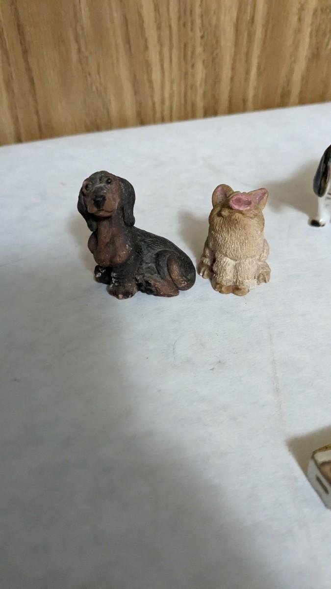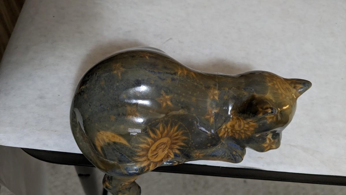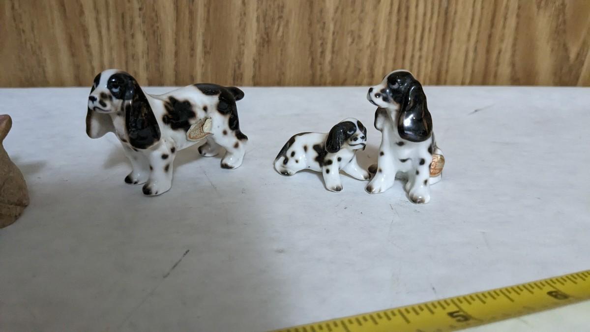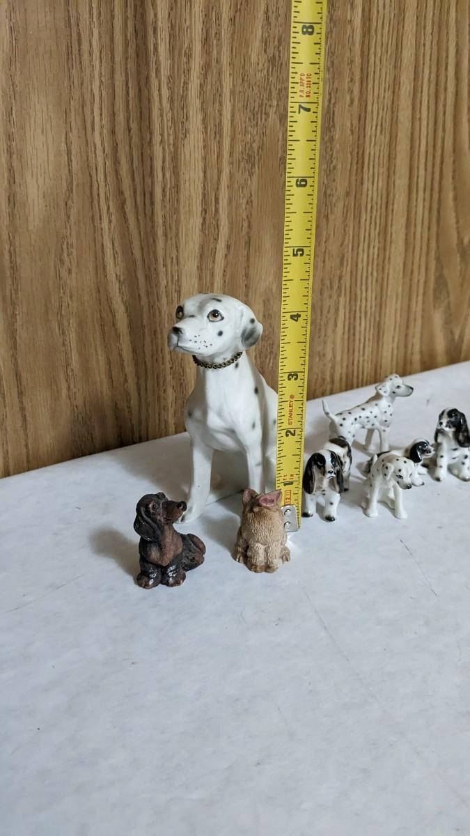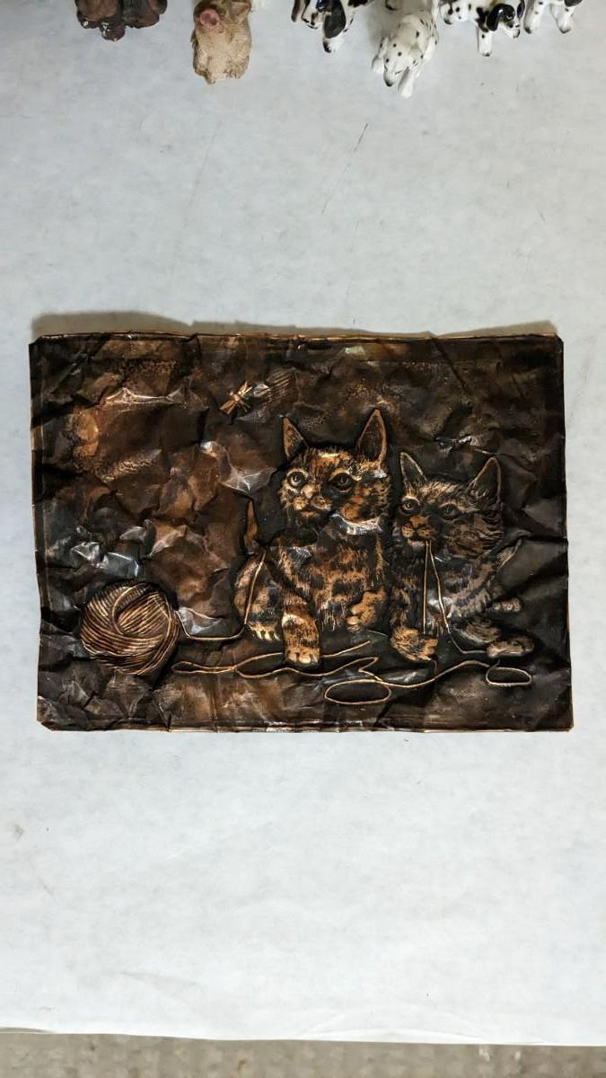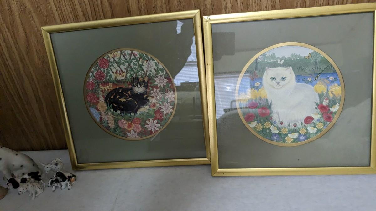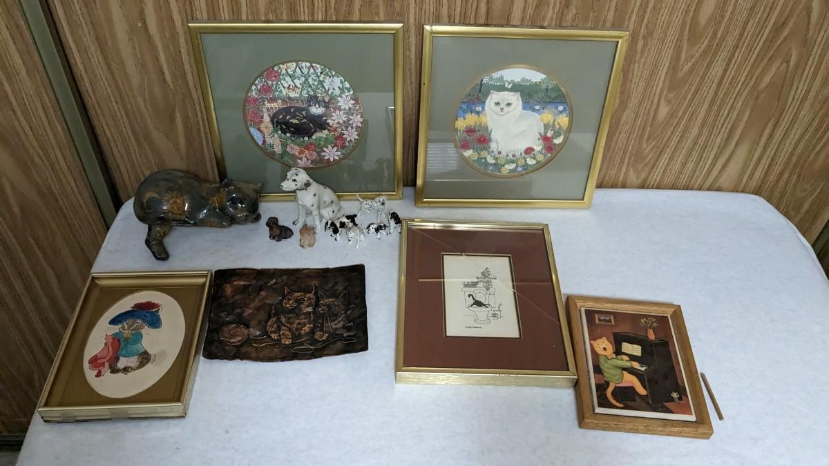 various framed cat items, a very neat copper impression and celestial shelf sitter. Also includes varied bisque dog figurines in great condition. bdrm1