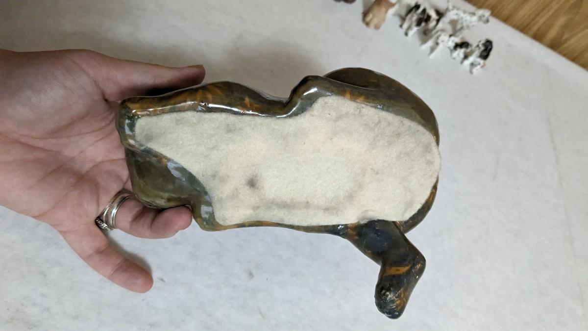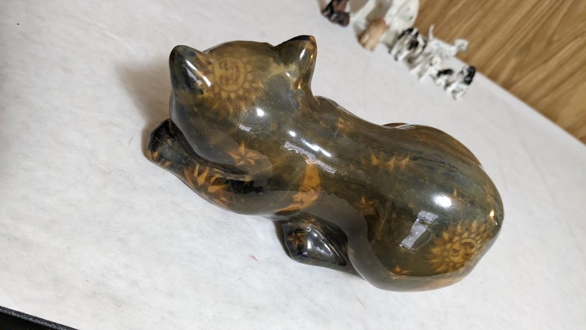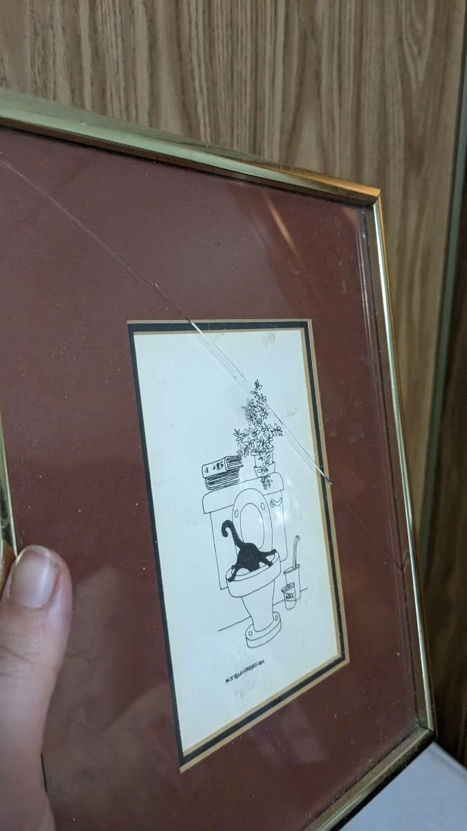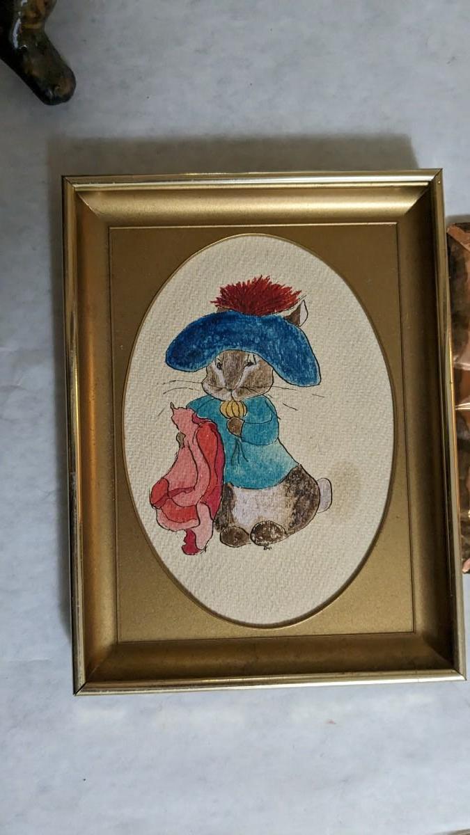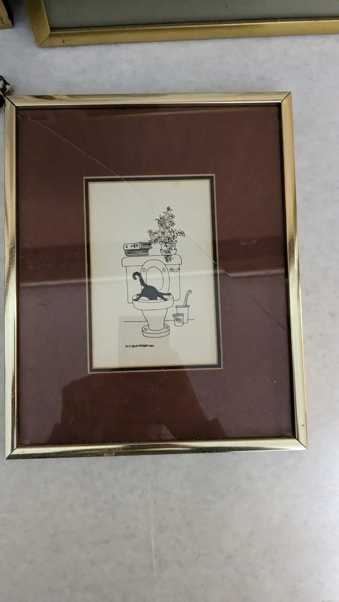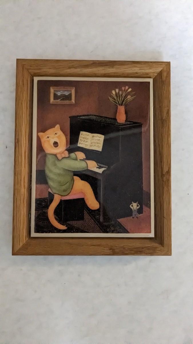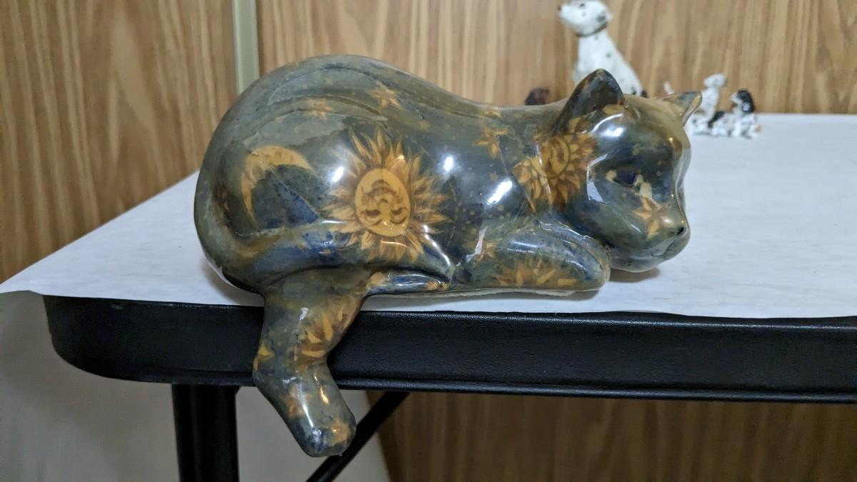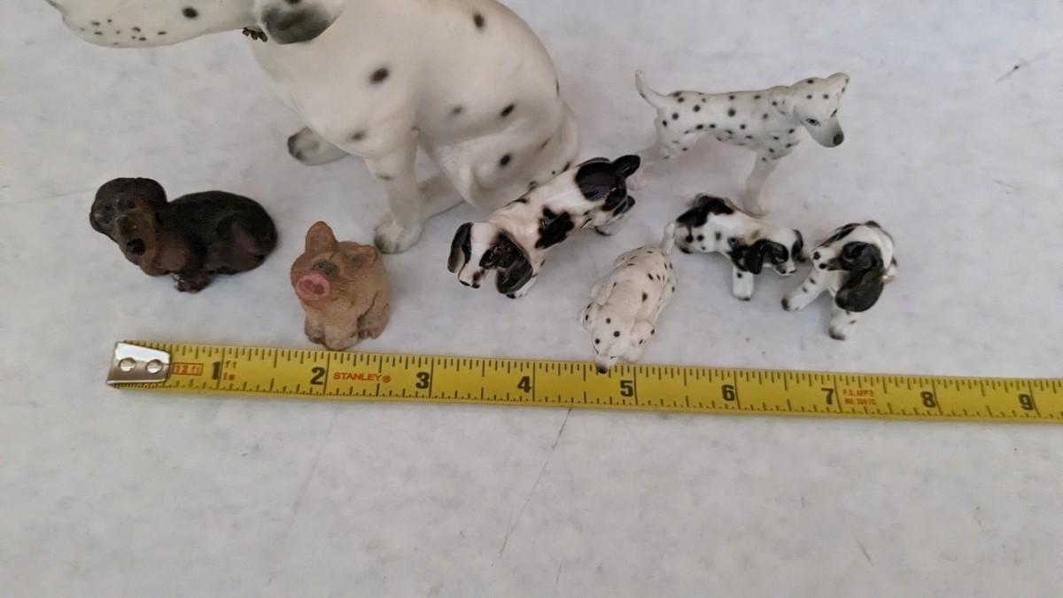 various framed cat items, a very neat copper impression and celestial shelf sitter. Also includes varied bisque dog figurines in great condition. bdrm1
