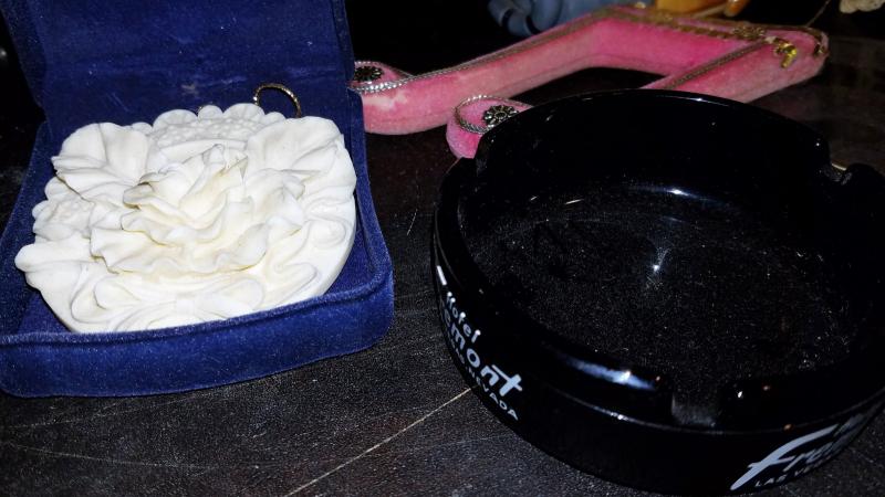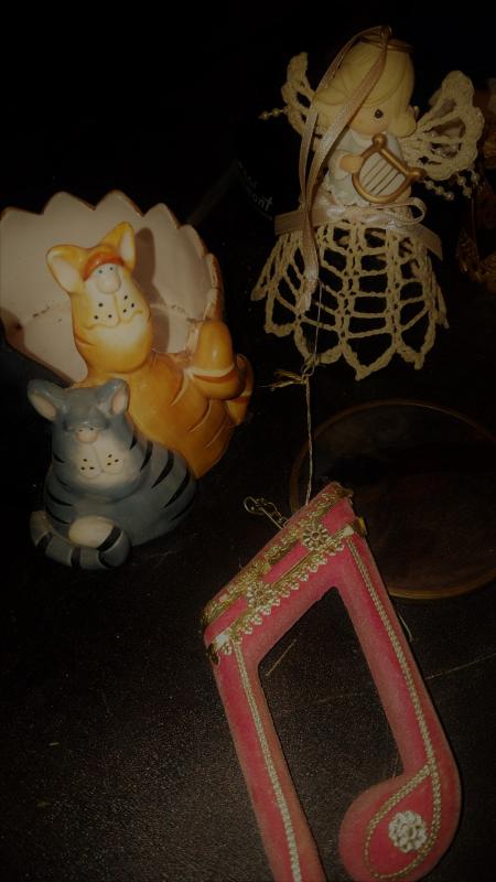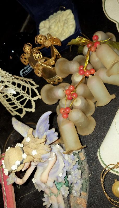Cat candle holder one of the more interesting angels her wings turn her into an egg, there is a vase and glass white bells