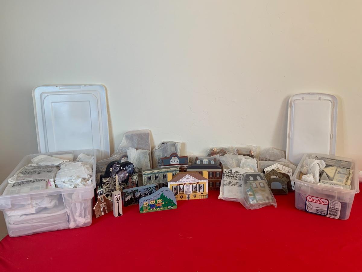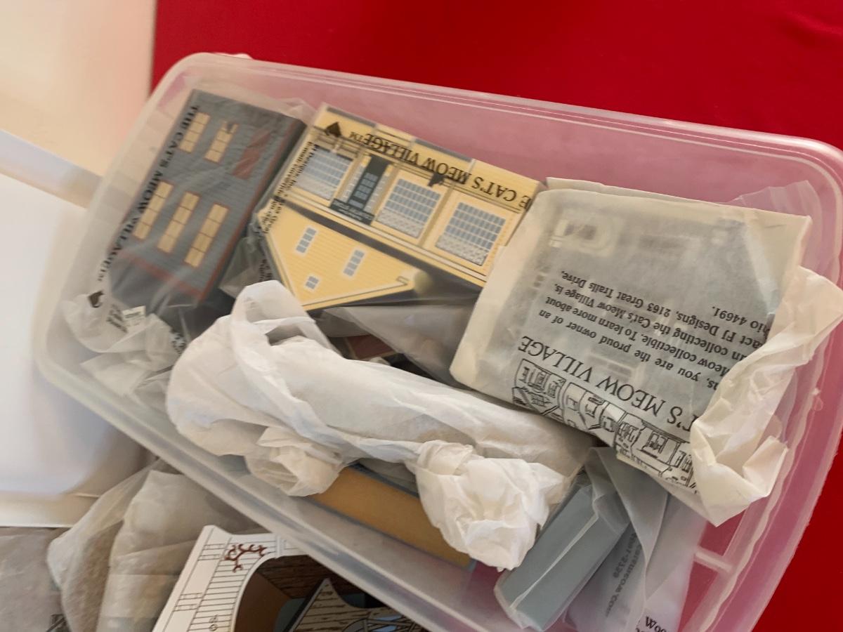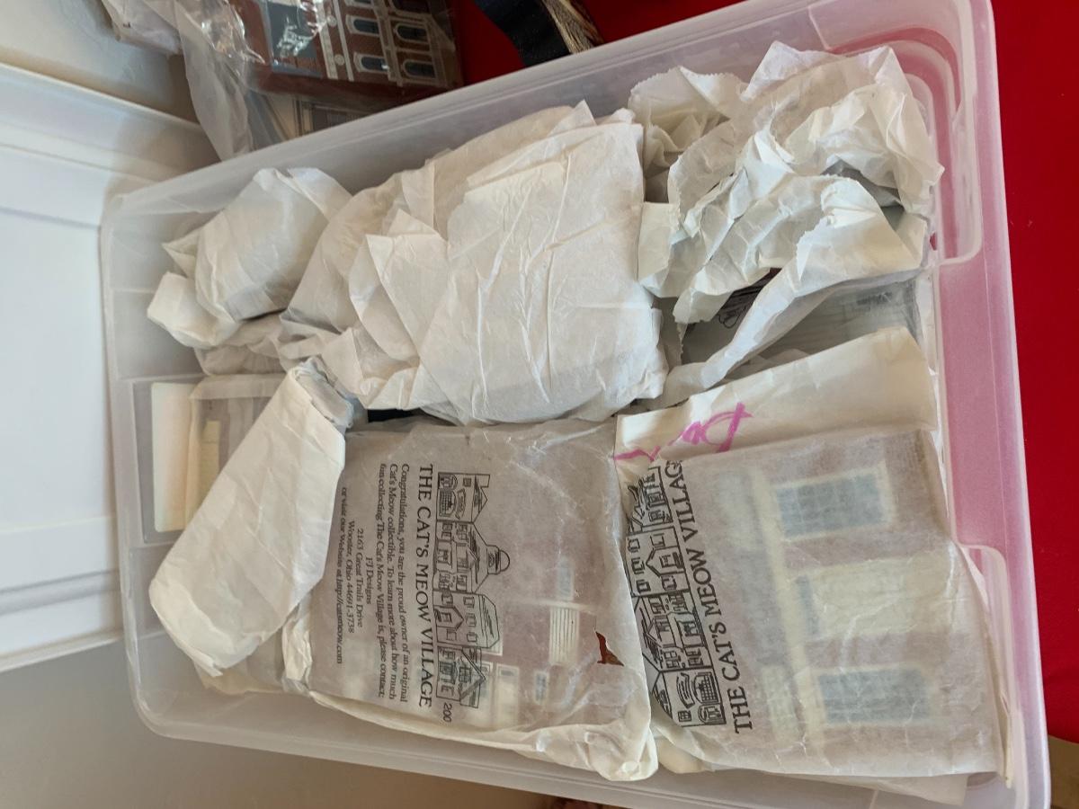 TONS of pieces from the Cat’s Meow Village line of painted buildings and town. Most are still in original bags, very good condition. Two full plastic storage boxes along with other pictured in the middle.