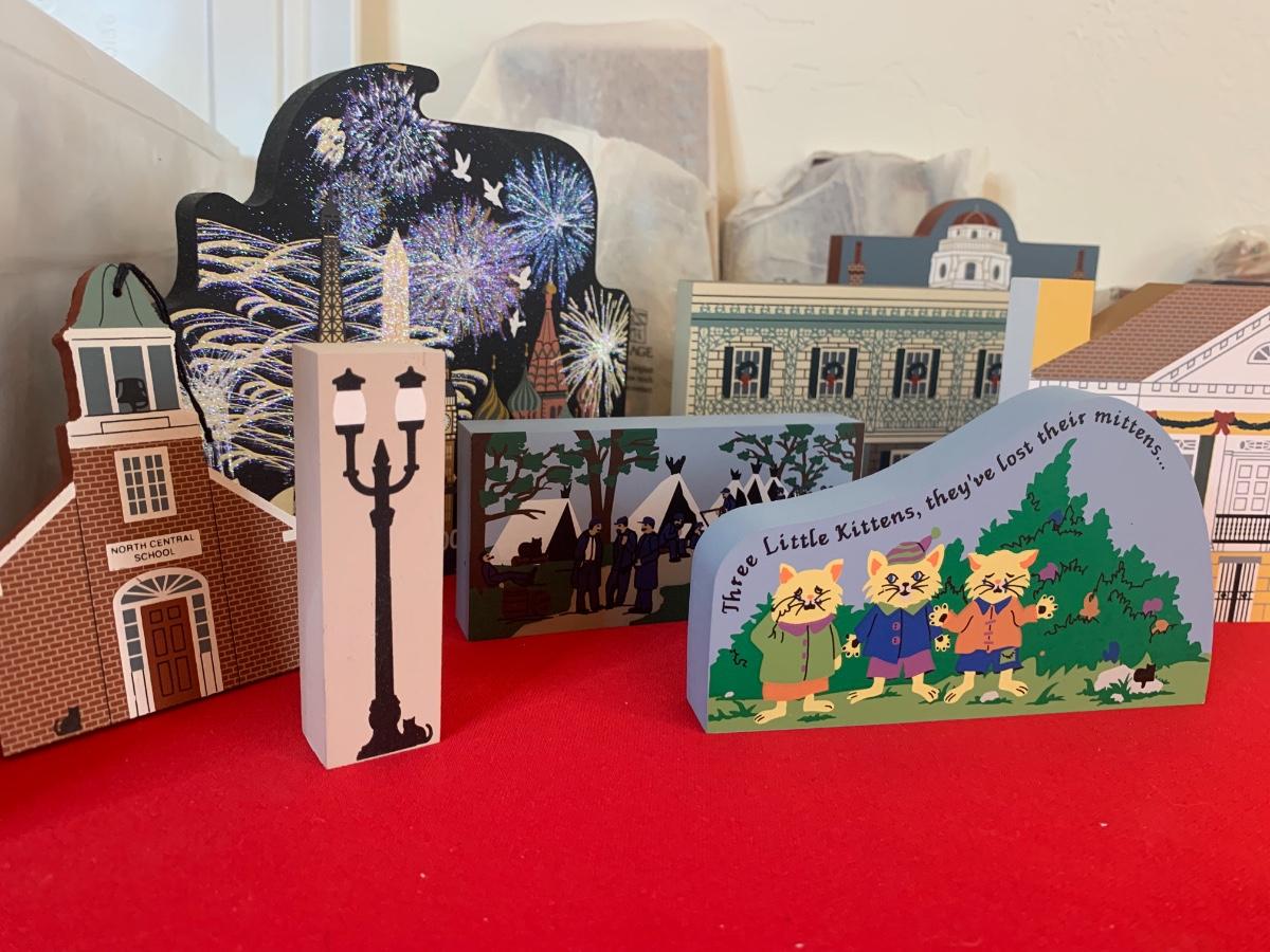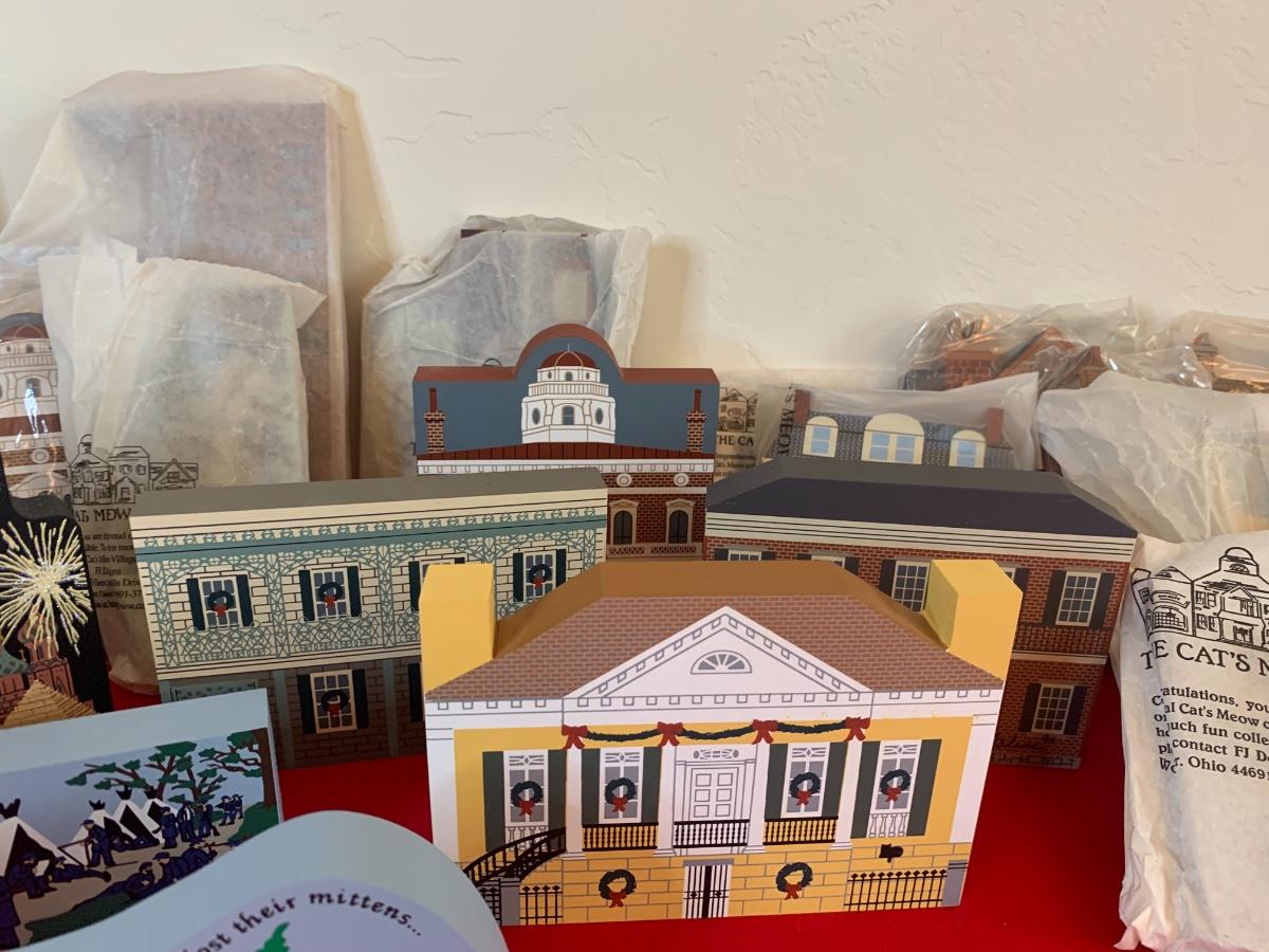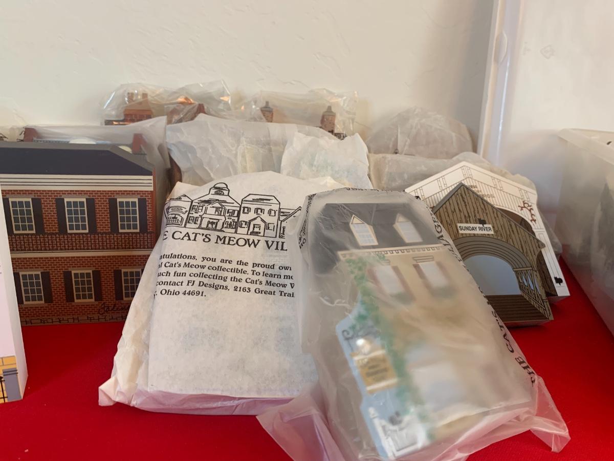 TONS of pieces from the Cat’s Meow Village line of painted buildings and town. Most are still in original bags, very good condition. Two full plastic storage boxes along with other pictured in the middle.