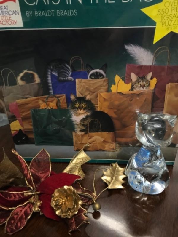 One really love perfect glass cat paperweight and a 500 pc cat puzzle.