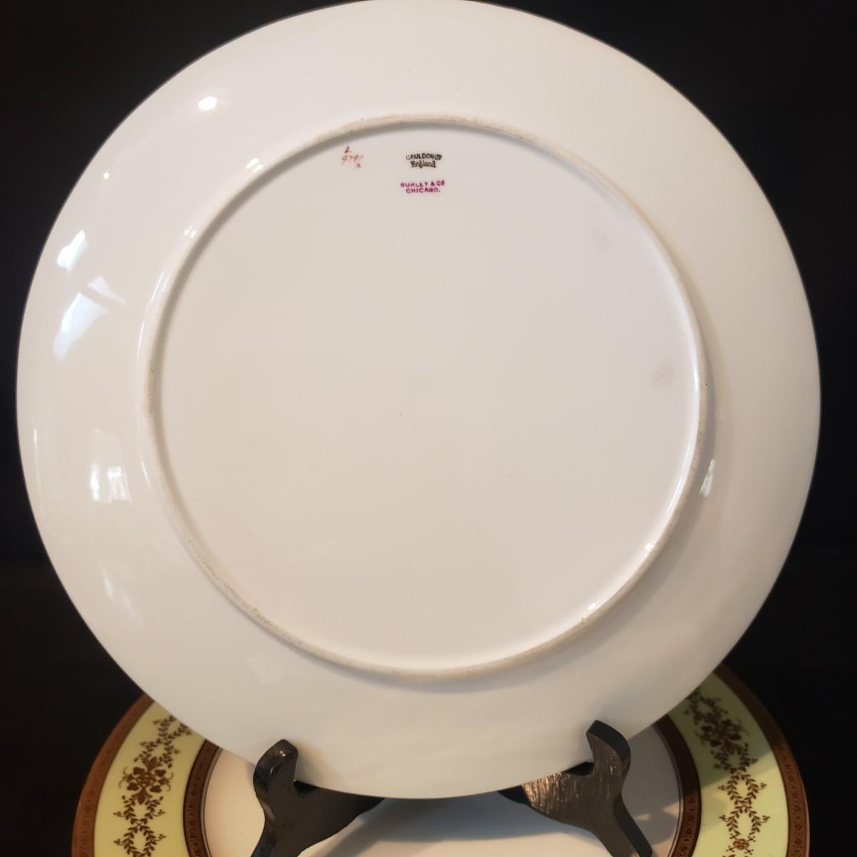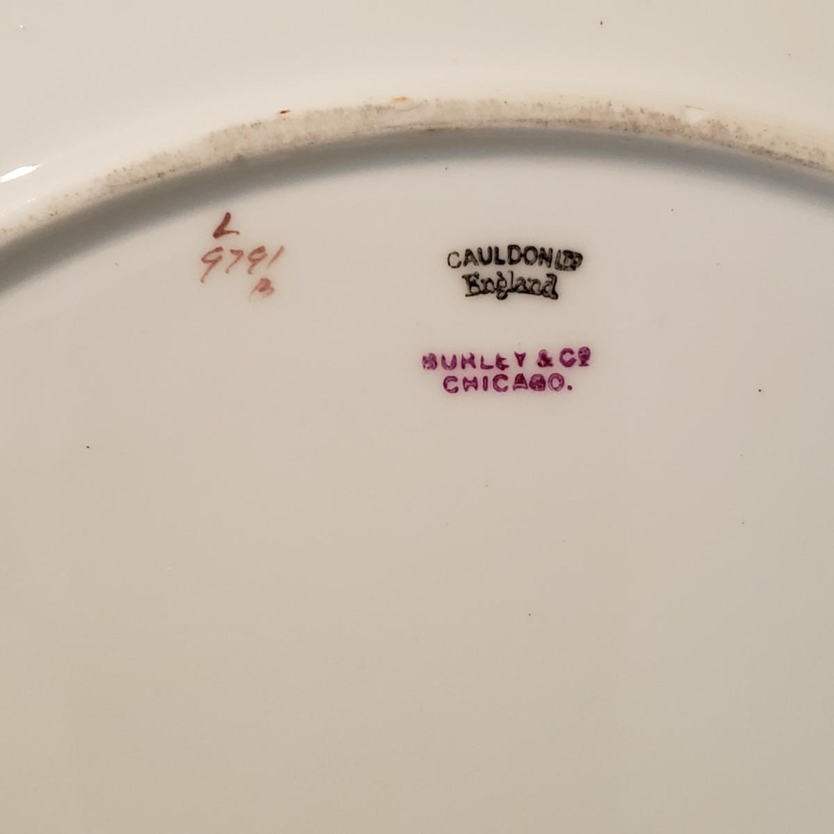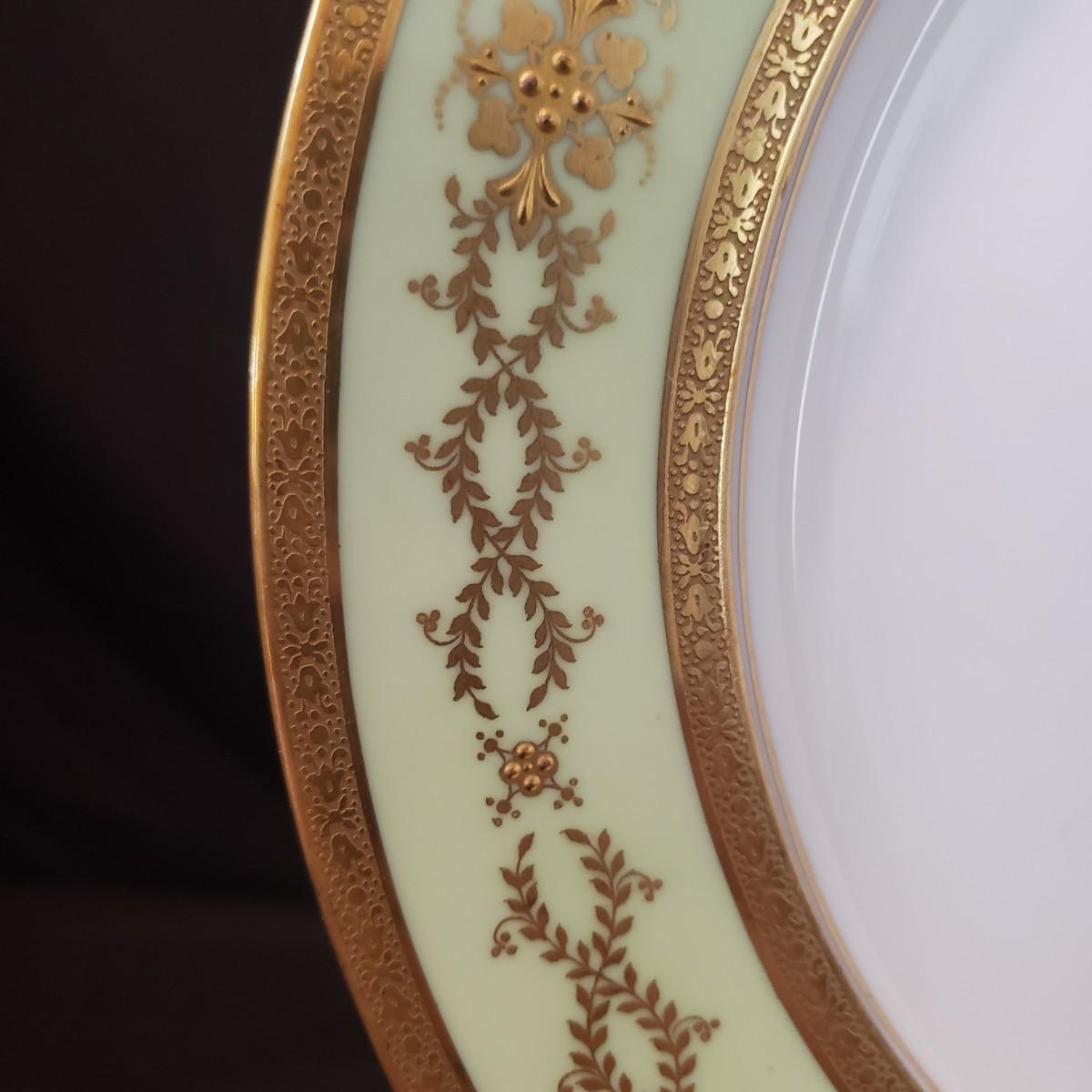 This lot features 12 Cauldon plates made in England. This gorgeous pattern has a light green based rim with textured gold accents. There appears to be no blemishes on the plates. The plates measure 10".