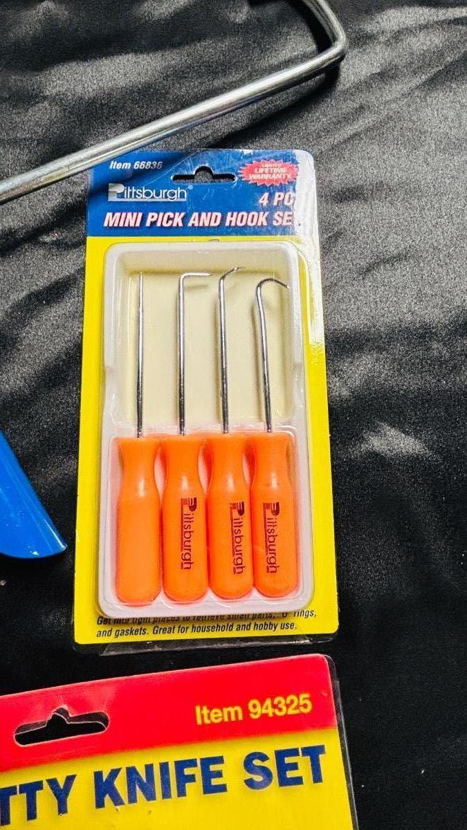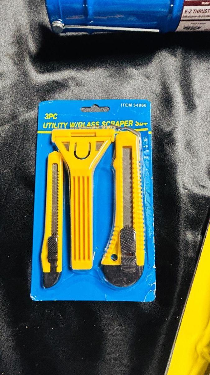 CAULKING GUN, PUTTY KNIVES, RAZOR KNIVES AND SCRAPER, AND PICK SET
