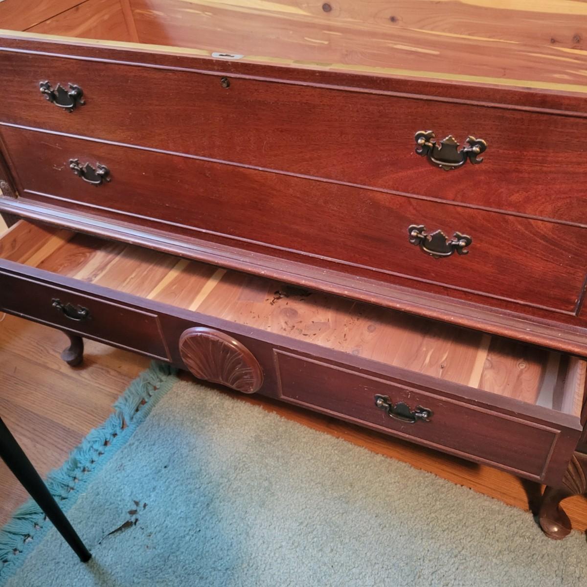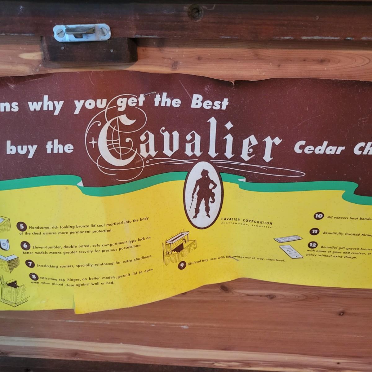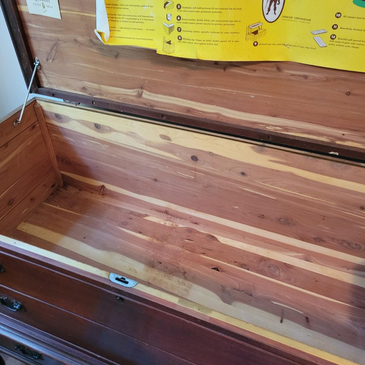 A vintage Cavalier cedar chest with a lower drawer with dovetailed joints. Chest is in good condition but there are some scratches on the chest top and gapping at some wood joints, but still has plenty of life left in it. Chest measures approximately 44" x 19" x 33" Local pickup only