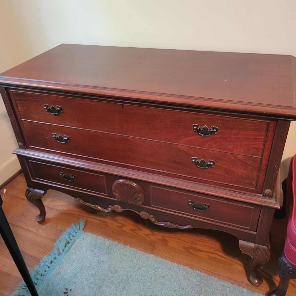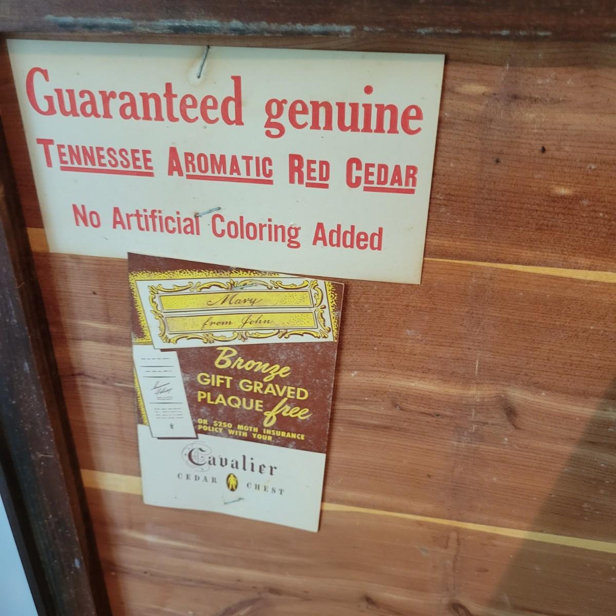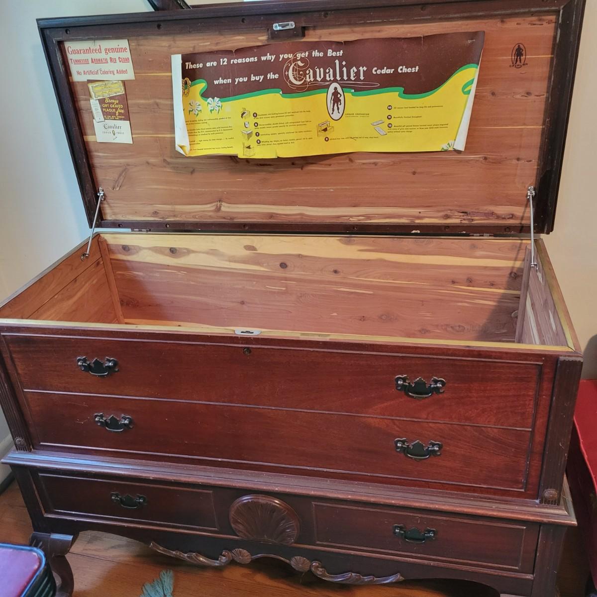 A vintage Cavalier cedar chest with a lower drawer with dovetailed joints. Chest is in good condition but there are some scratches on the chest top and gapping at some wood joints, but still has plenty of life left in it. Chest measures approximately 44" x 19" x 33" Local pickup only