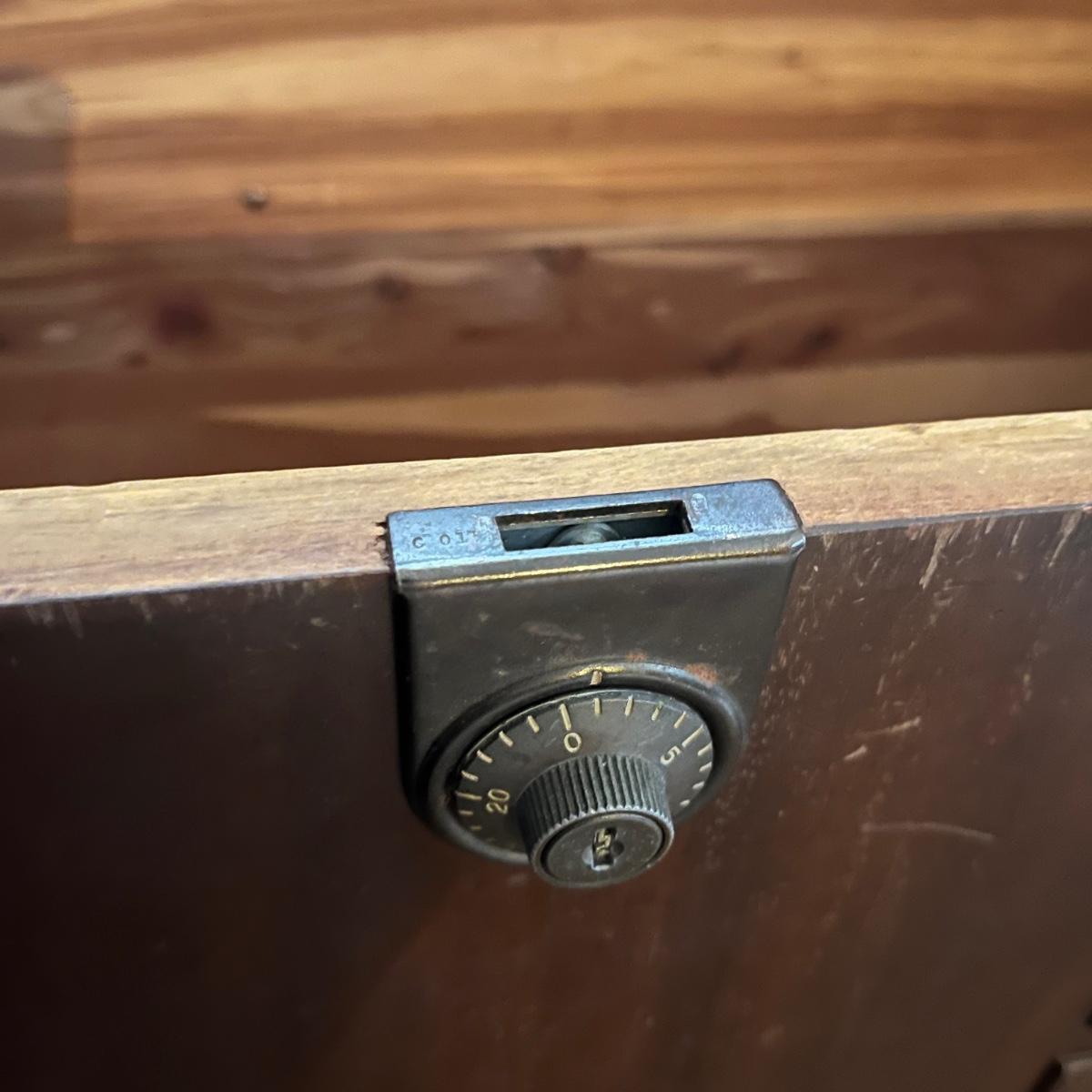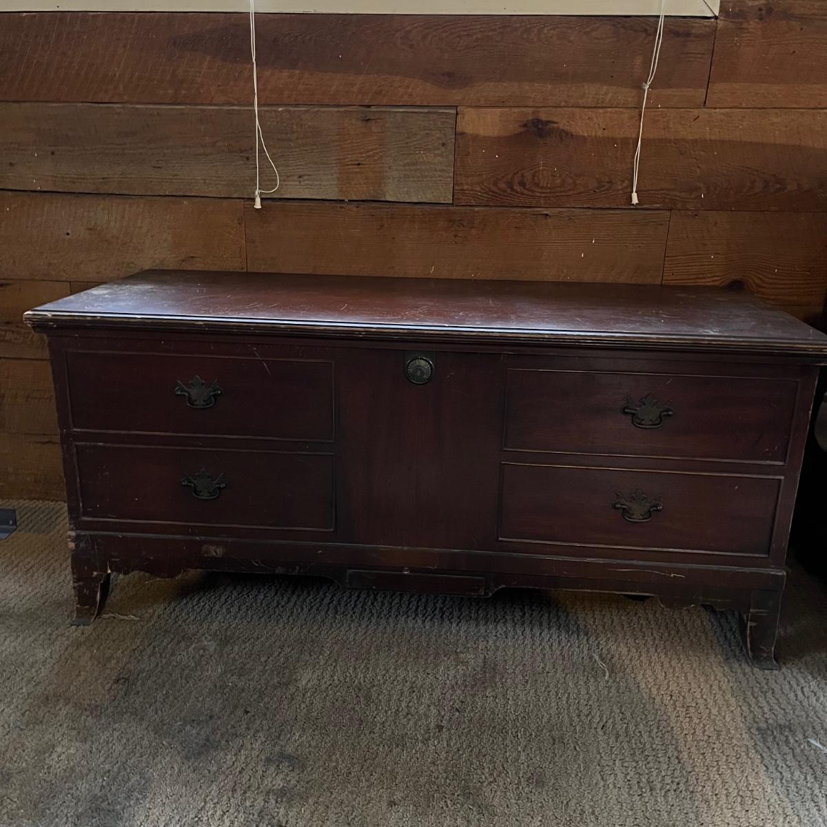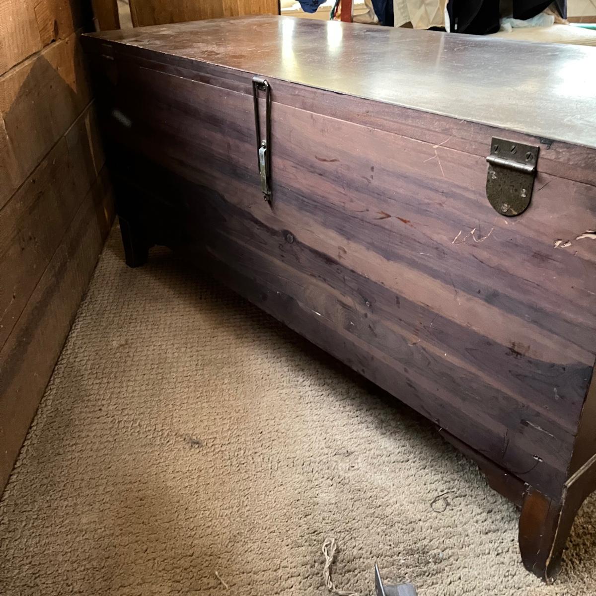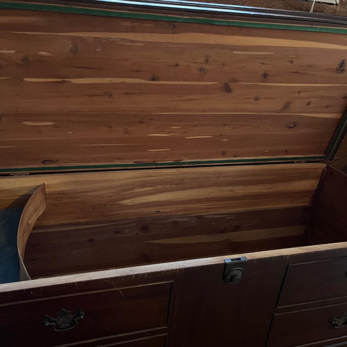 This Cavalier cedar lined chest has a small shelf in the inside corner. Chest has some scratches and nicks, see pictures. Chest measures 19” x 48” x 22”. The latch has been removed and we do not have combination.