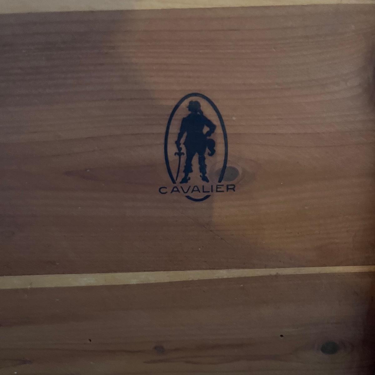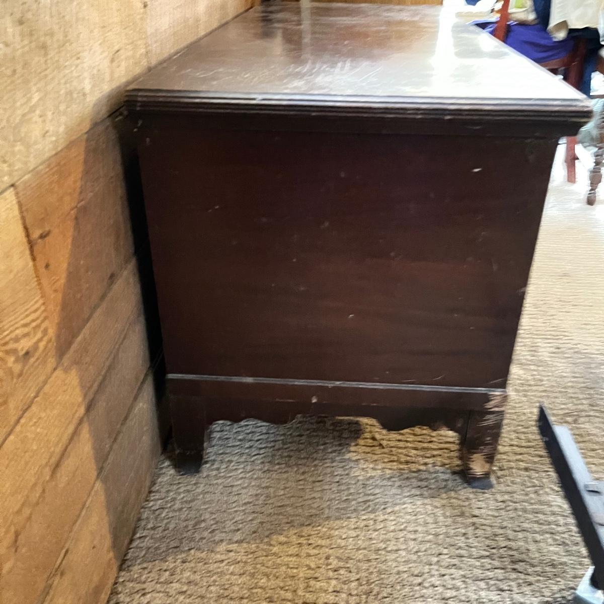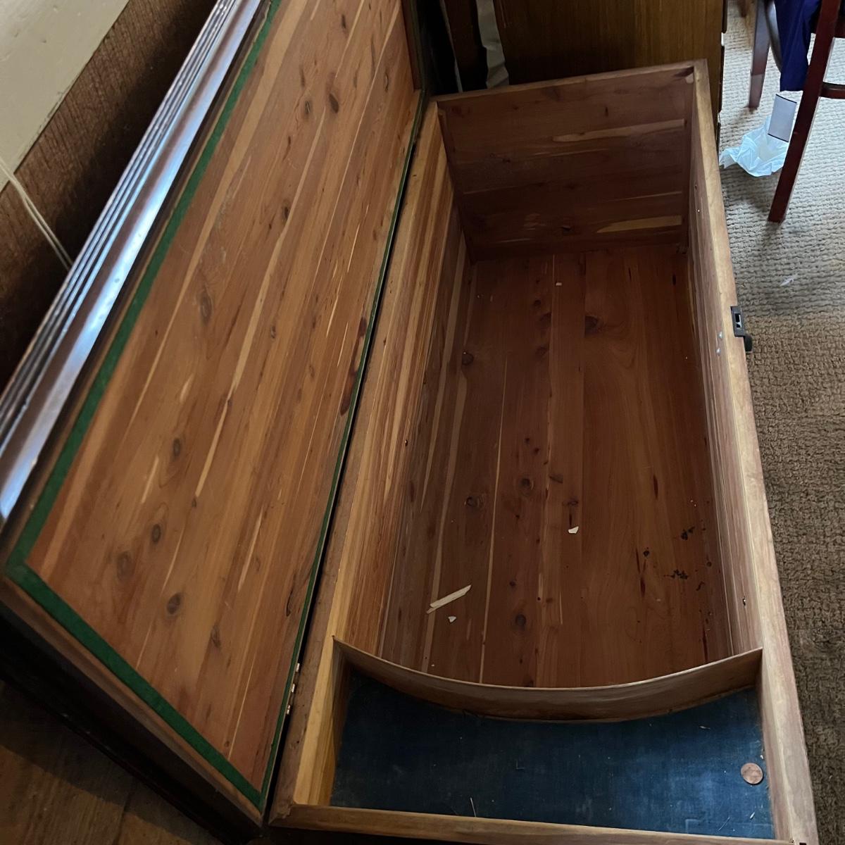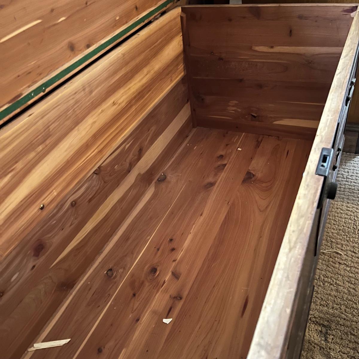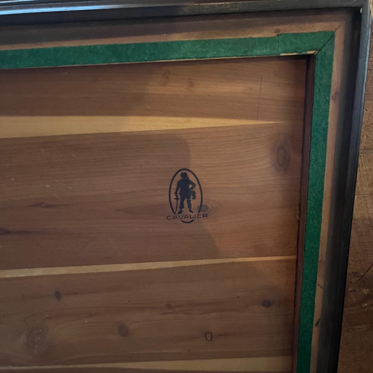 This Cavalier cedar lined chest has a small shelf in the inside corner. Chest has some scratches and nicks, see pictures. Chest measures 19” x 48” x 22”. The latch has been removed and we do not have combination.