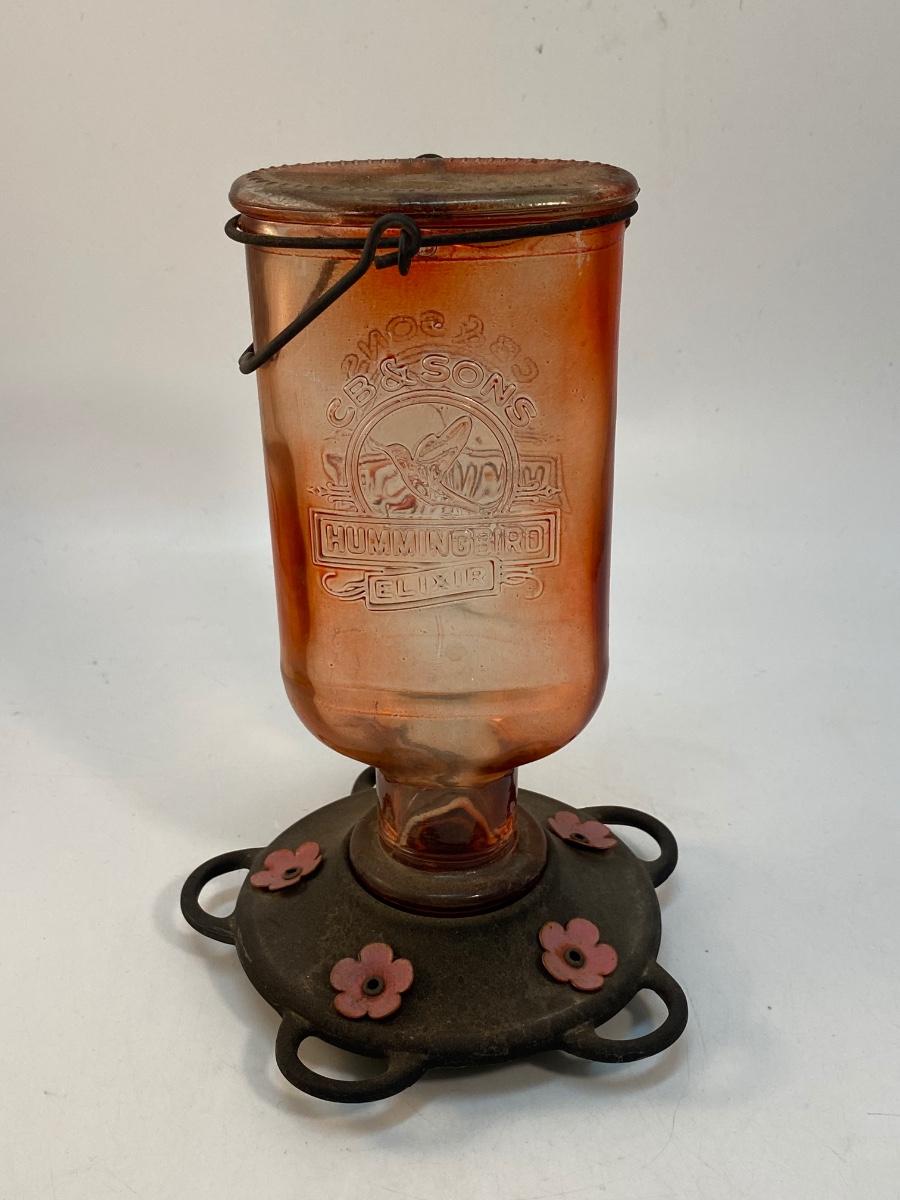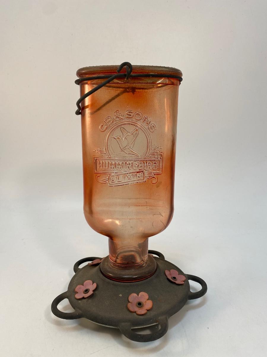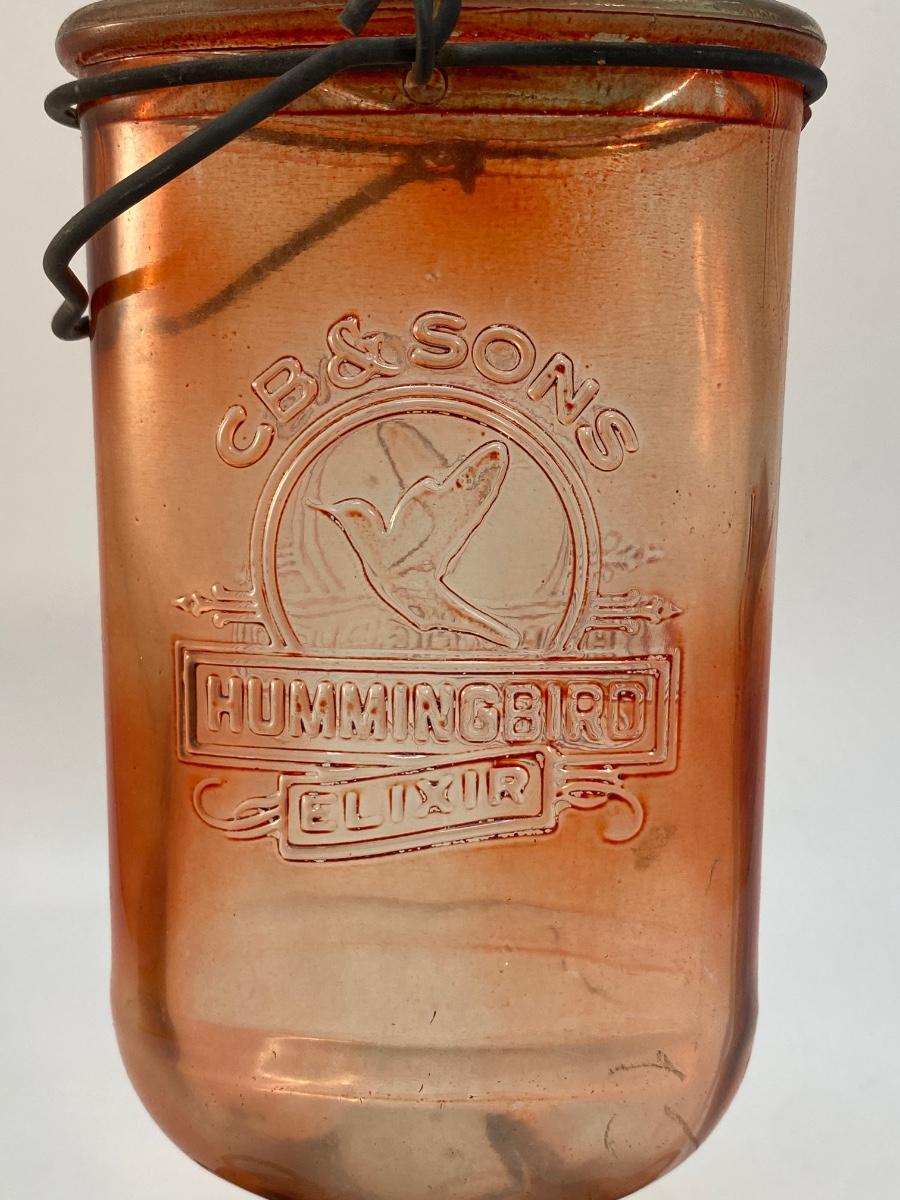 CB & Sons Hummingbird Elixir Hanging Glass Bottle Feeder. Weathered from being outside but in useable condition.