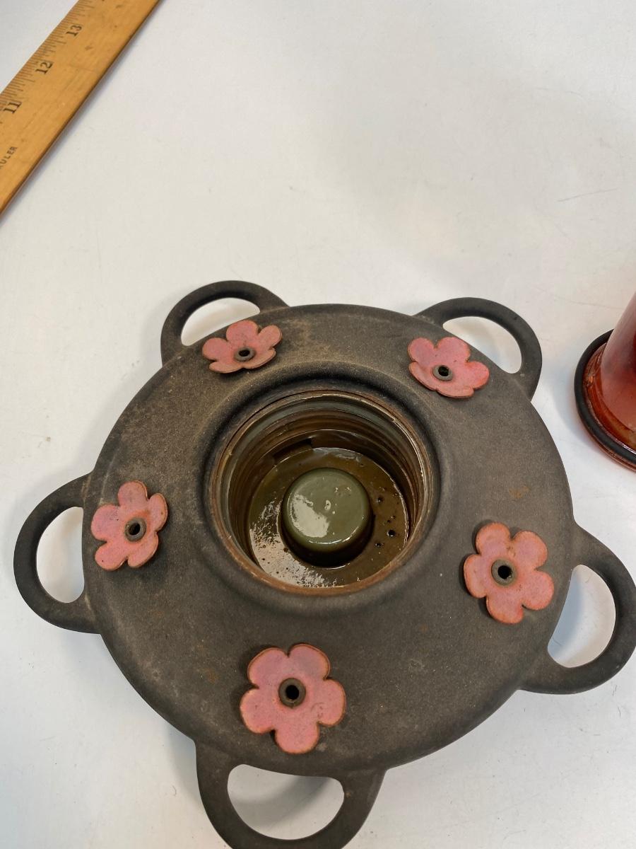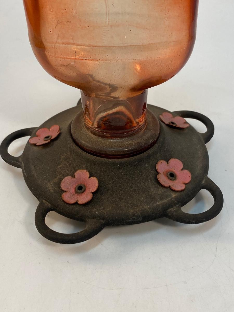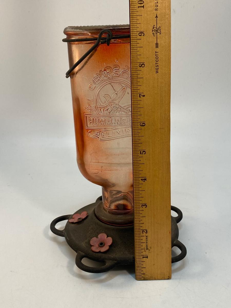CB & Sons Hummingbird Elixir Hanging Glass Bottle Feeder. Weathered from being outside but in useable condition.