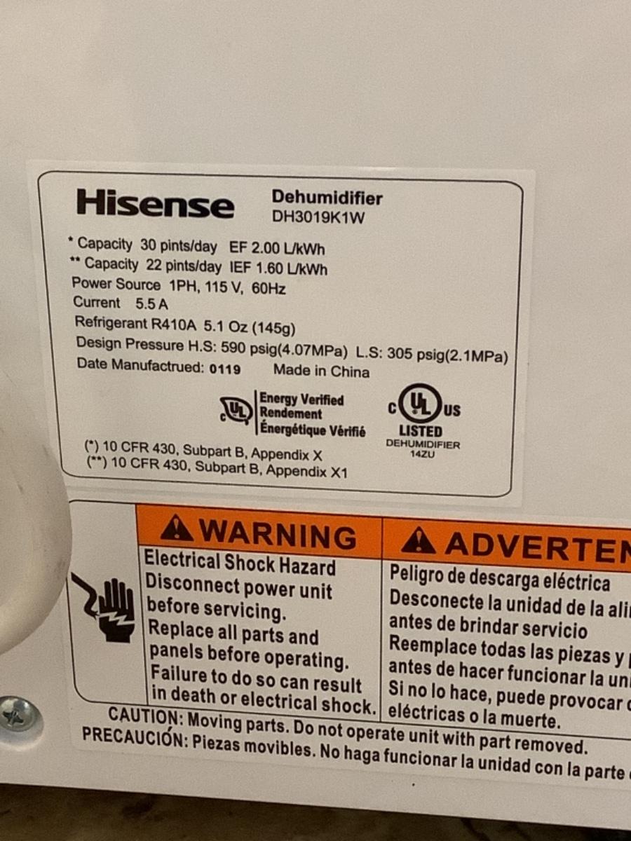 Hisense energy star 22 pint dehumidifier model number DH3019KIW
