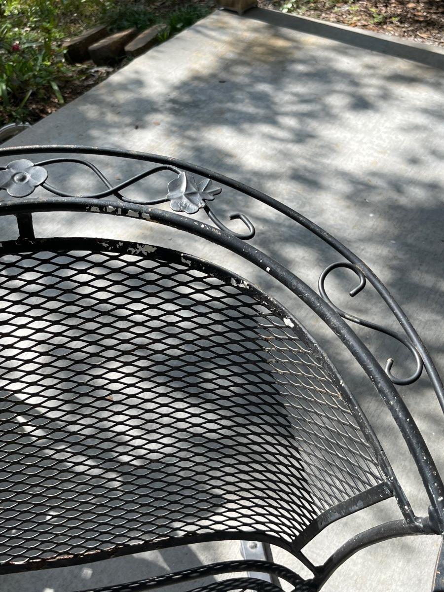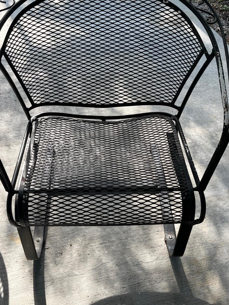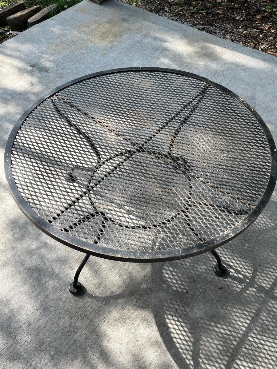 Table = 16” H x :30” round ~ Chairs = 31” H x 23” W x 27” D - porch kept ~ Some rust ~ paint chipping