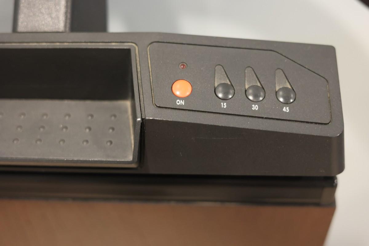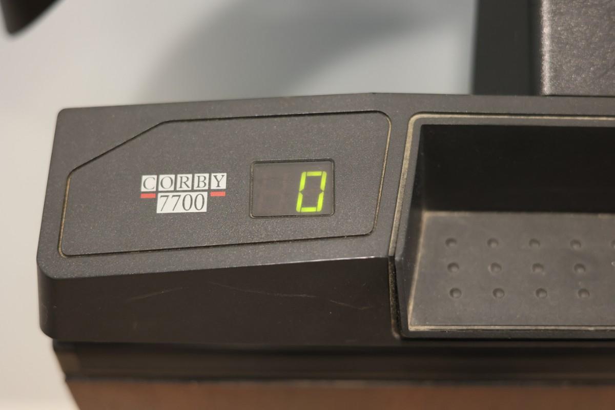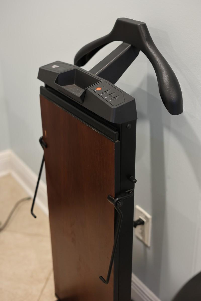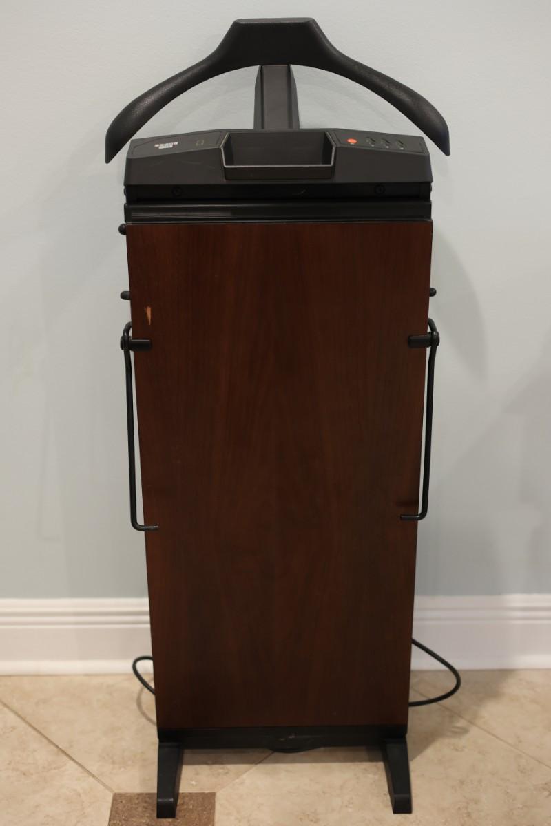 Corby Model 7700 pants press with wood cabinet and digital control panel. Designed for pressing trousers using heat and pressure, commonly used in hotels. Unit powers on and display lights up as shown.