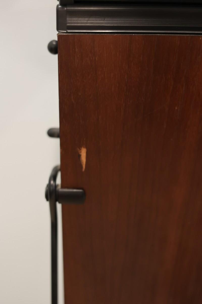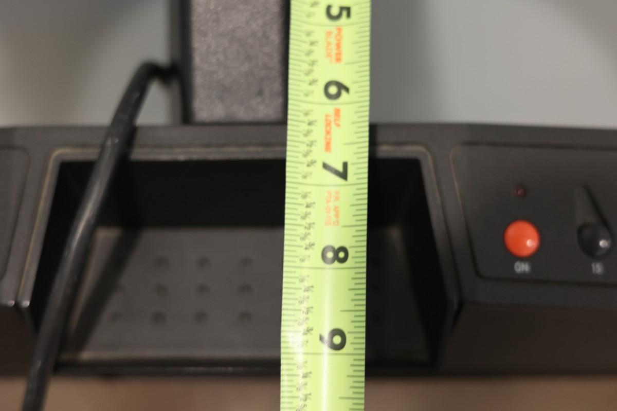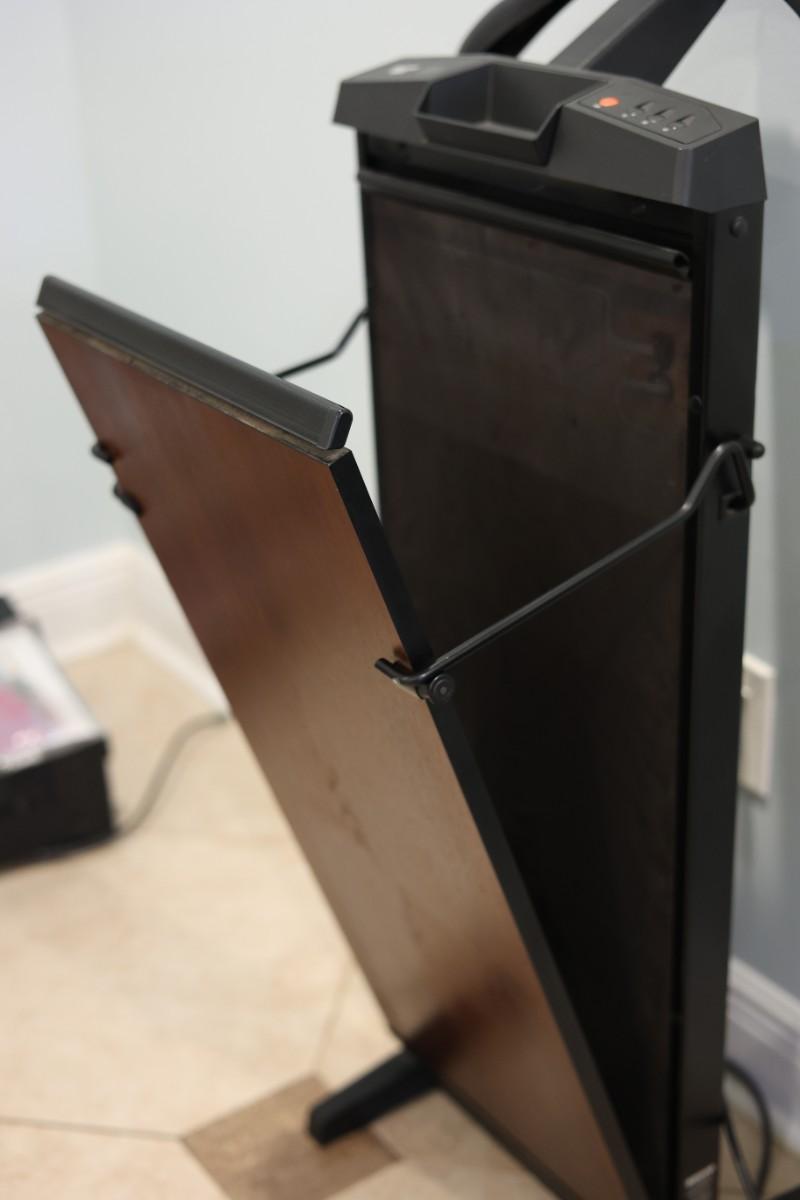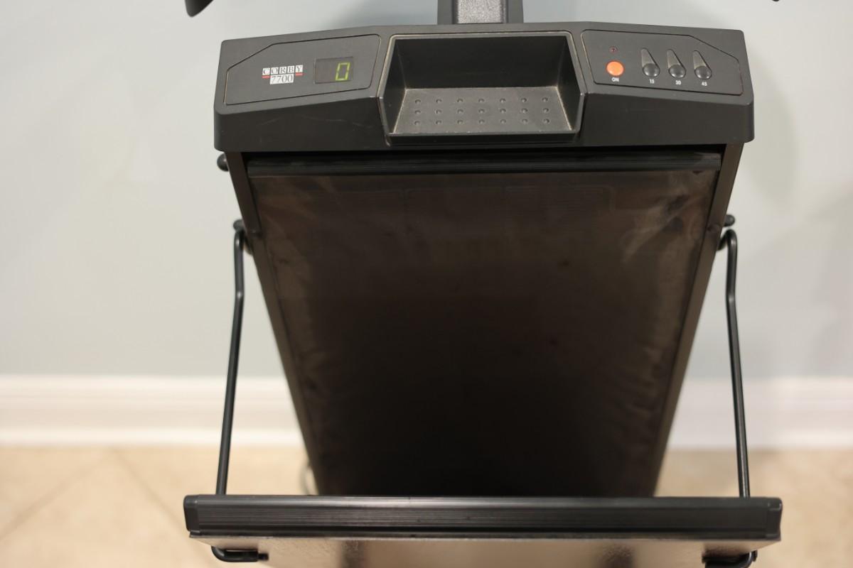 Corby Model 7700 pants press with wood cabinet and digital control panel. Designed for pressing trousers using heat and pressure, commonly used in hotels. Unit powers on and display lights up as shown.
