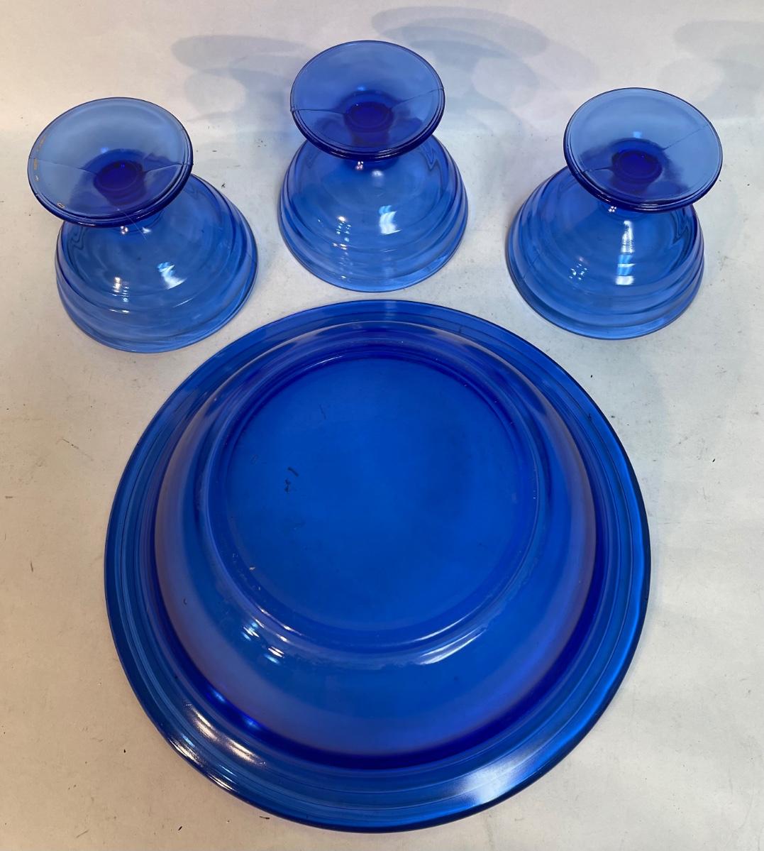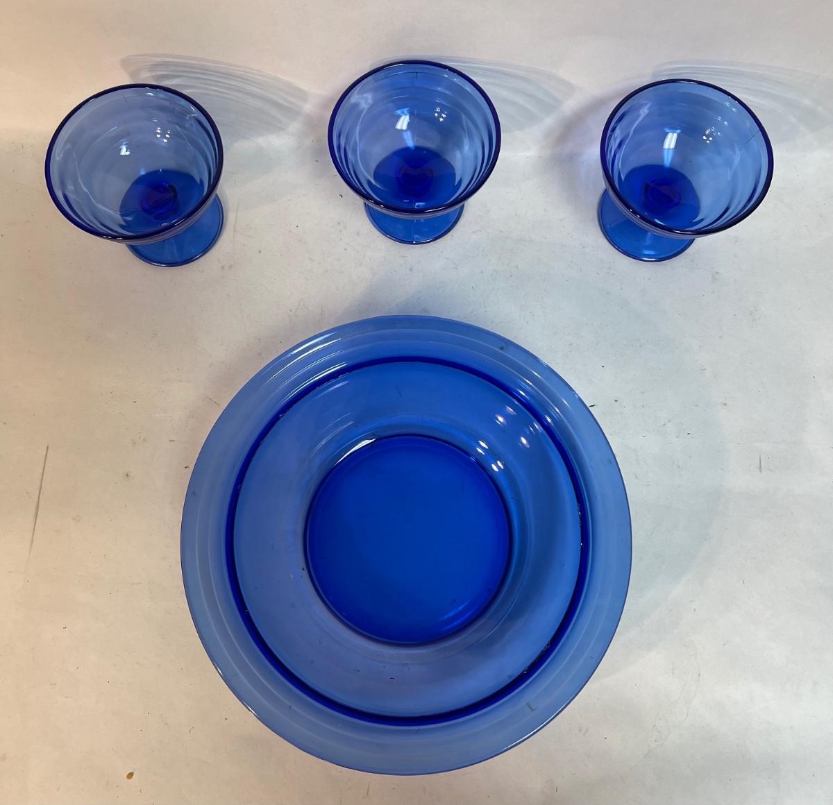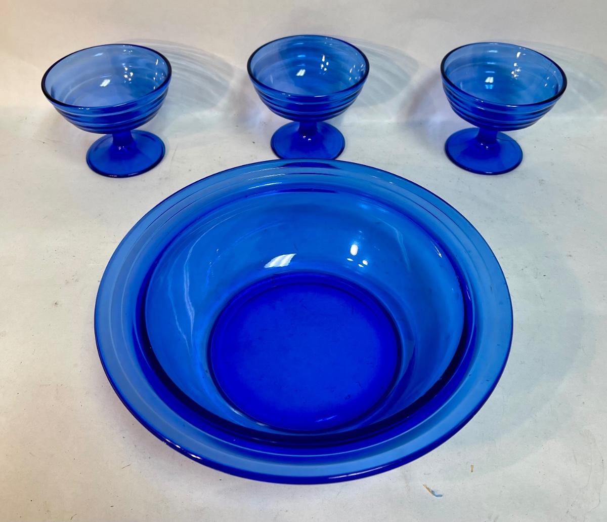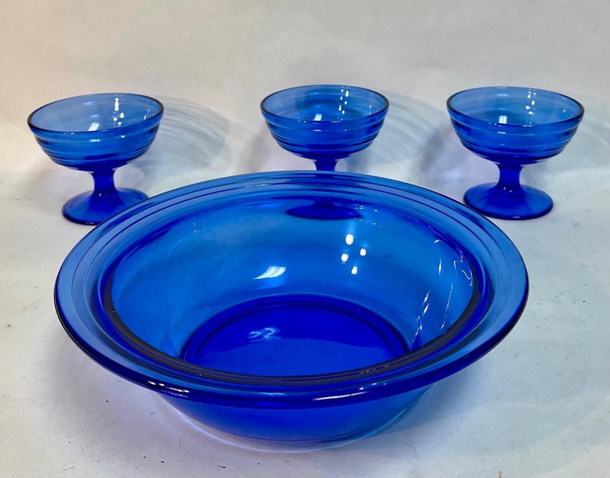 Hazel Atlas Cobalt Blue Moderntone 1940's Depression Glass Berry Bowl with 3 dessert cups