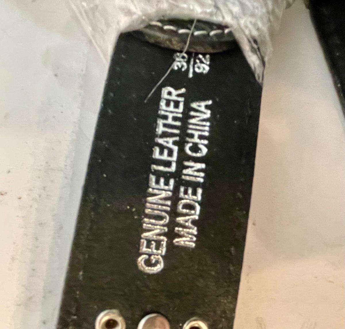 Leather, made in China. In new condition.