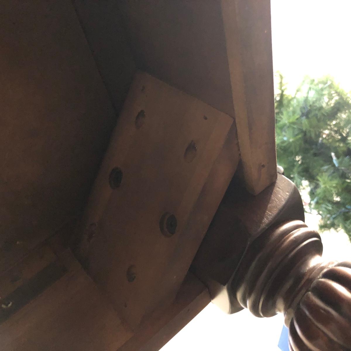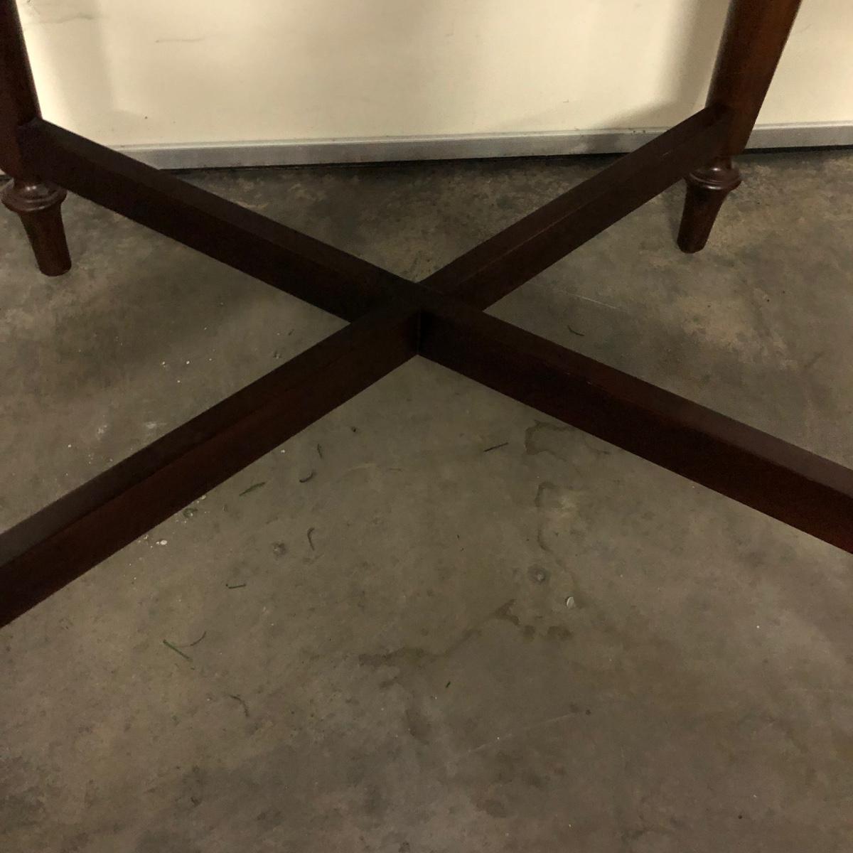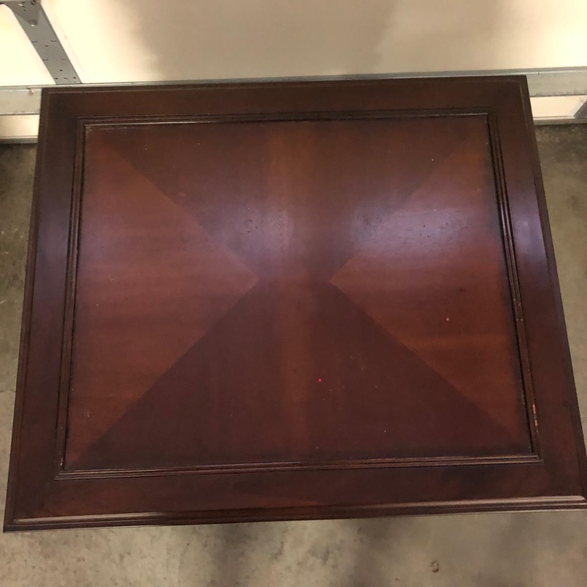 This solid wood table is stained dark brown and has carved details. The surface of the table has an intersection of different grains of wood that come together in the center. Table measures 24” x 28” x 27.5”. Local pickup only.