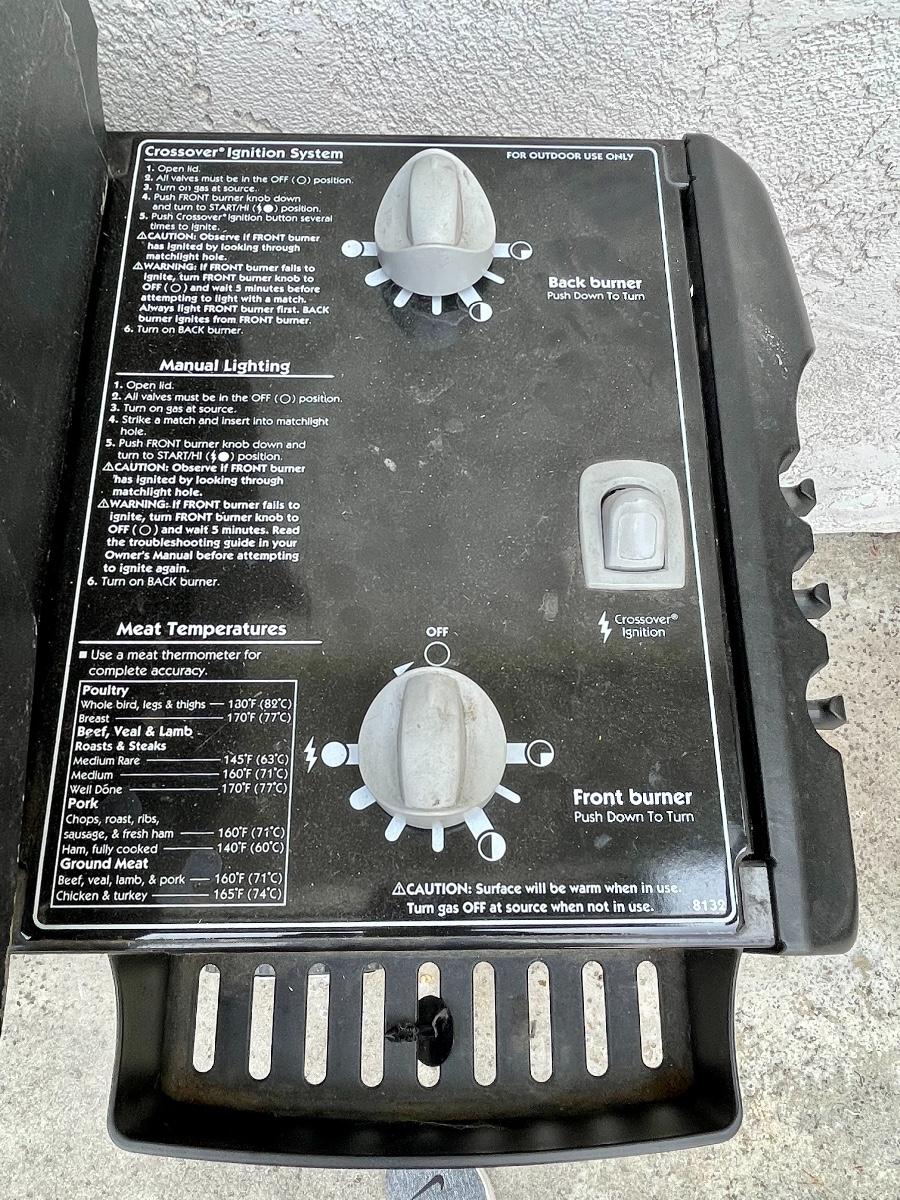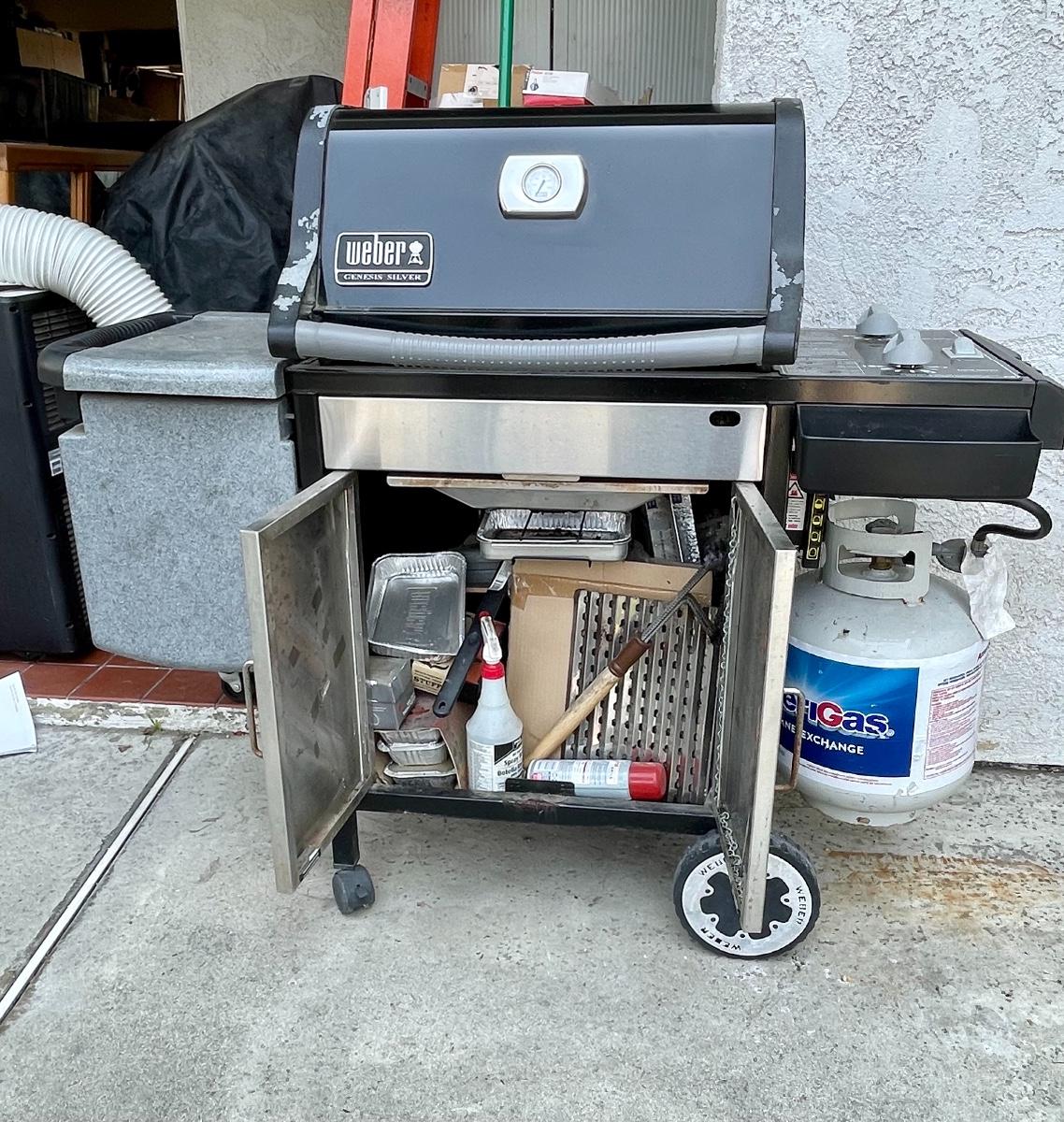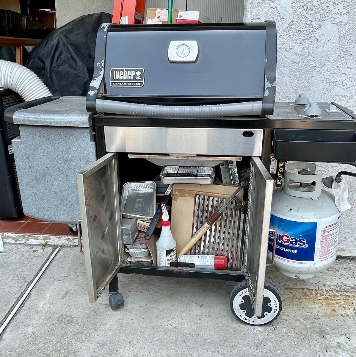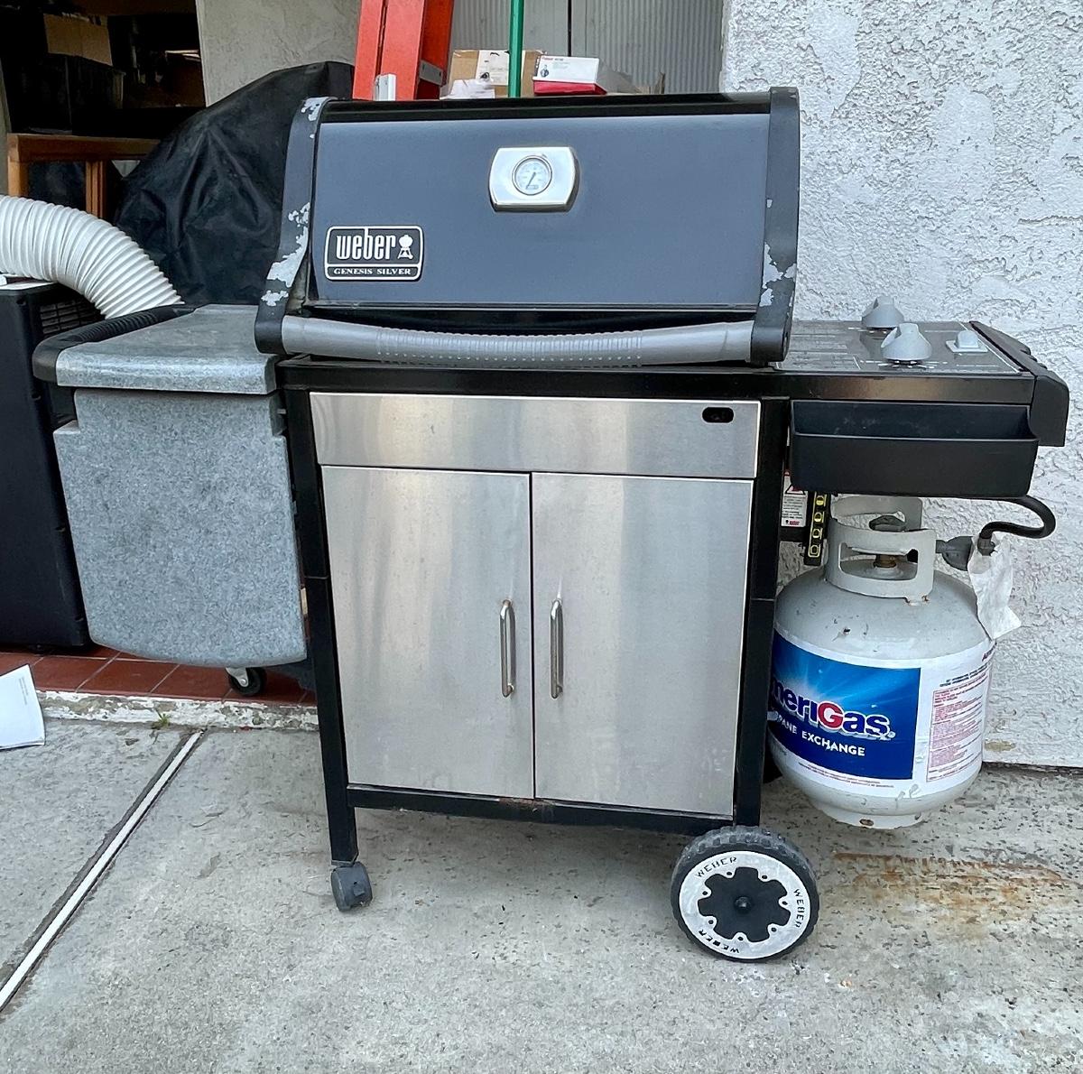 Weber Propane BBQ Grill with Accessories. Two burners that run the length of grill. Comes with all accessories photo'd including propane tank. Good used condition.