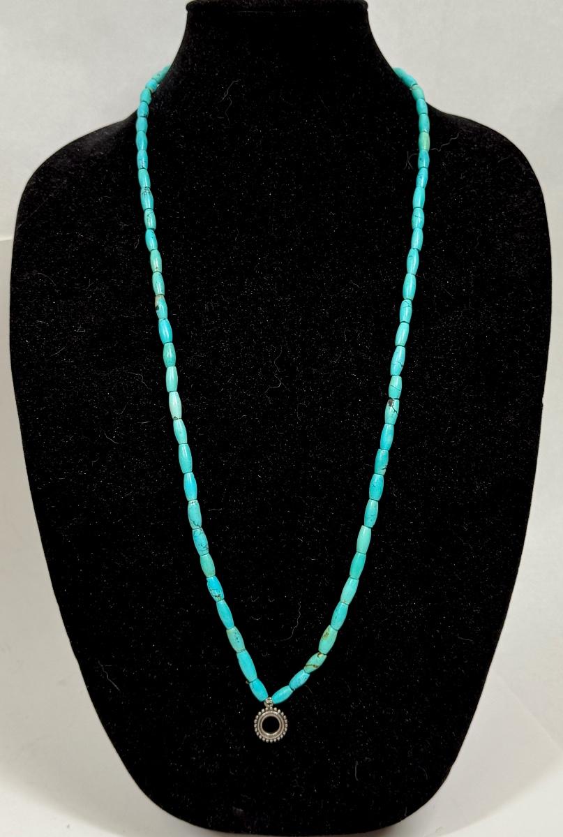 Approx. 30" long. silver-tone disk pendant. Good condition.