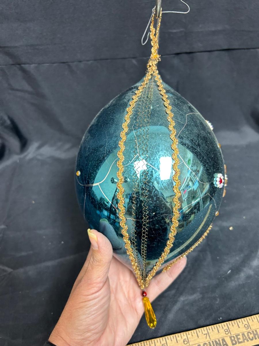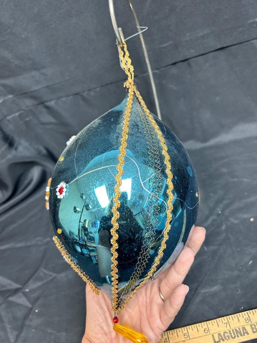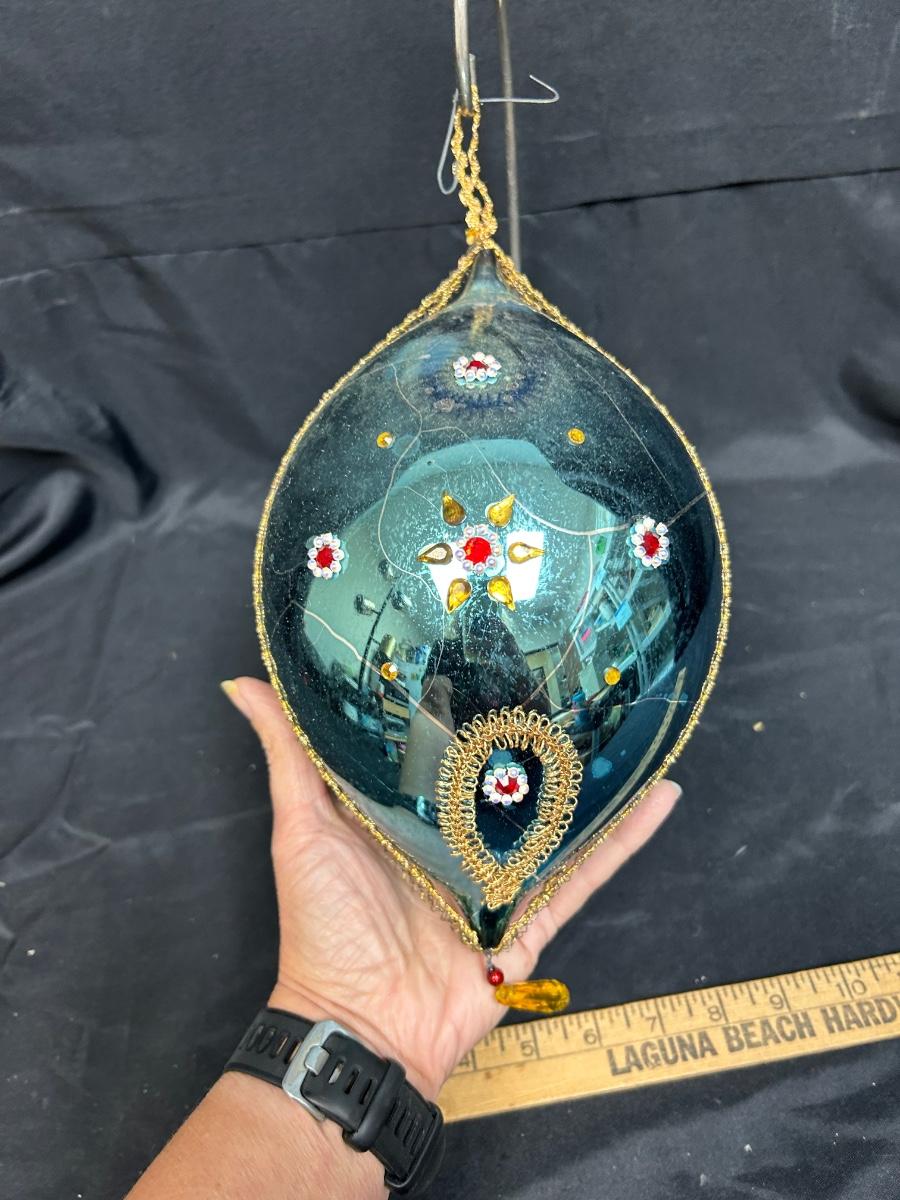 Extra Large Vintage Teal Blue Blown Glass Holiday Christmas Tree Ornament with Appliques and Wire