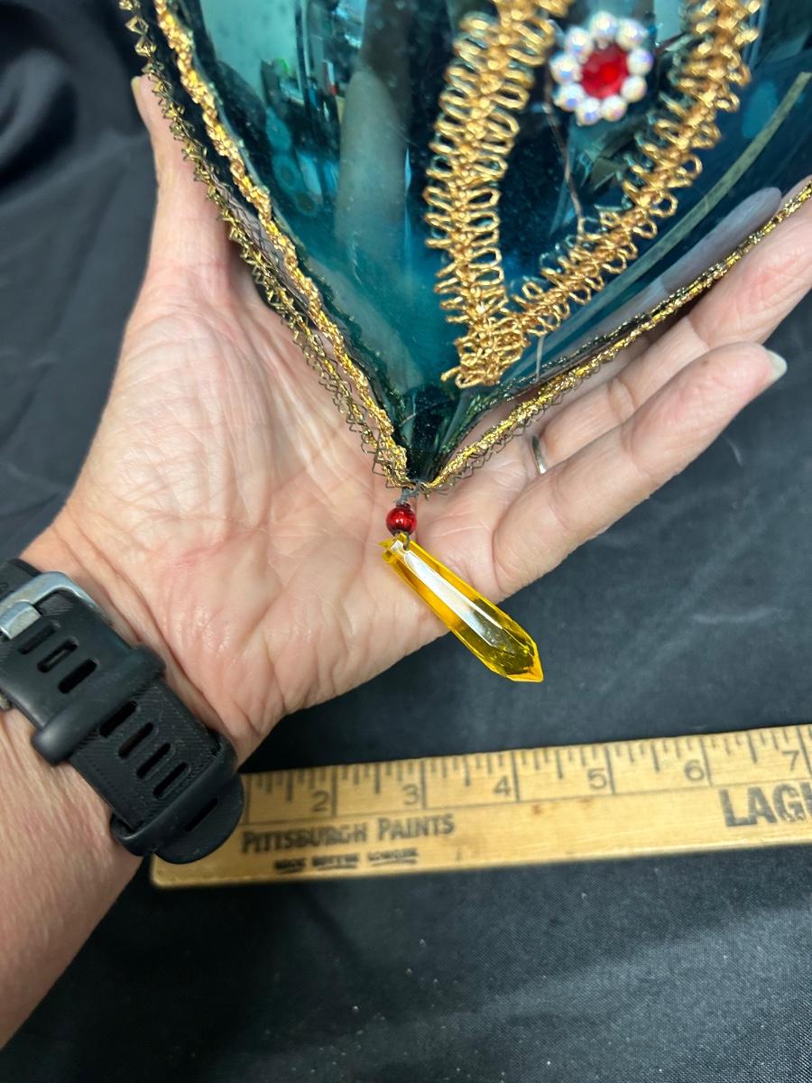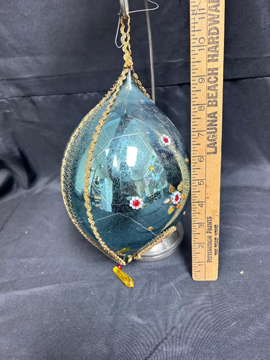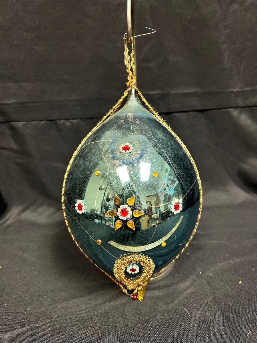 Extra Large Vintage Teal Blue Blown Glass Holiday Christmas Tree Ornament with Appliques and Wire