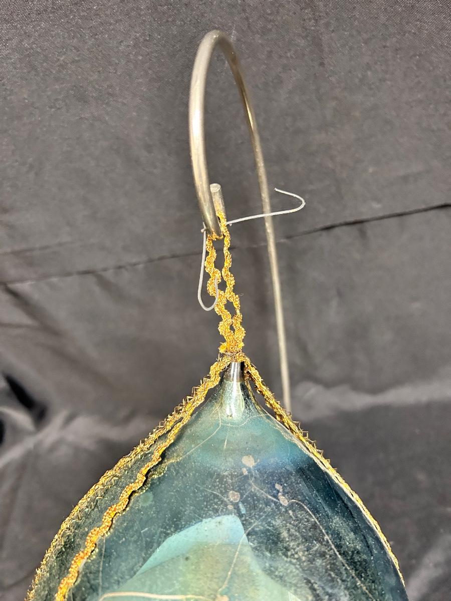 Extra Large Vintage Teal Blue Blown Glass Holiday Christmas Tree Ornament with Appliques and Wire. In vintage condition. The color is cracking but the glass is not. Some of the appliques have fallen off. About 9" size.