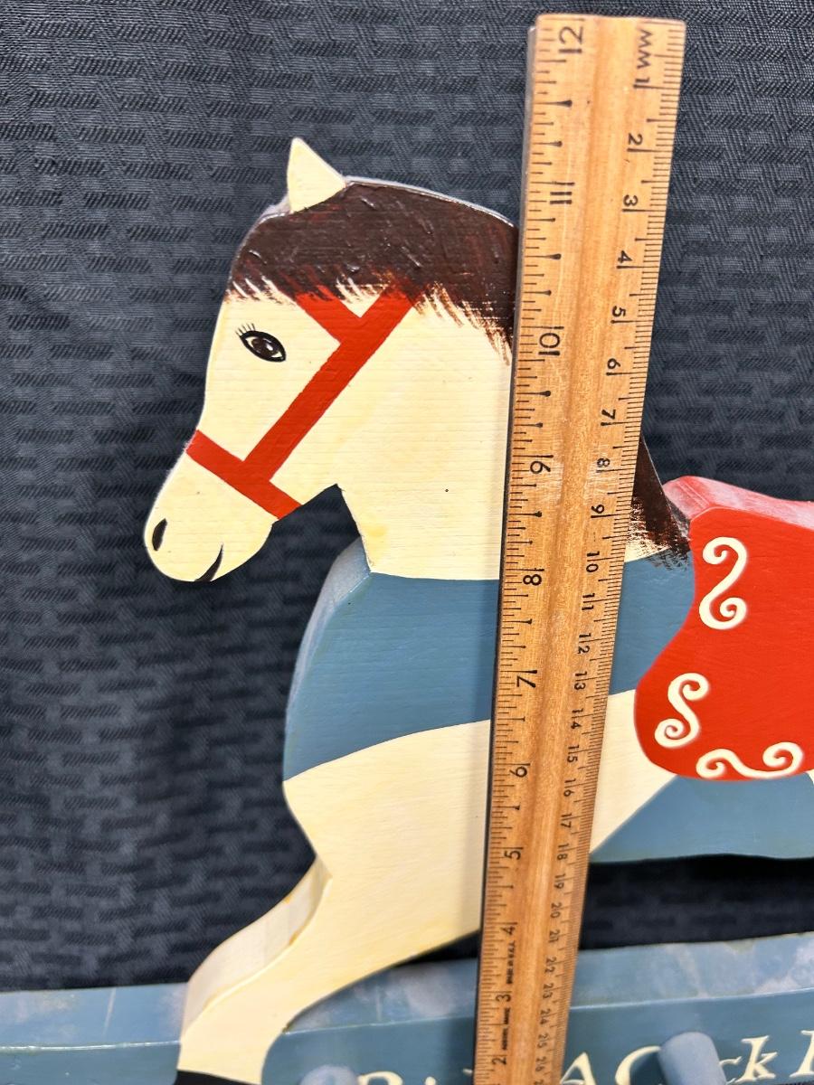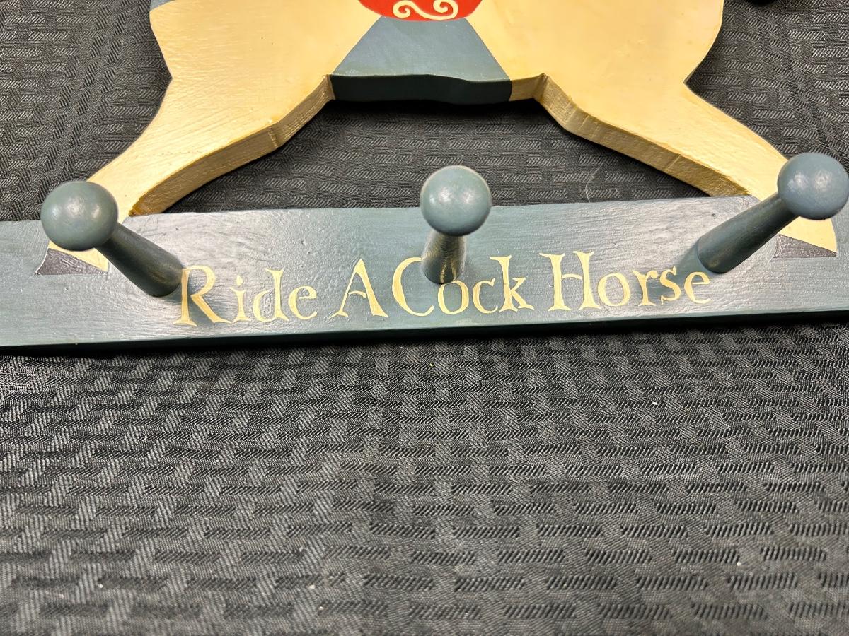 Hand Crafted Folk Art Hanging Peg Hat Coat Holder Ride a Cock Horse Nursery Rhyme. In vintage condition, a little dusty from storage.