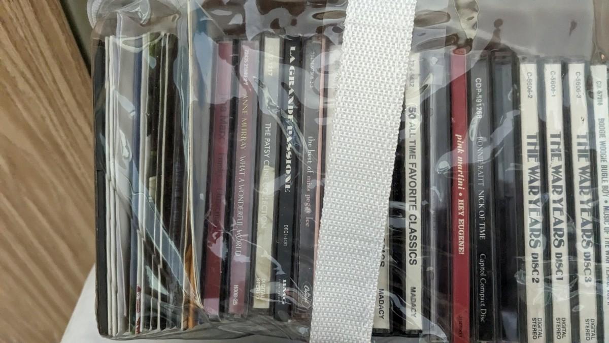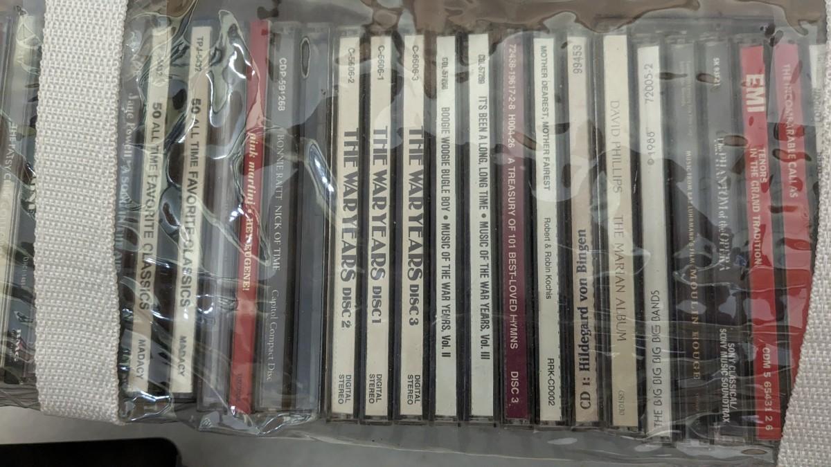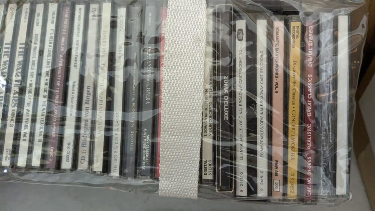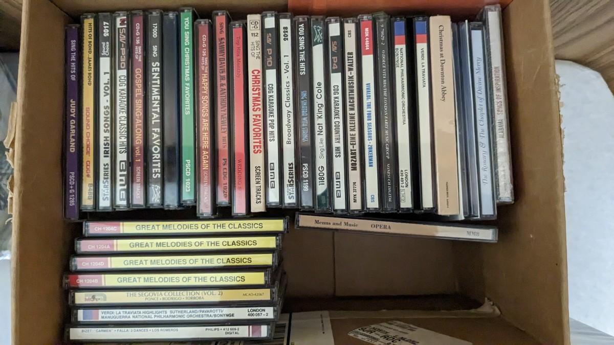 a varied assortment of classical, showtune, religious, country western, books, and pop culture CD's from varied years. This is absolutely the most eclectic variety of media. WOW! bdrm2