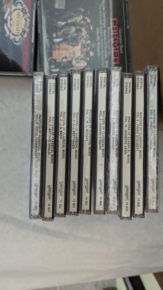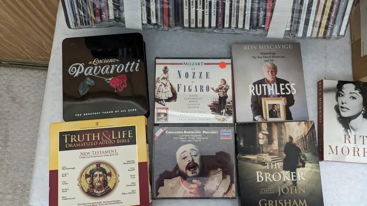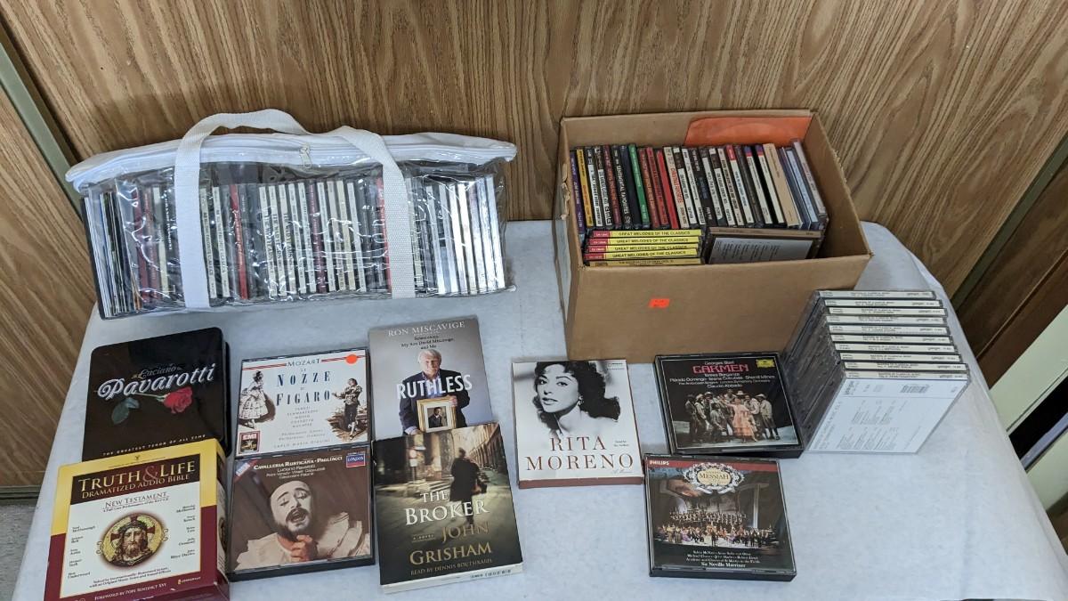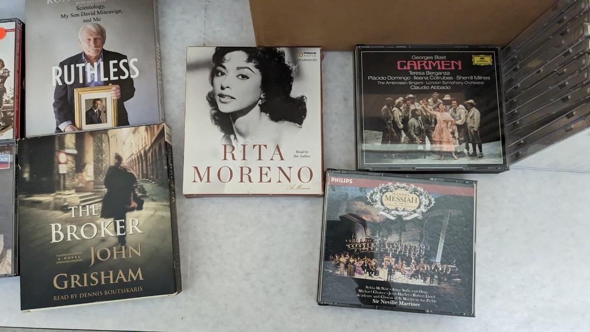 a varied assortment of classical, showtune, religious, country western, books, and pop culture CD's from varied years. This is absolutely the most eclectic variety of media. WOW! bdrm2