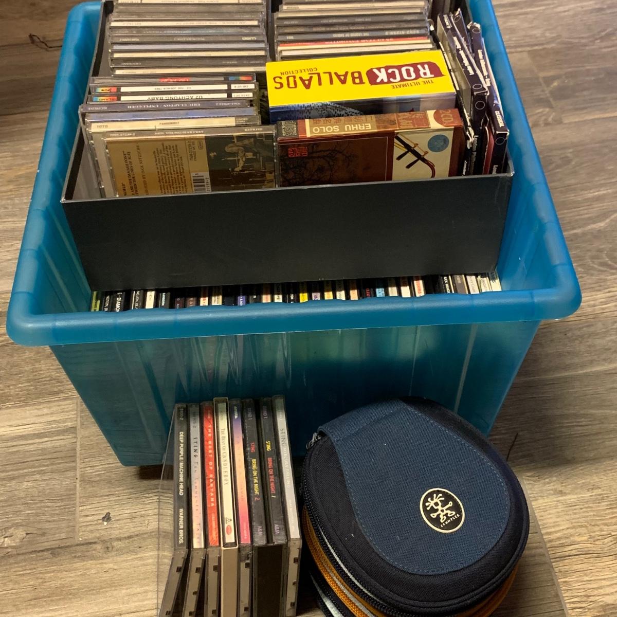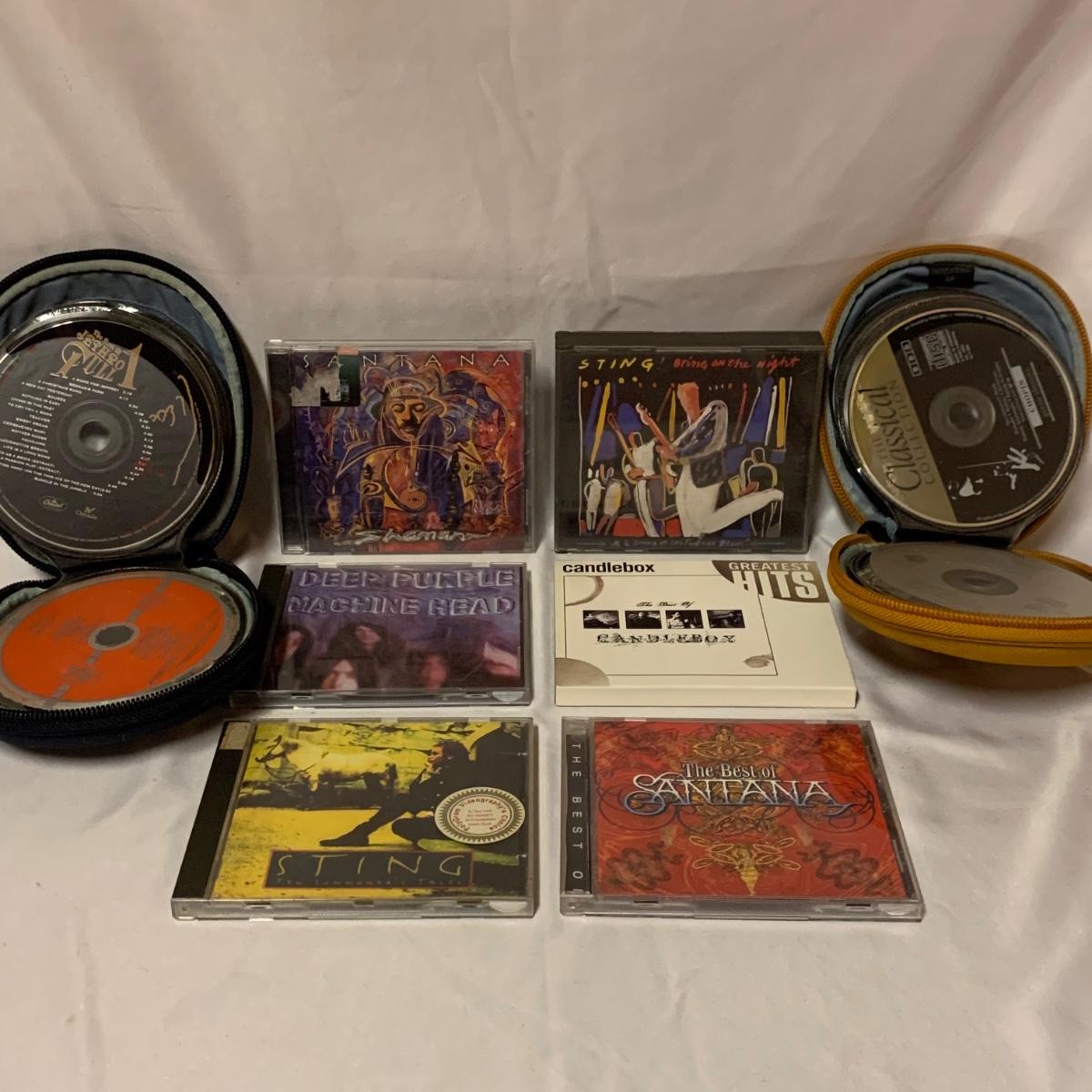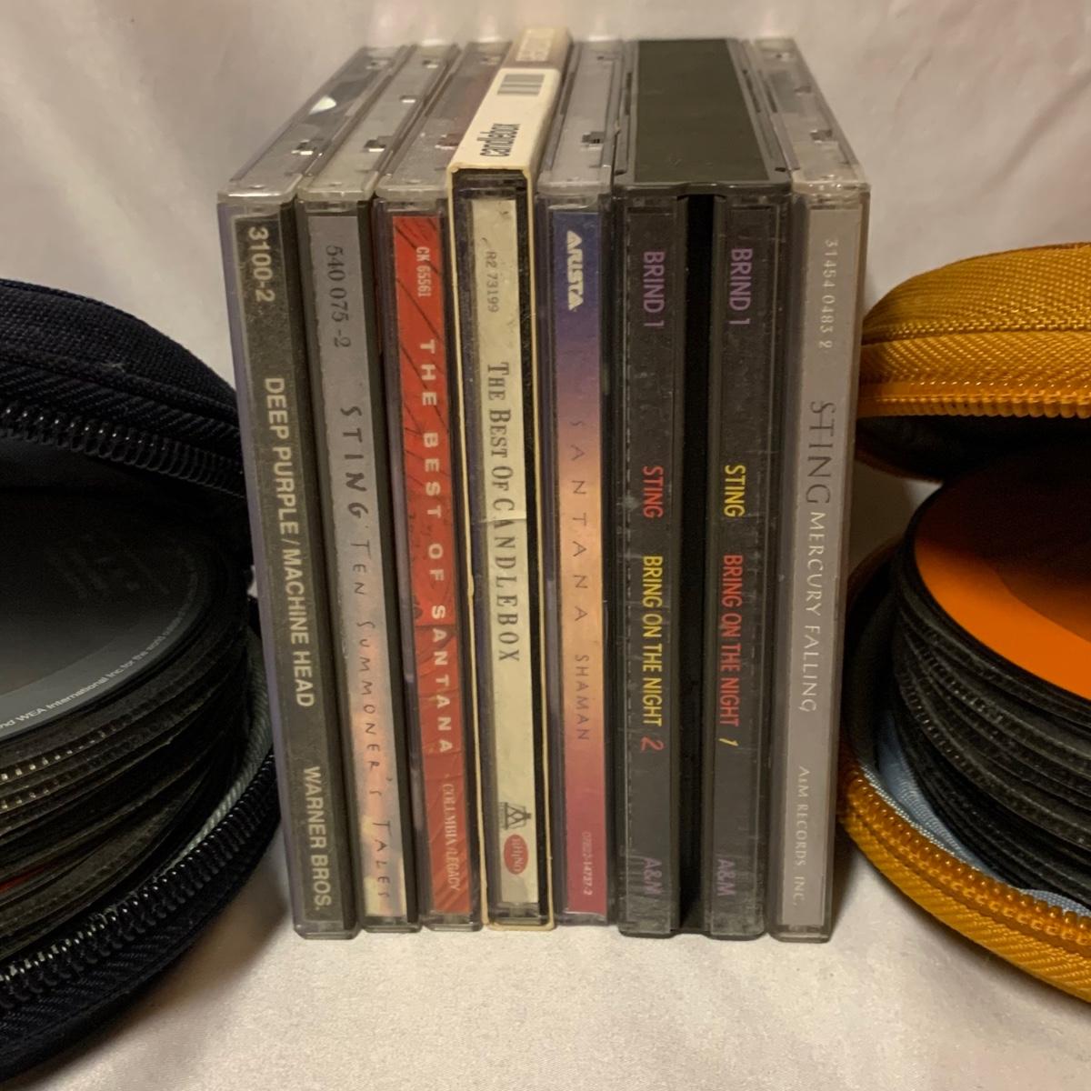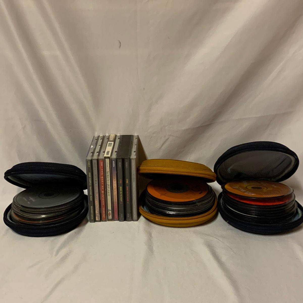 75+ CDs! The majority are in the three Crumpler brand CD cases, and 8 are in their original jewel cases. There is a huge variety of music, including: Eric Clapton, Santana, Jimi Hendrix, Sting, Dire Straits, Toto, Tears for Fears, George Winston, U2, Neil Young, Hiroshima, Chinese classical music, and much more. There are also two boxes of empty CD jewel cases included, that likely belong to the discs in the Crumpler cases. Some discs show wear, but most appear to be in good condition.