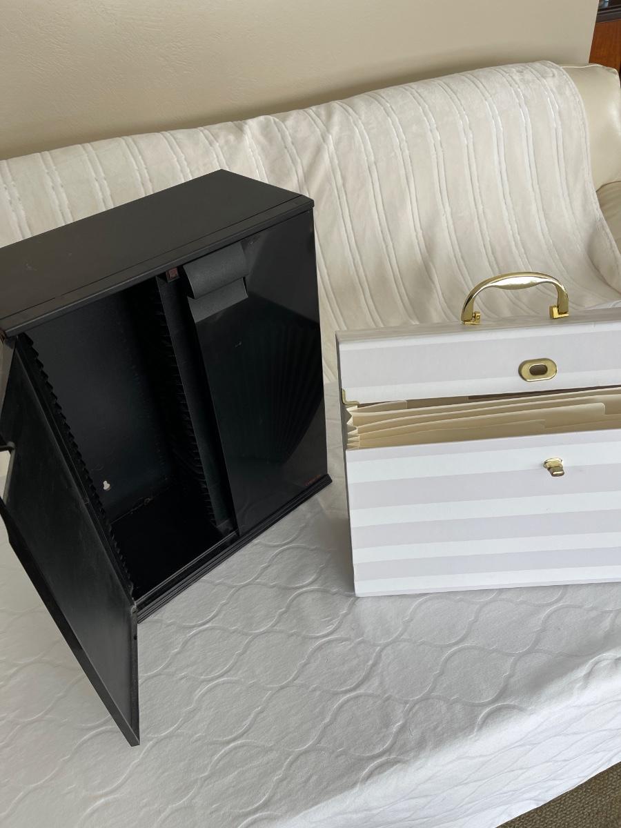 Plastic CD holder and white file organizer