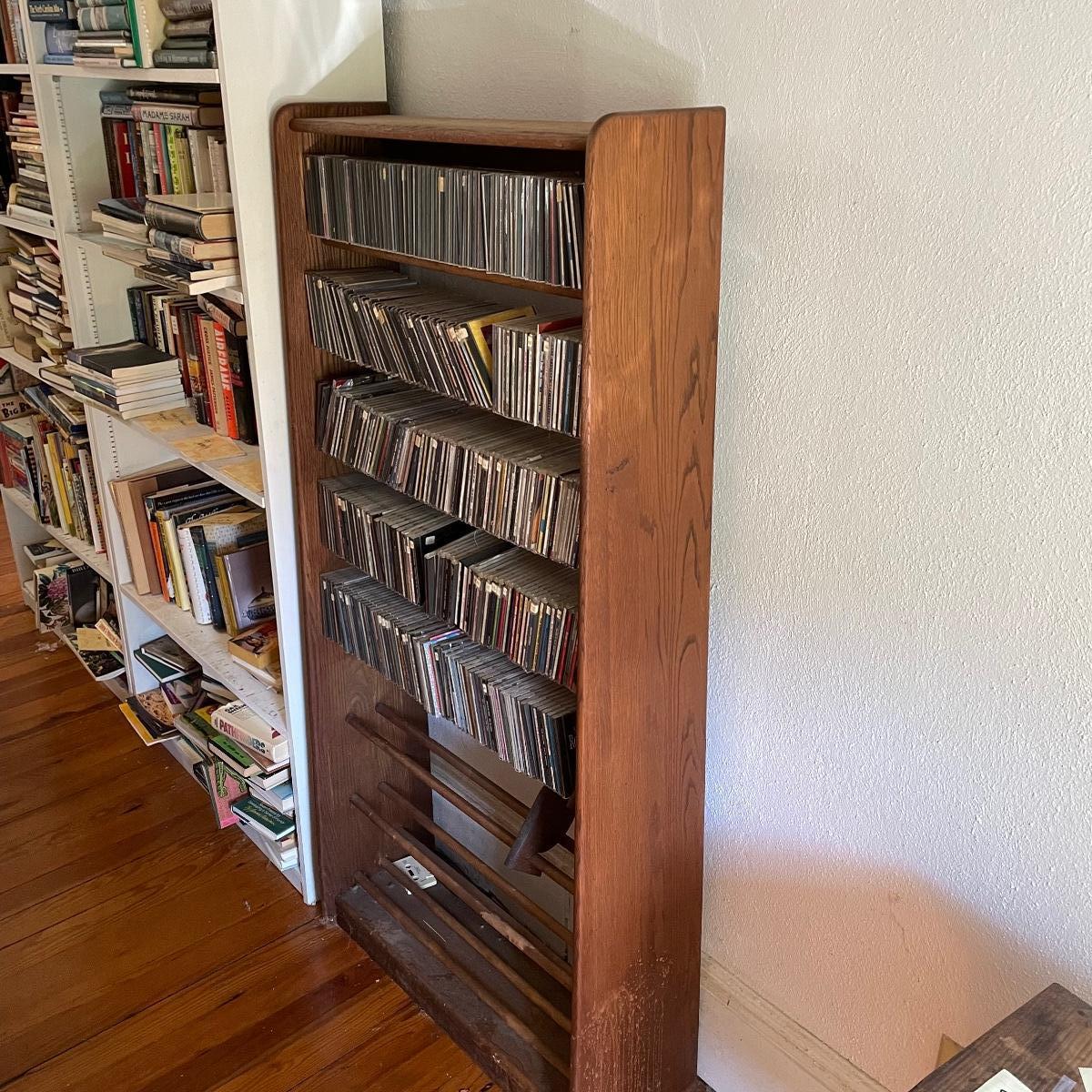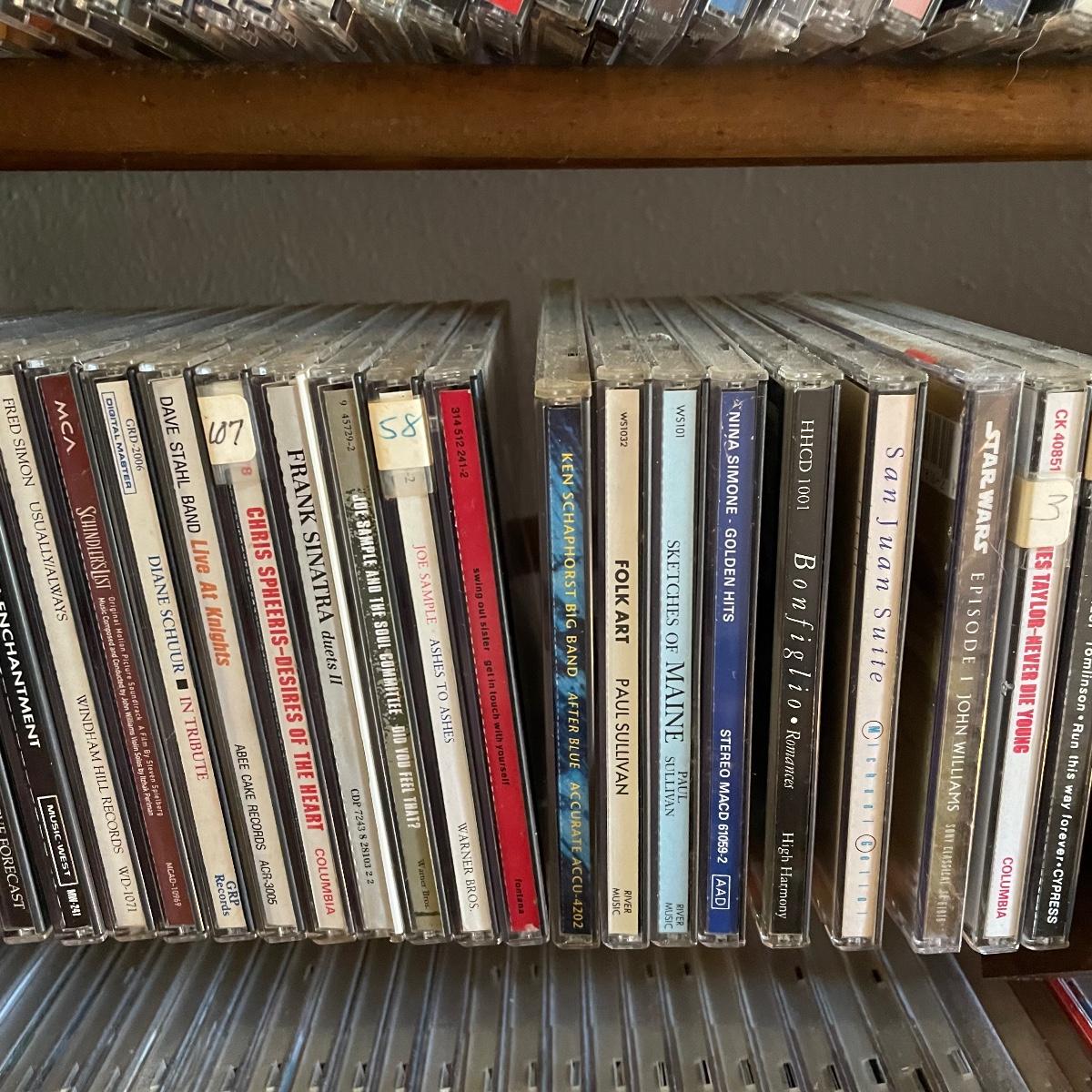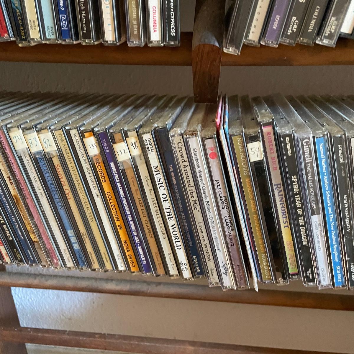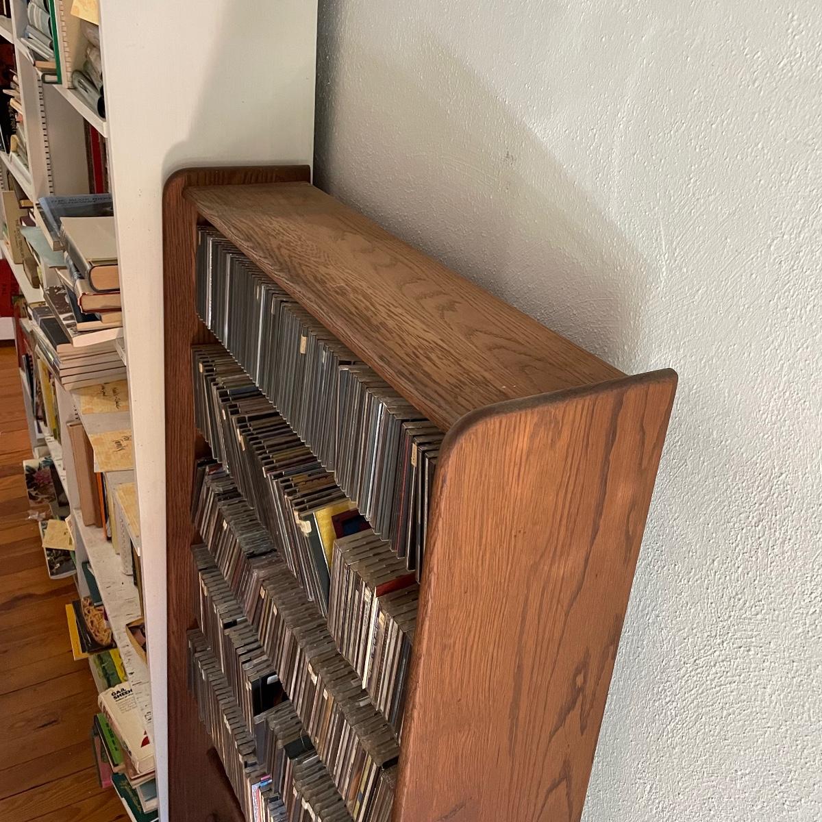This good looking wood CD holder measures 30” x 9” x 61”. It is currently holding approximately 250 (we have not verified the contents of all of these), so altogether it could hold around 400. Includes artists James Taylor, Frank Sinatra, Booker T. Jones,Chet Atkins and many more.