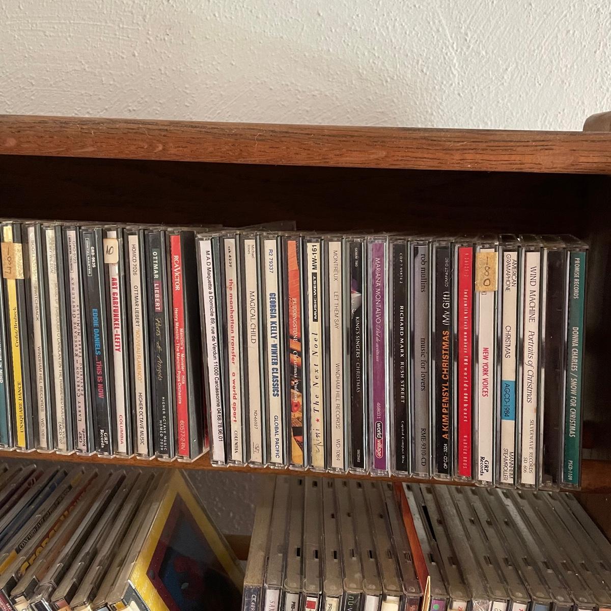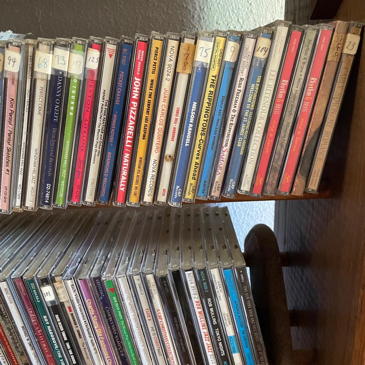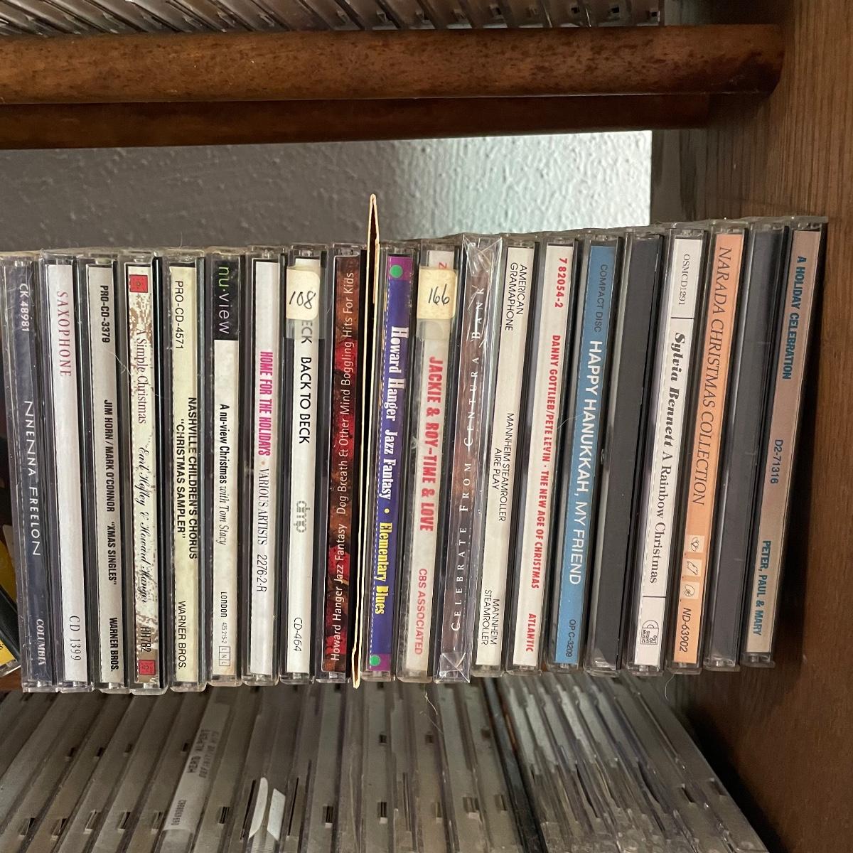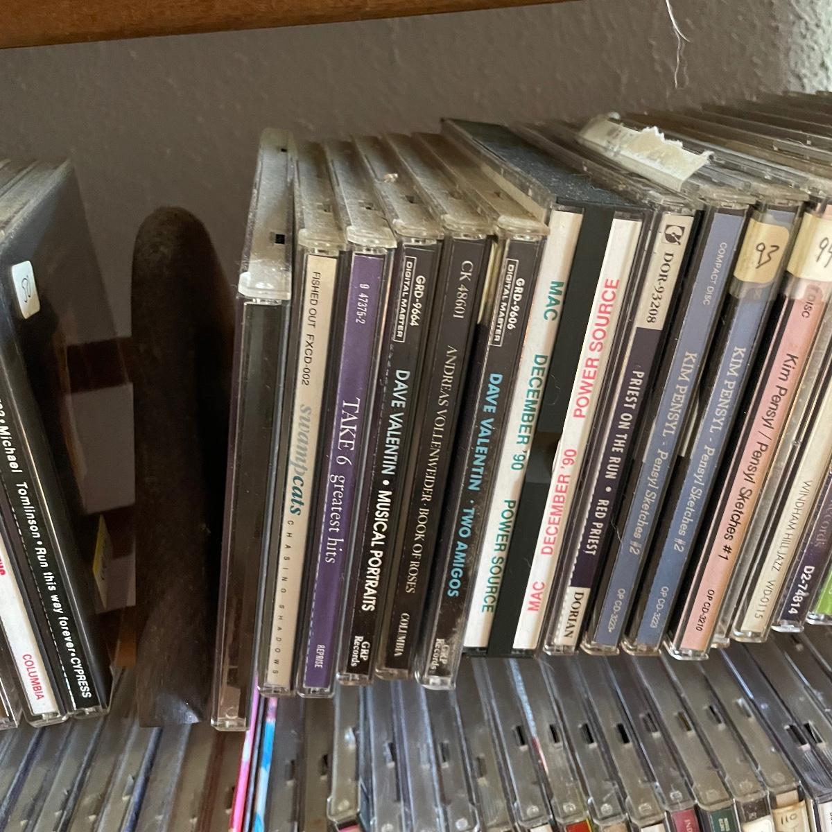 This good looking wood CD holder measures 30” x 9” x 61”. It is currently holding approximately 250 (we have not verified the contents of all of these), so altogether it could hold around 400. Includes artists James Taylor, Frank Sinatra, Booker T. Jones,Chet Atkins and many more.