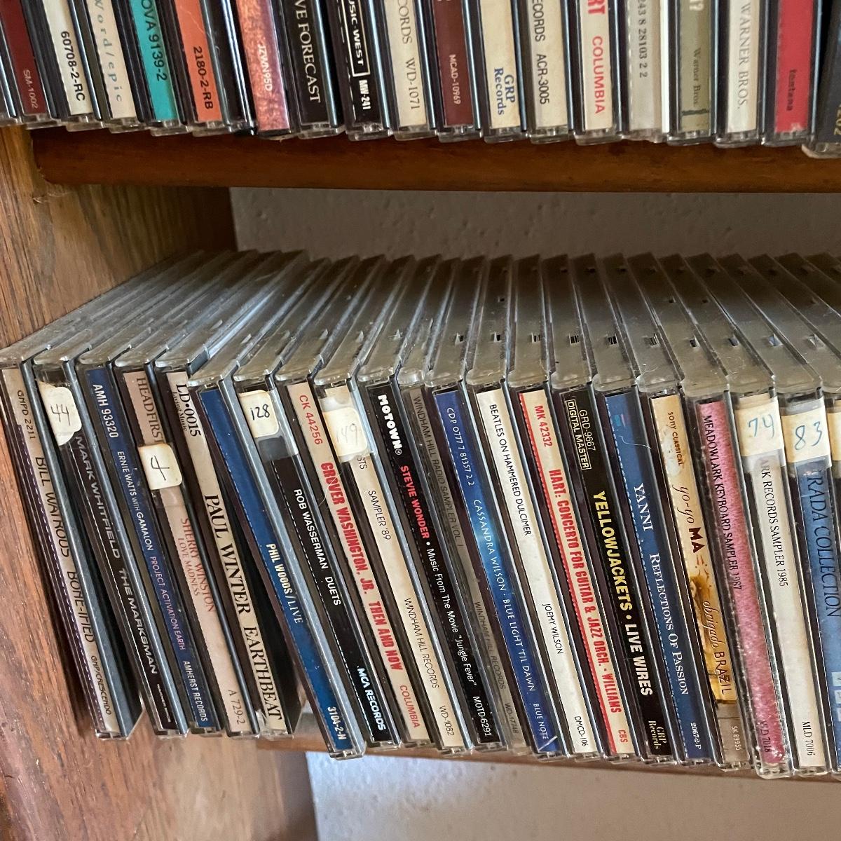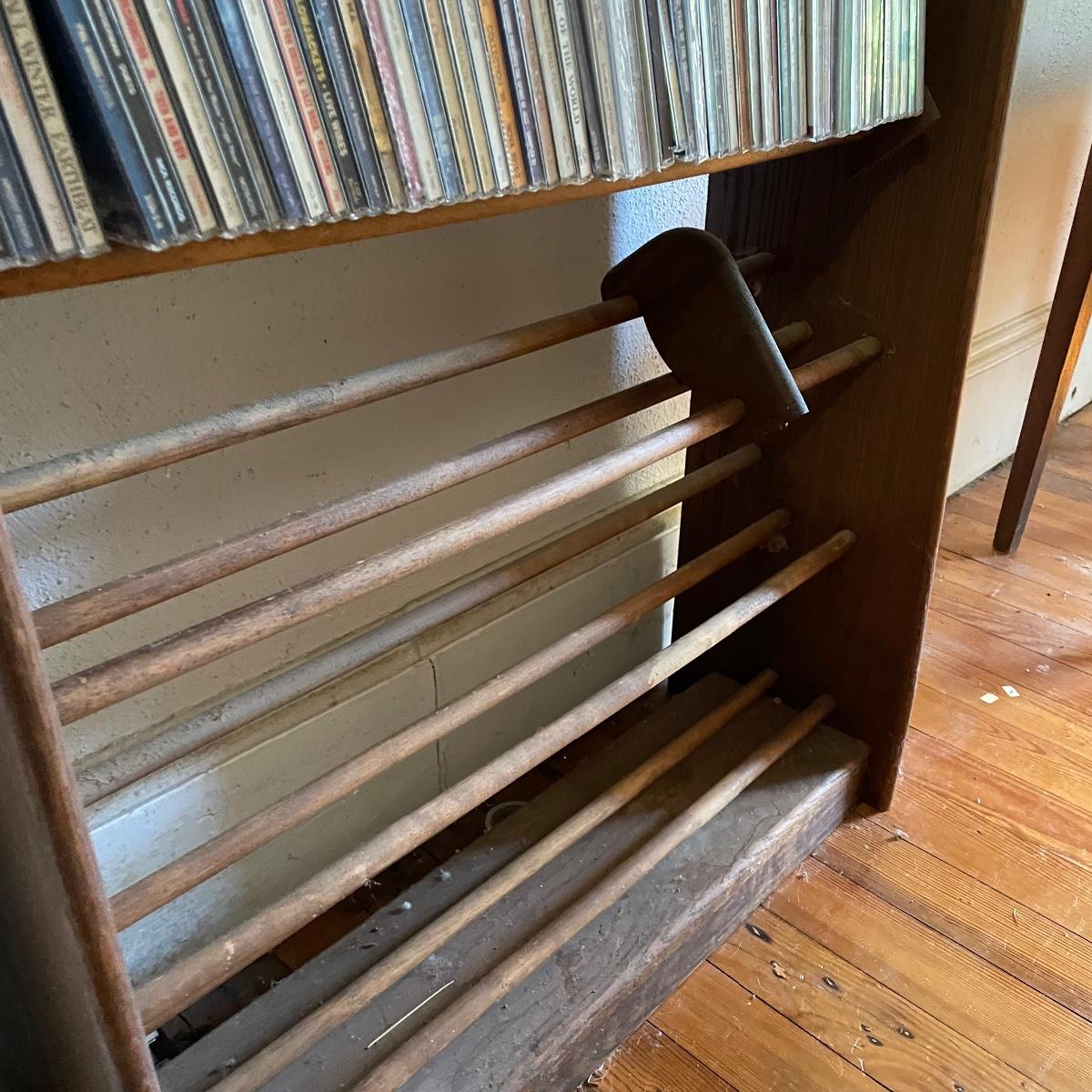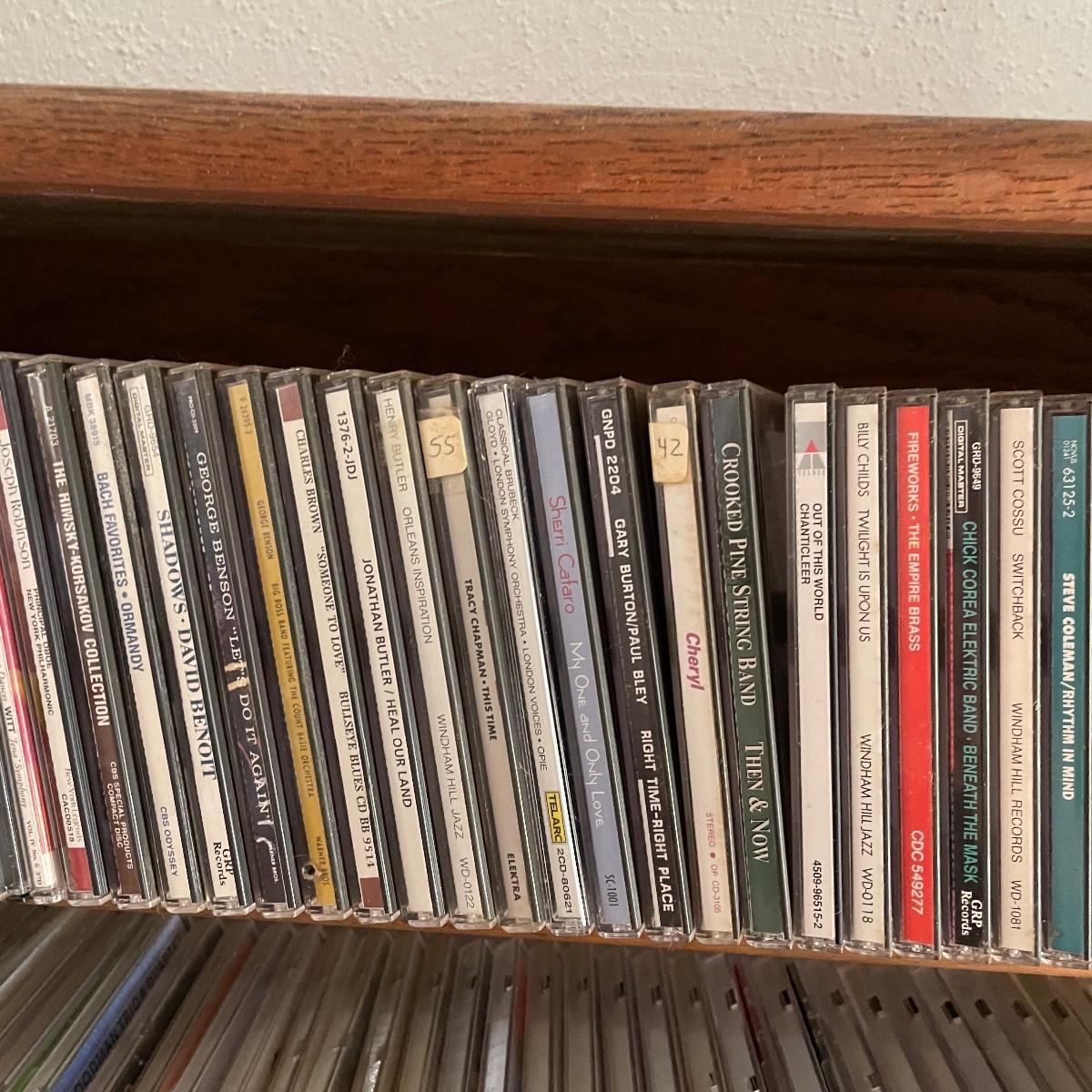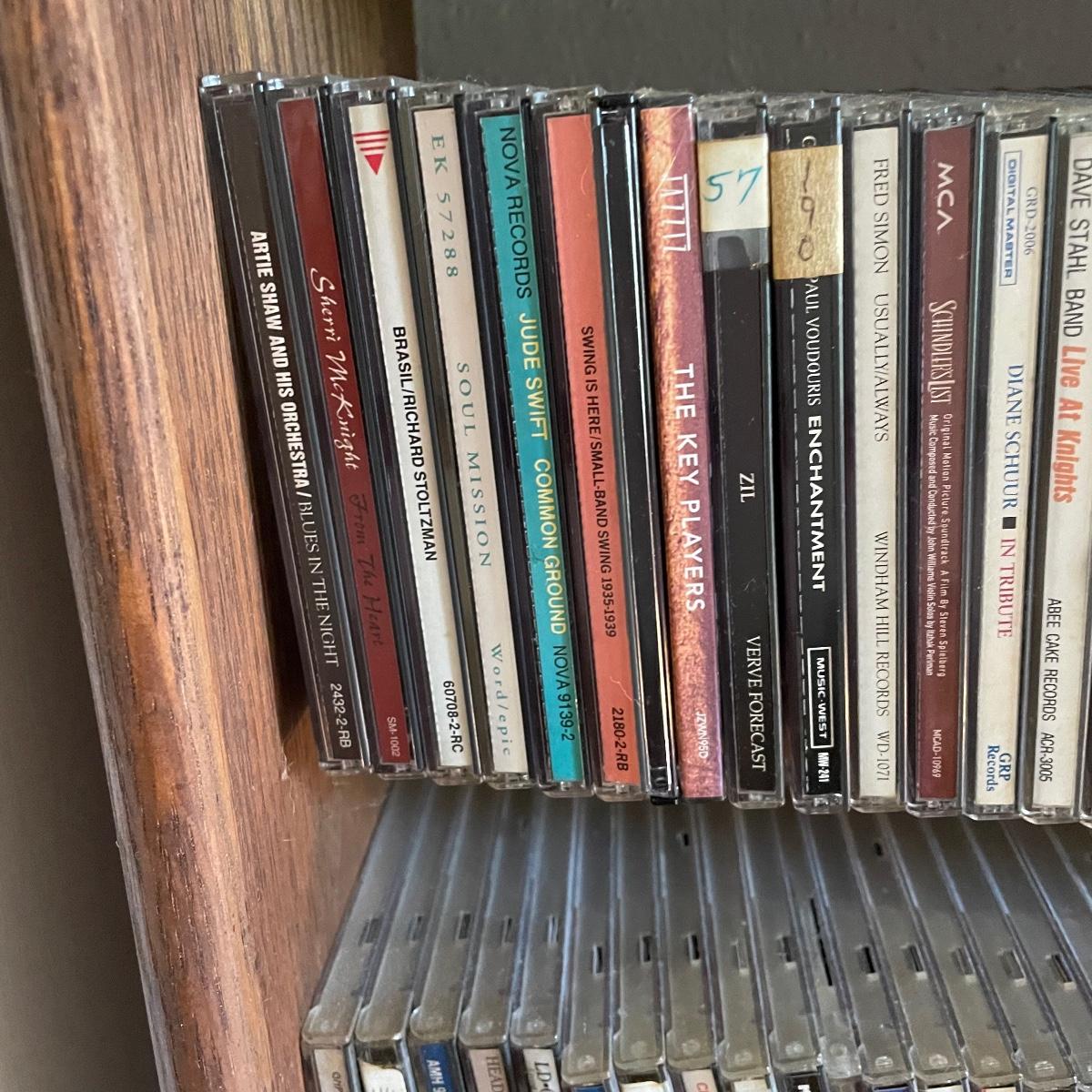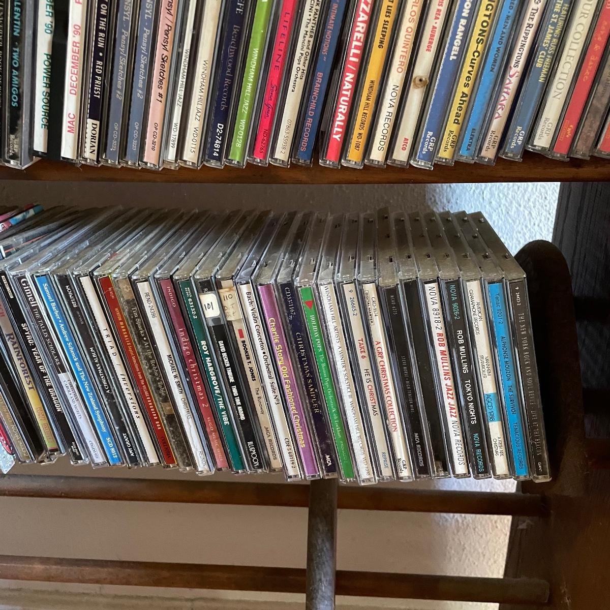 This good looking wood CD holder measures 30” x 9” x 61”. It is currently holding approximately 250 (we have not verified the contents of all of these), so altogether it could hold around 400. Includes artists James Taylor, Frank Sinatra, Booker T. Jones,Chet Atkins and many more.