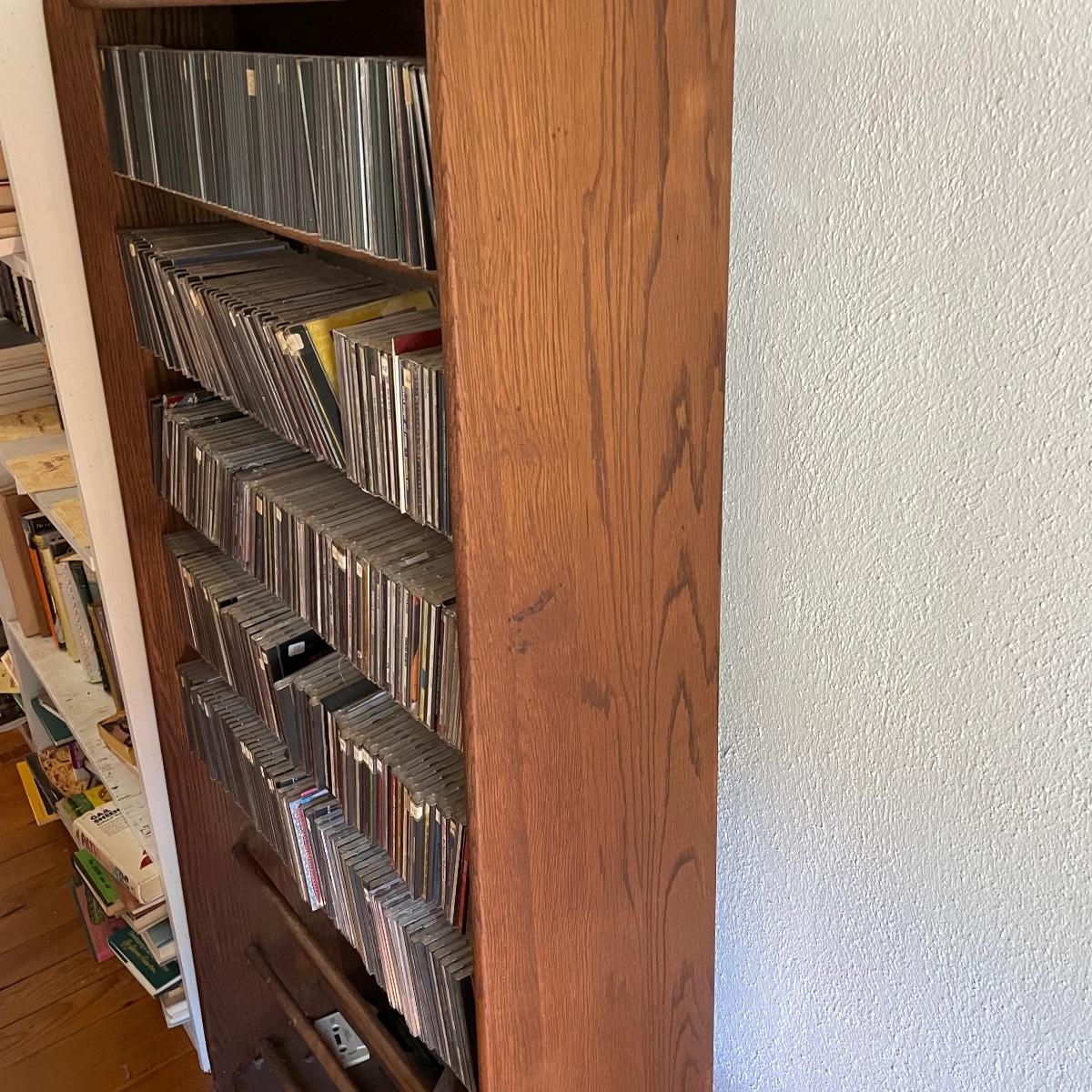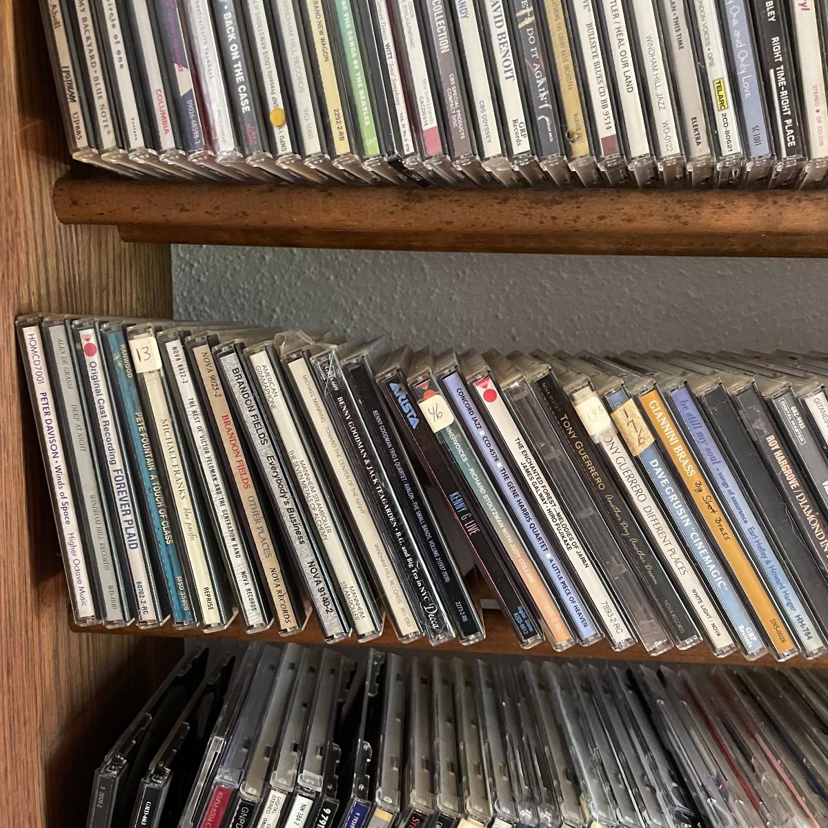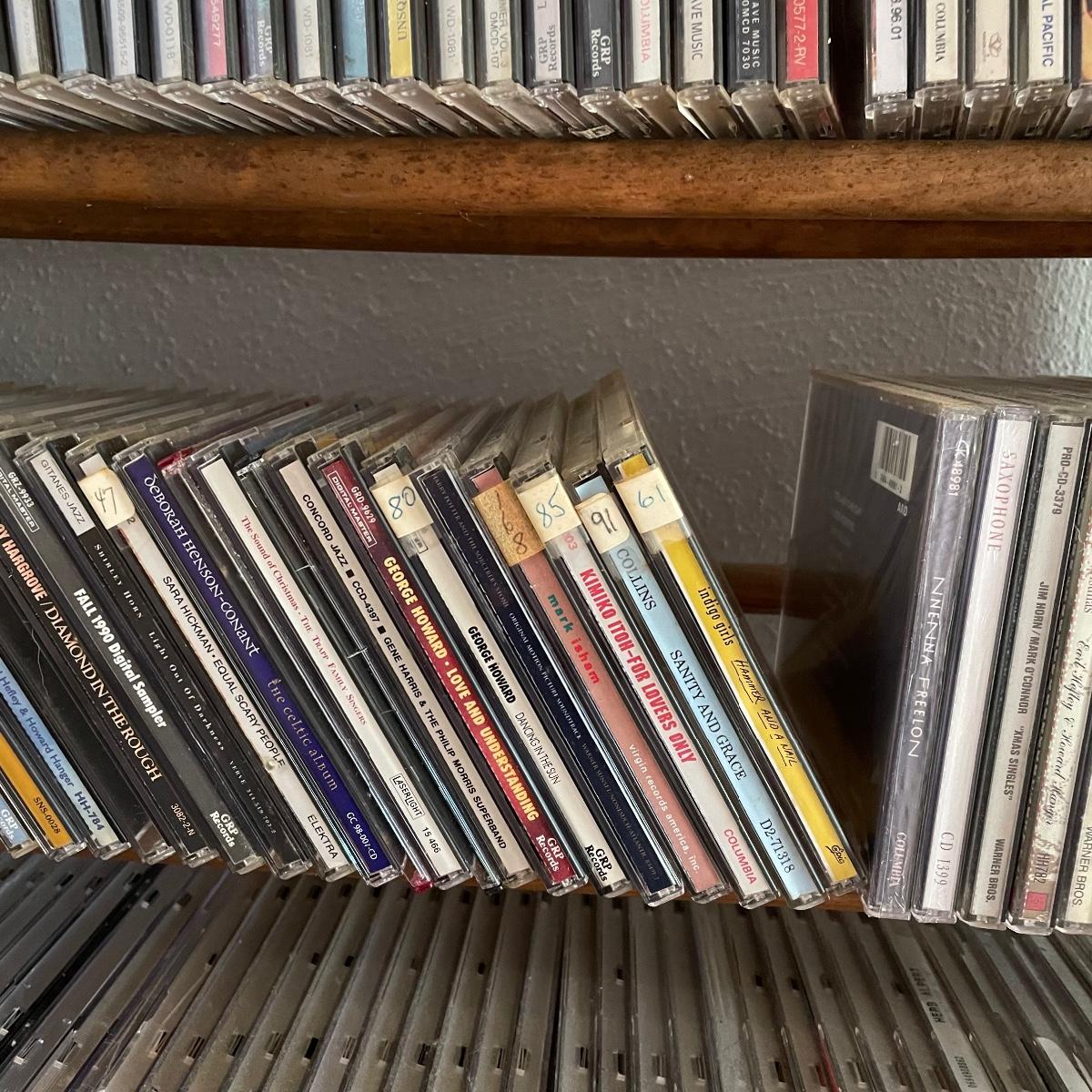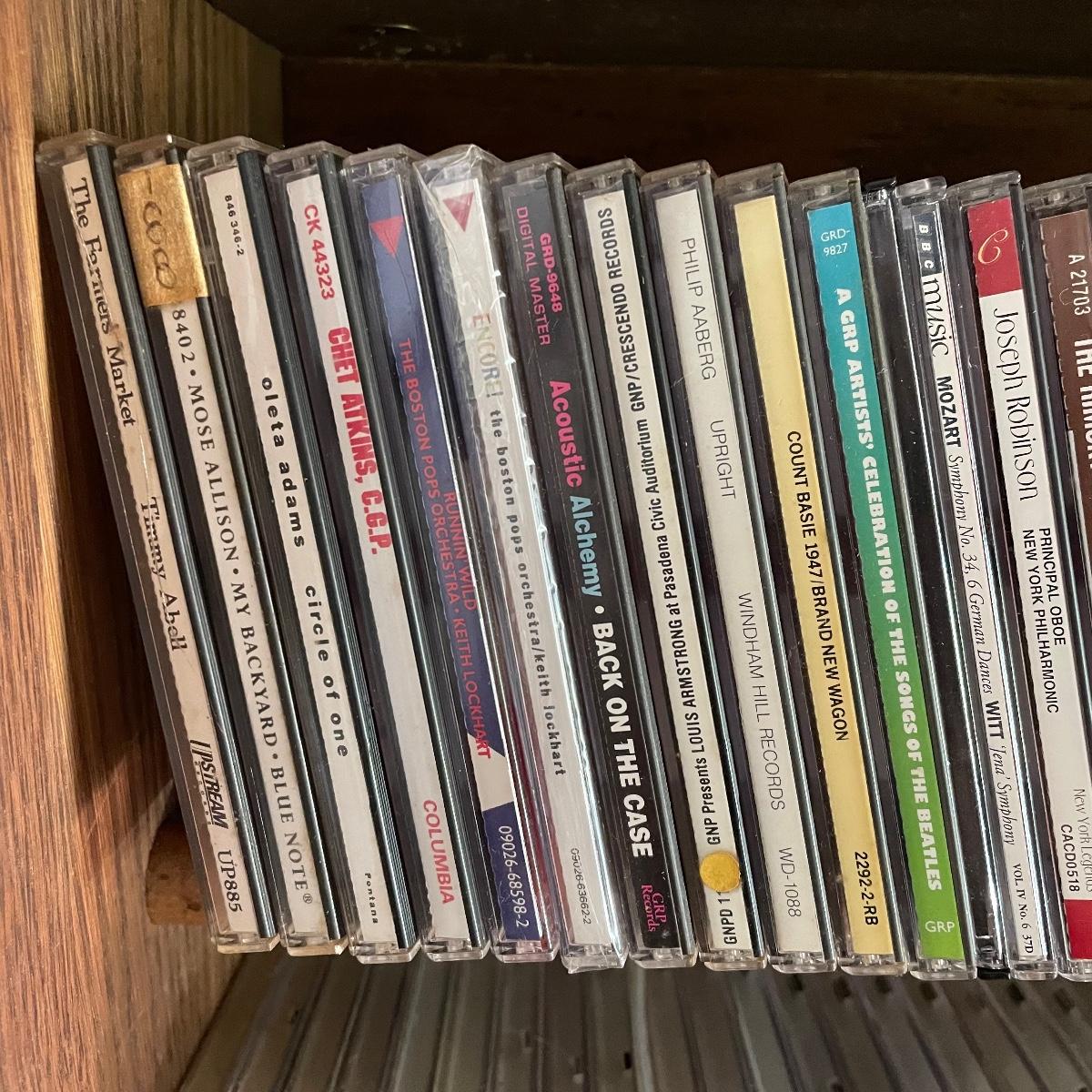 This good looking wood CD holder measures 30” x 9” x 61”. It is currently holding approximately 250 (we have not verified the contents of all of these), so altogether it could hold around 400. Includes artists James Taylor, Frank Sinatra, Booker T. Jones,Chet Atkins and many more.