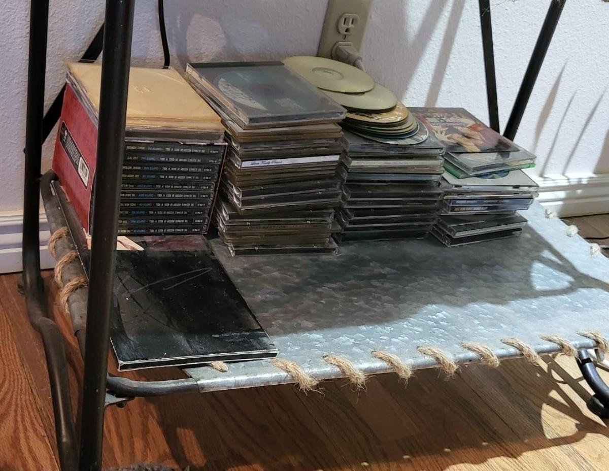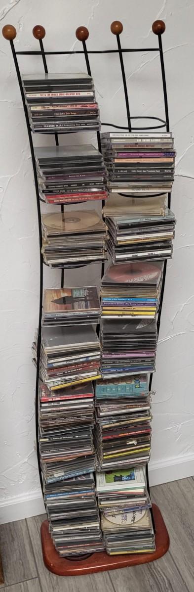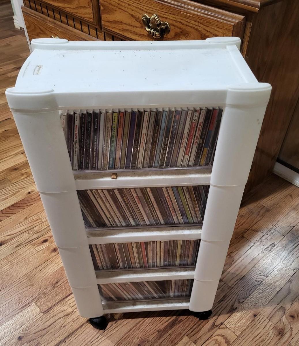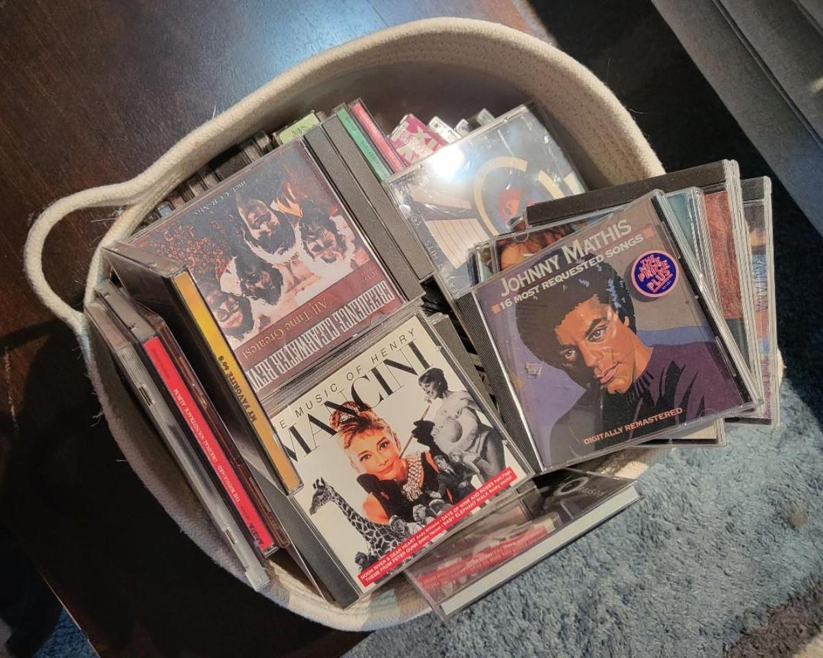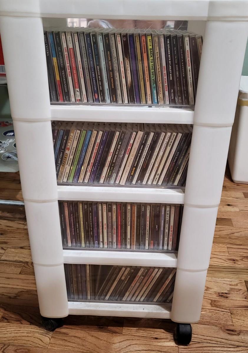 4 Bundles of CDs = hundreds of CDs, multiple genres. Lot includes CD tower, white/plastic storage unit, and fabric basket.