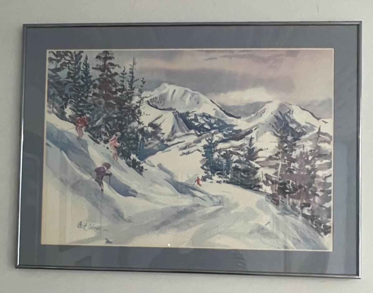 Description: Cecile Johnson Little Reb Run at Deer Valley Watercolor; Framed Measurement: 23.5 x 32; Subject Measurement: 18.5 x 27