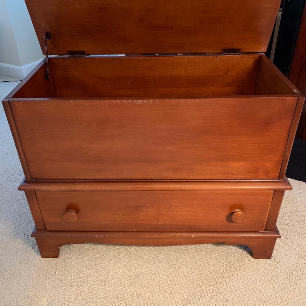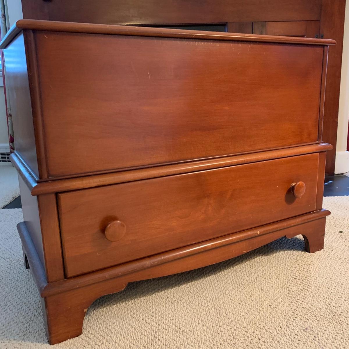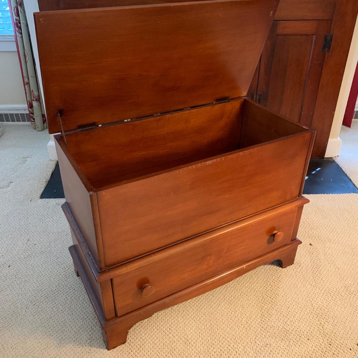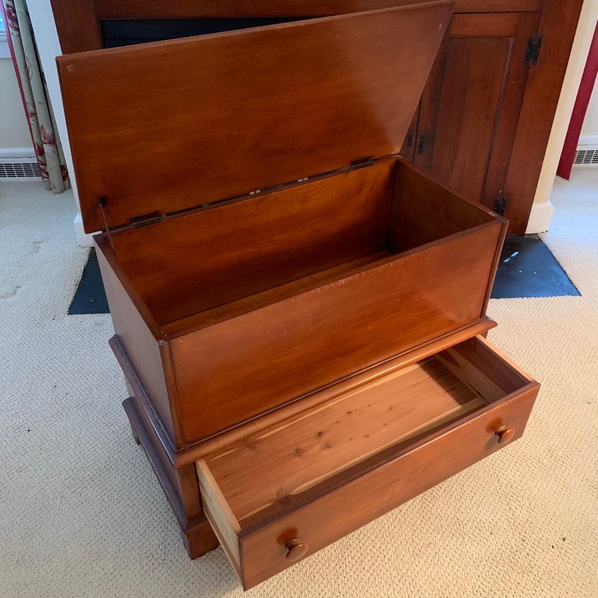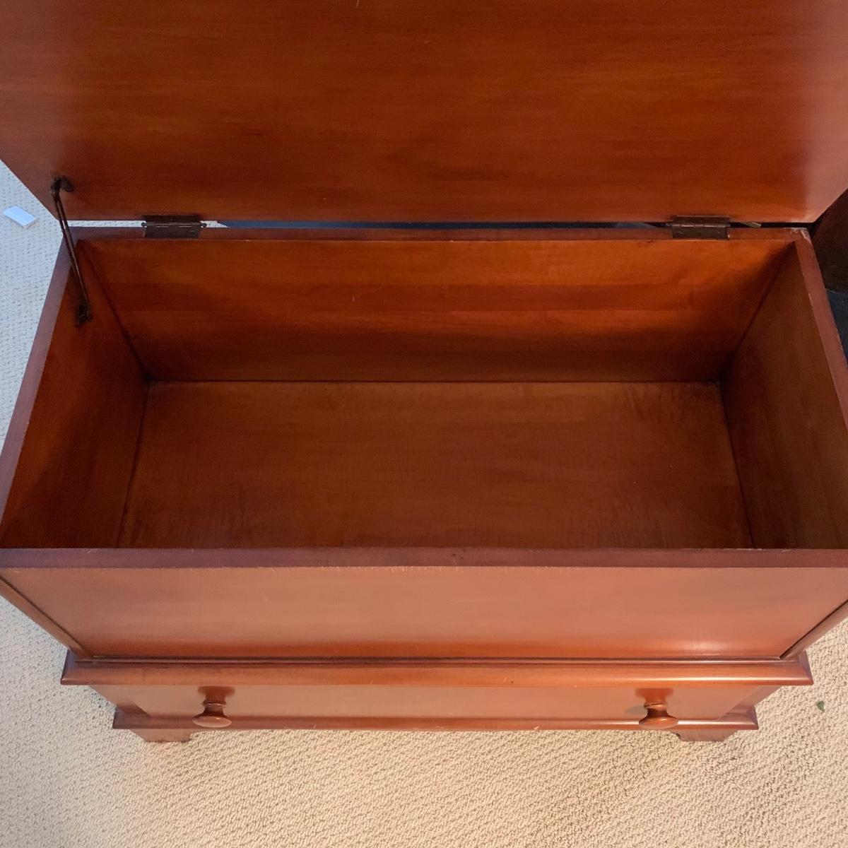 Cedar blanket chest by Continental Furniture Company. Chest features single drawer and measures approximately, 35.5” x 17.5” x 27”H. There are various nicks and scratches on the surface. Please see photos for more details.