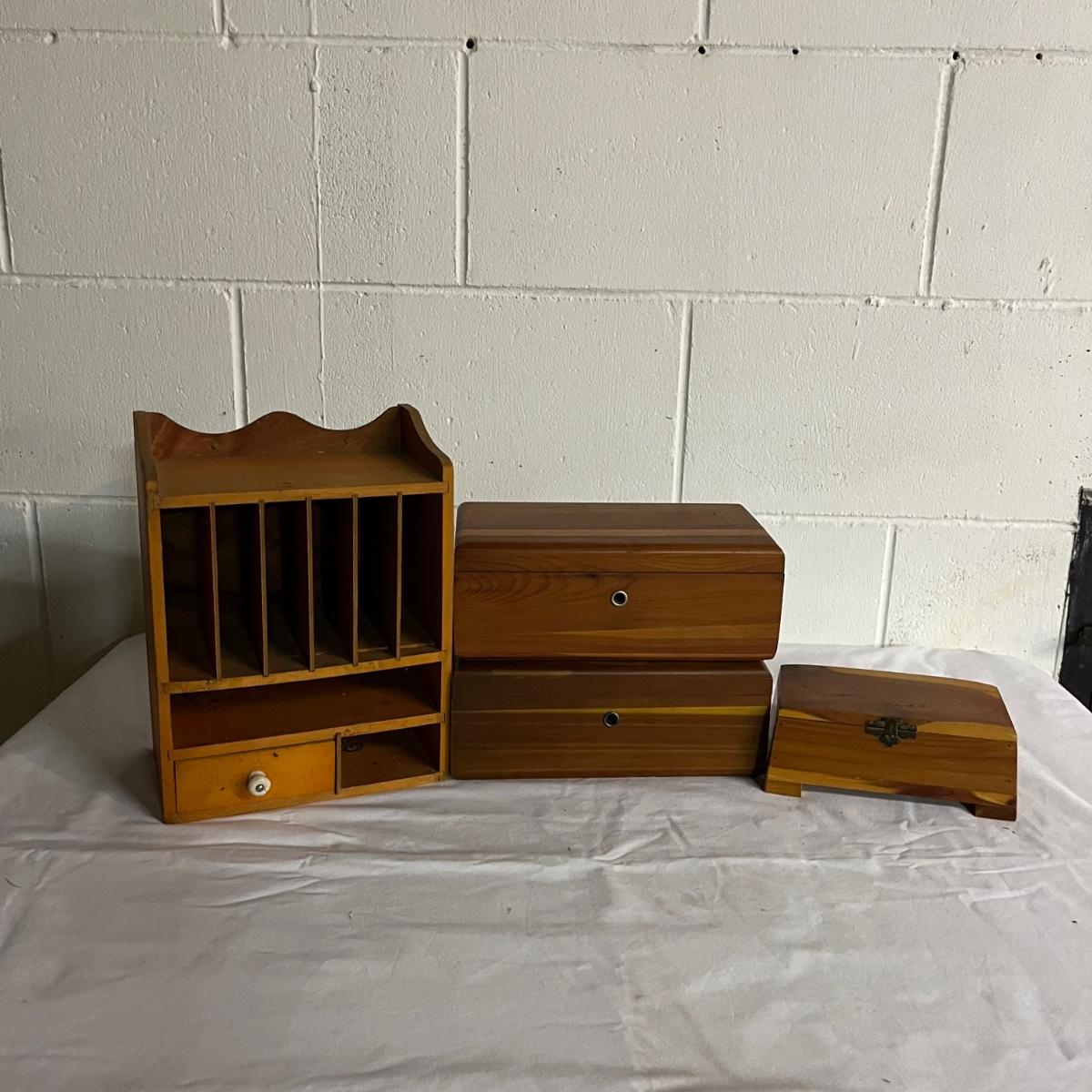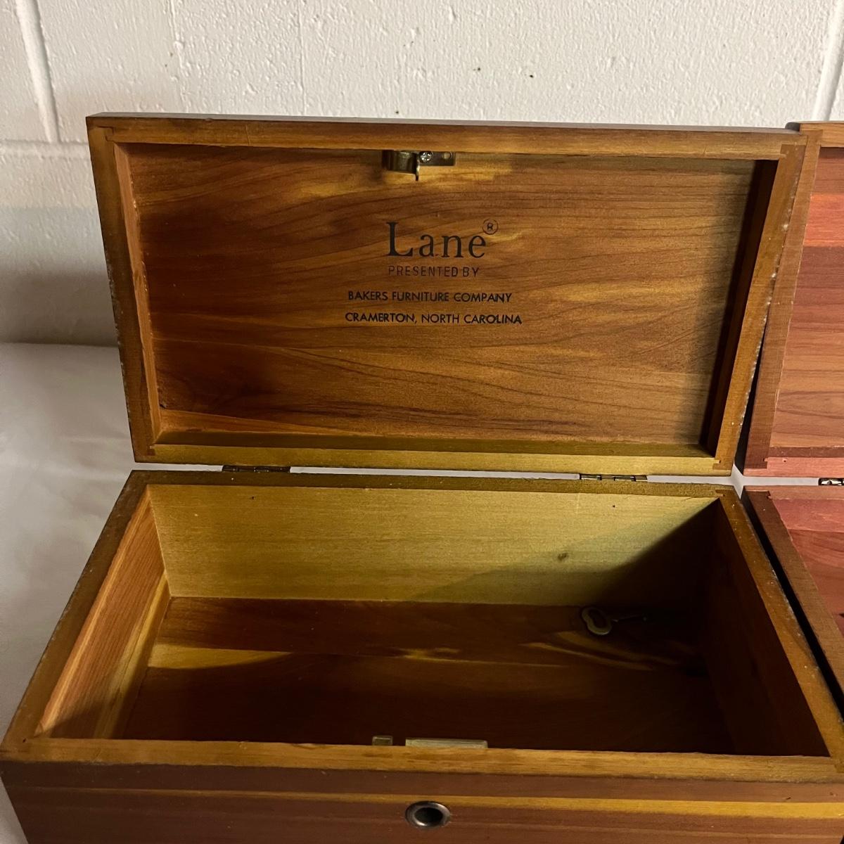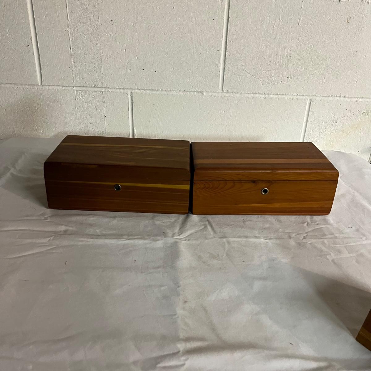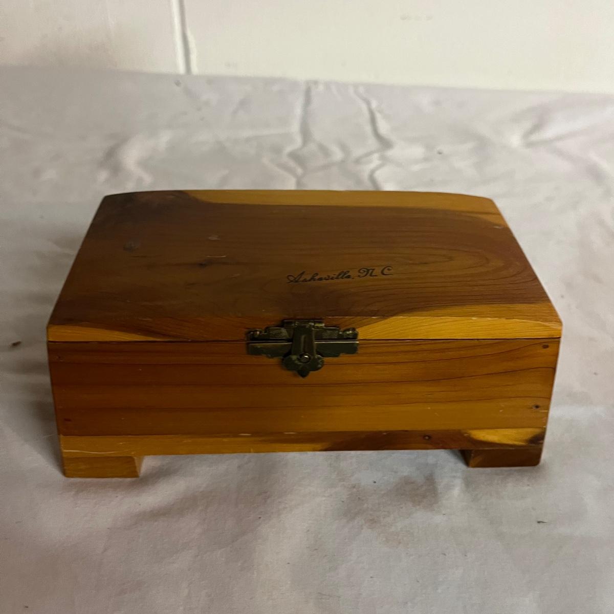 Lot includes a Lane cedar box with key, unmarked cedar box with no key, cedar box with Asheville NC painted on top and a wooden miniature cabinet. That measures 4.6” x 7.5” x 10”.