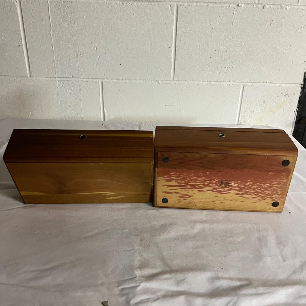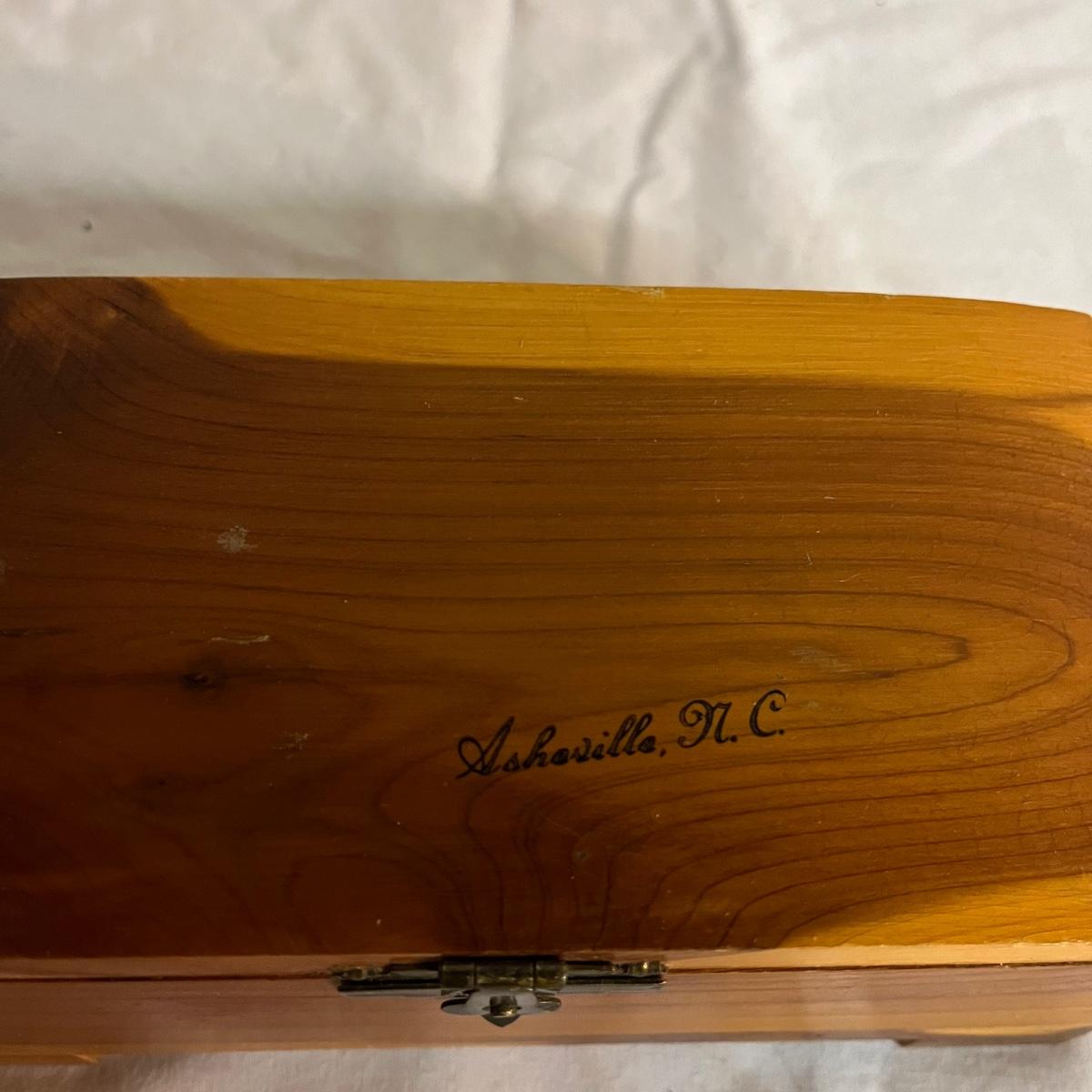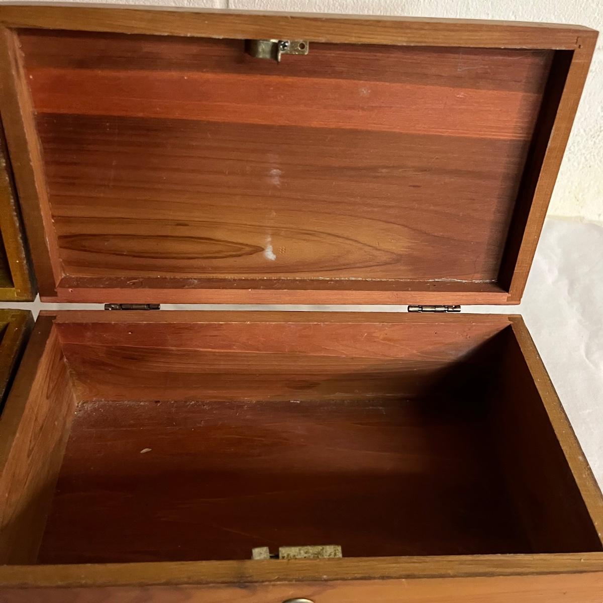 Lot includes a Lane cedar box with key, unmarked cedar box with no key, cedar box with Asheville NC painted on top and a wooden miniature cabinet. That measures 4.6” x 7.5” x 10”.