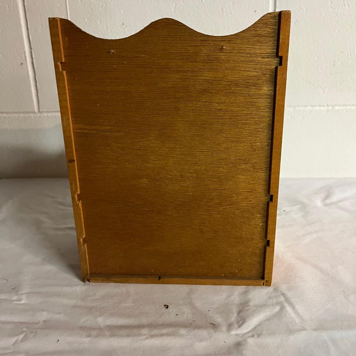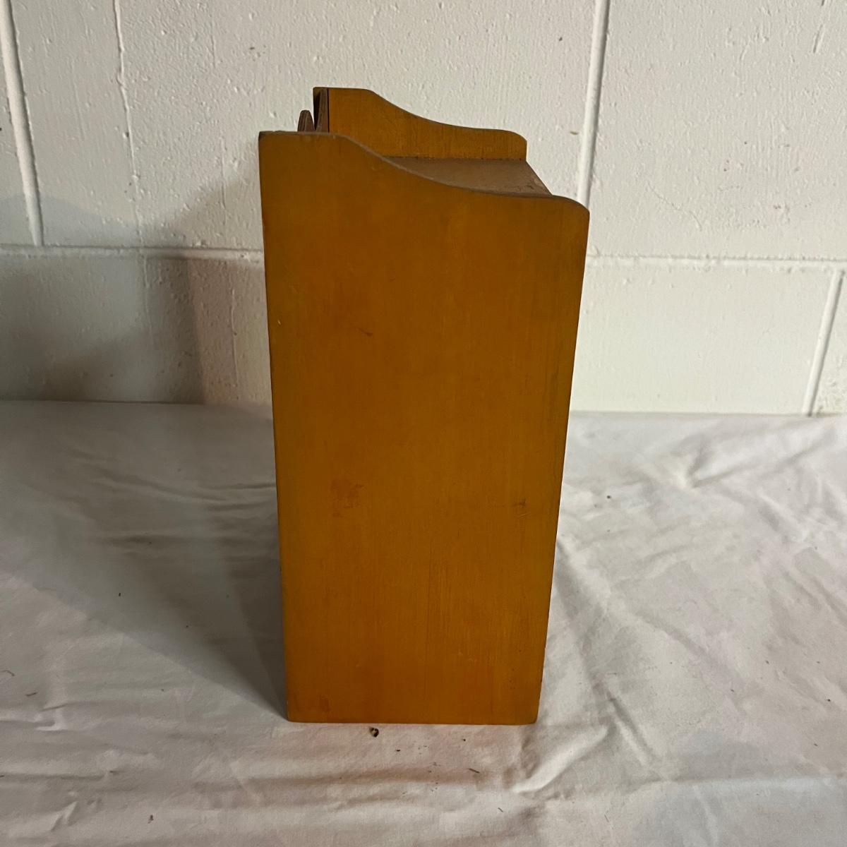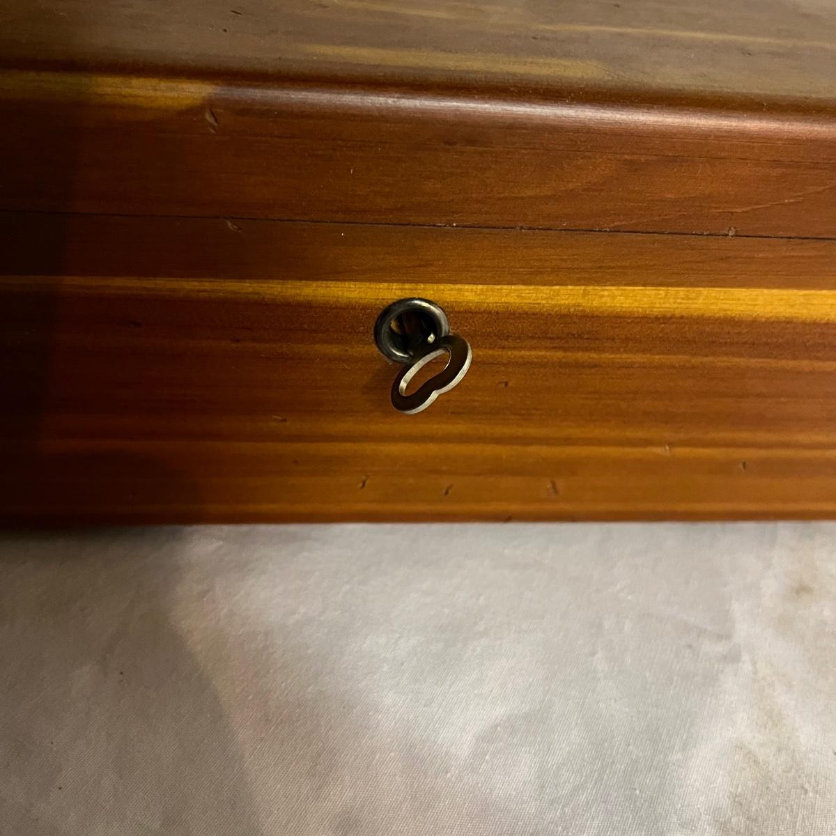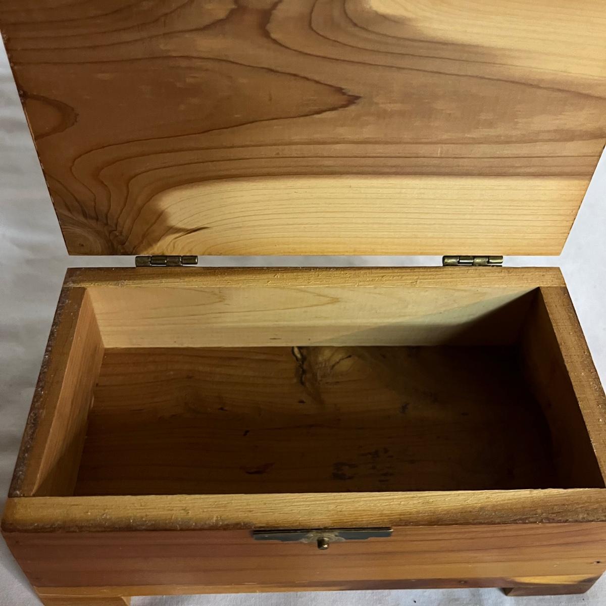 Lot includes a Lane cedar box with key, unmarked cedar box with no key, cedar box with Asheville NC painted on top and a wooden miniature cabinet. That measures 4.6” x 7.5” x 10”.