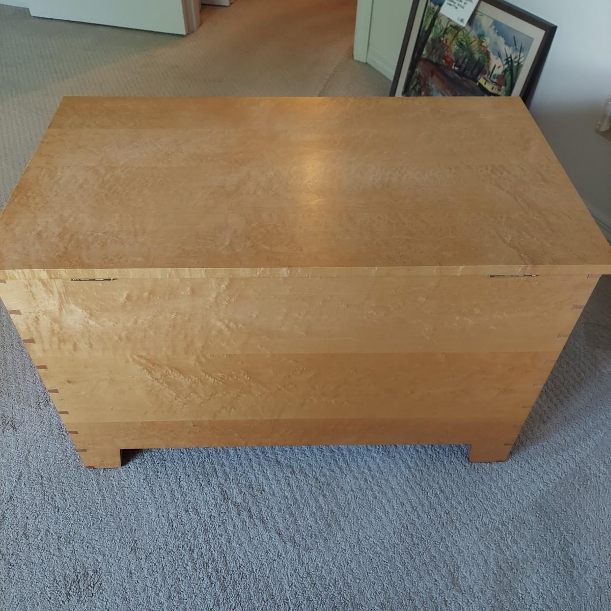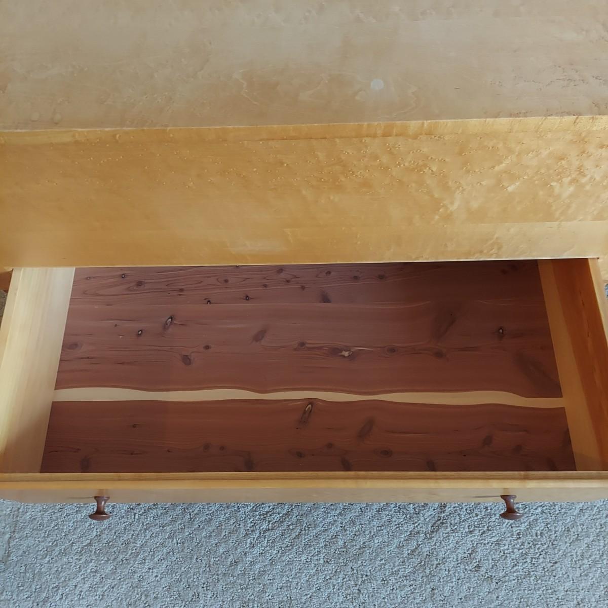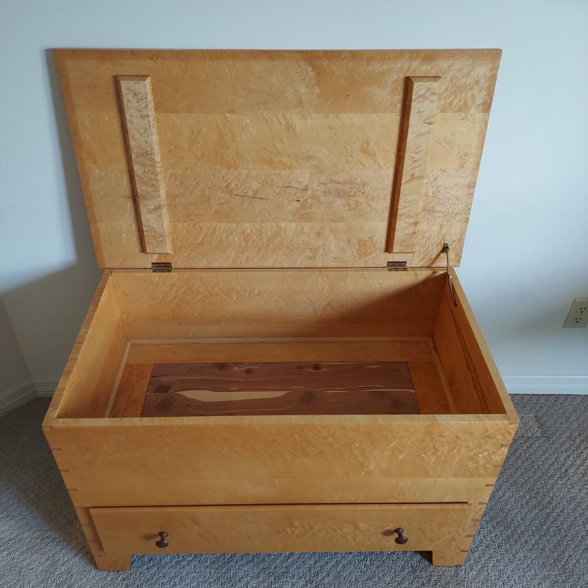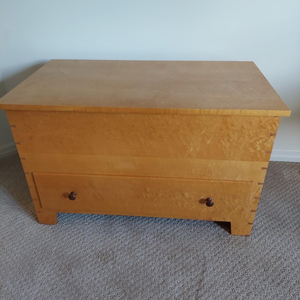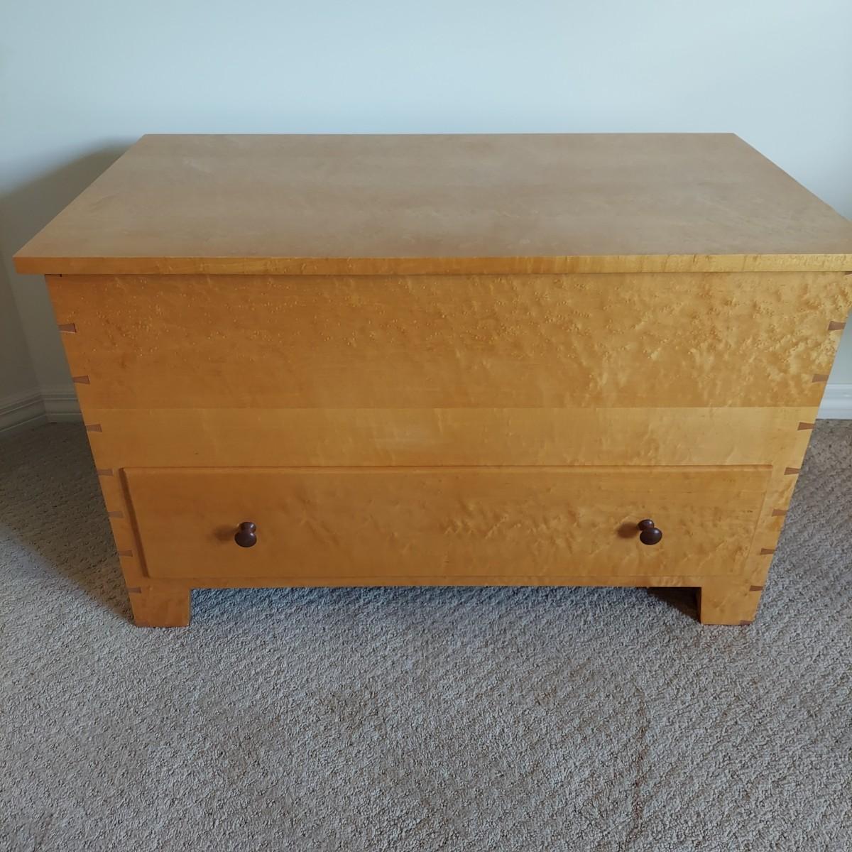 Shaker style solid wood hope chest. Chest is made of a beautiful blonde colored wood and is cedar lined. It has inside blanket storage with a bottom drawer. Measures 37.5" x 21" x 23.5"H. Local Pickup Only.