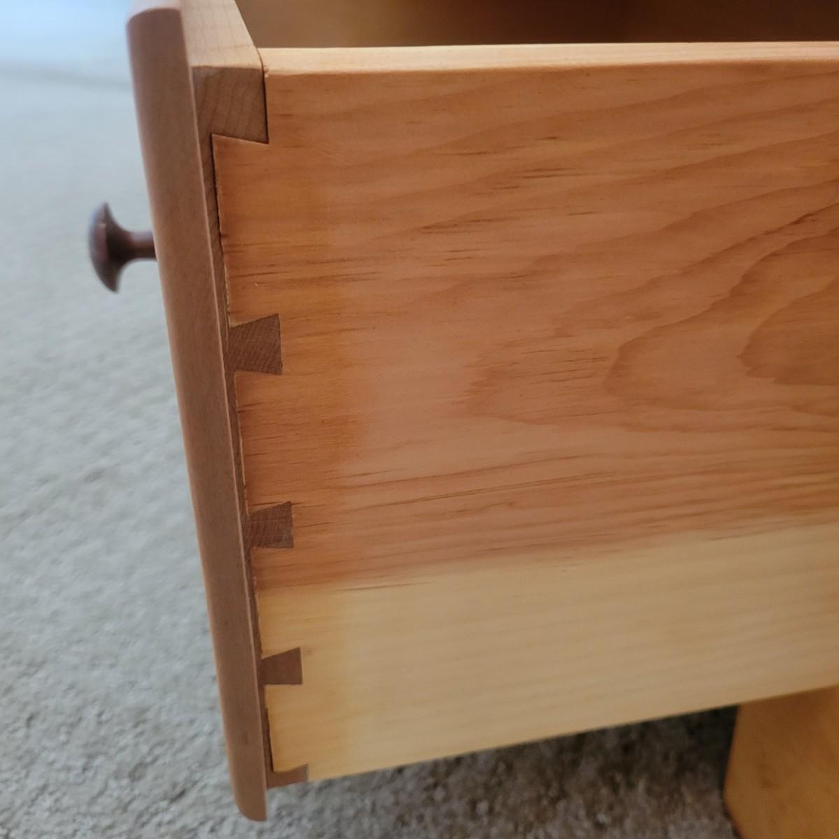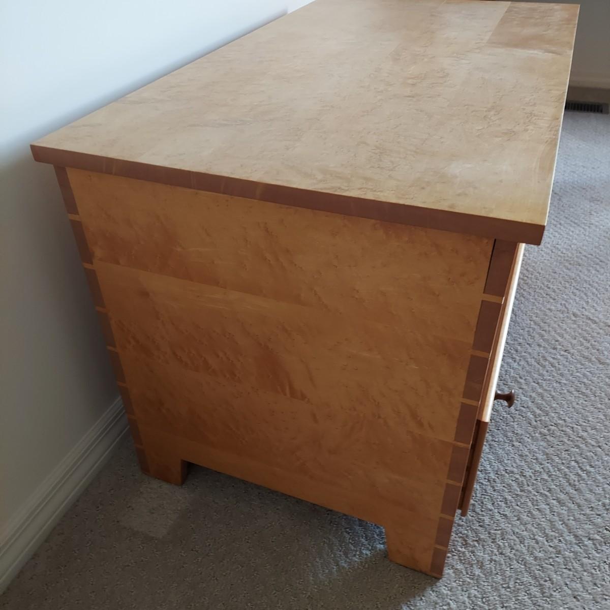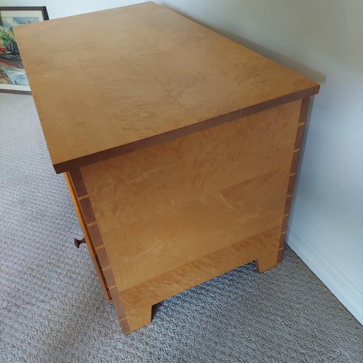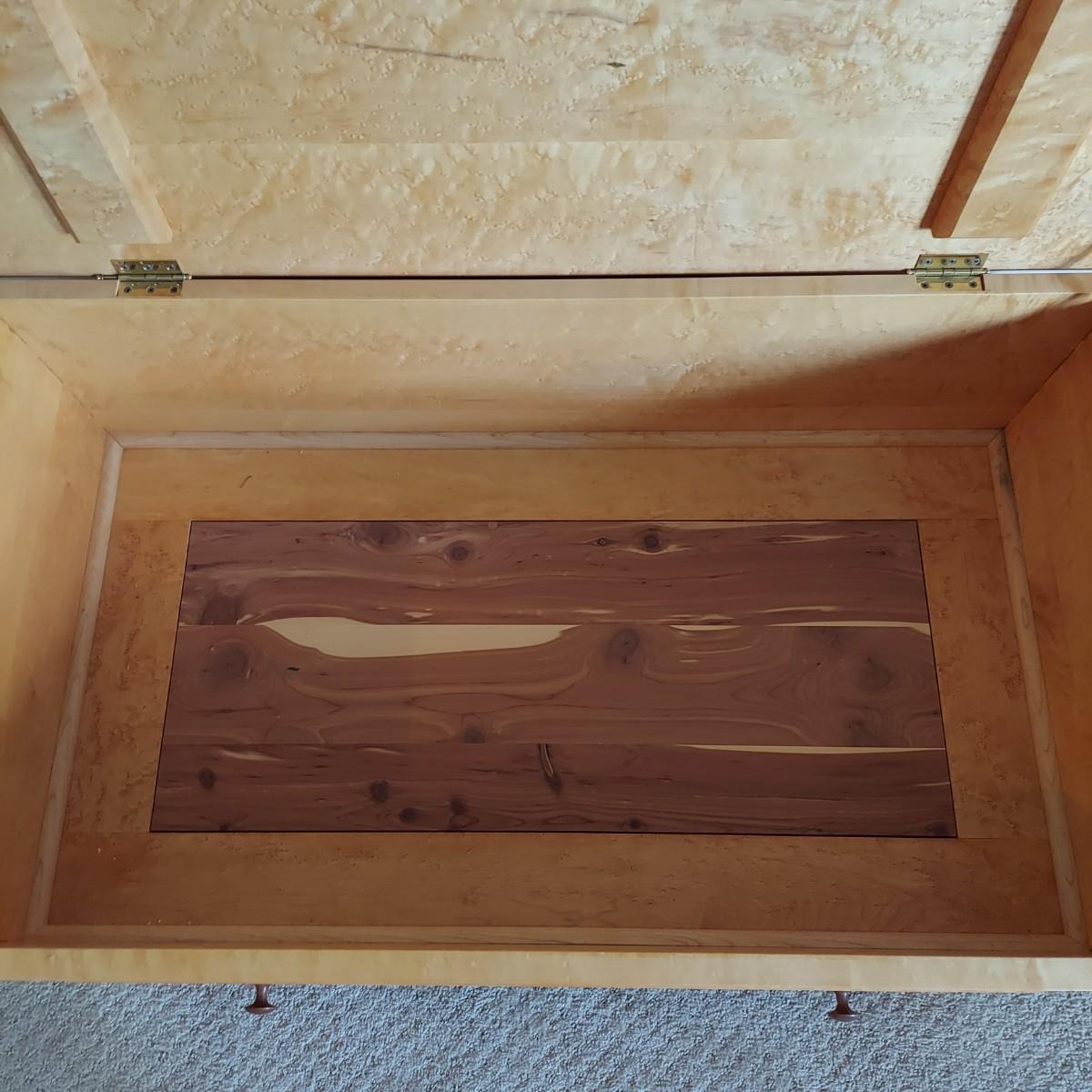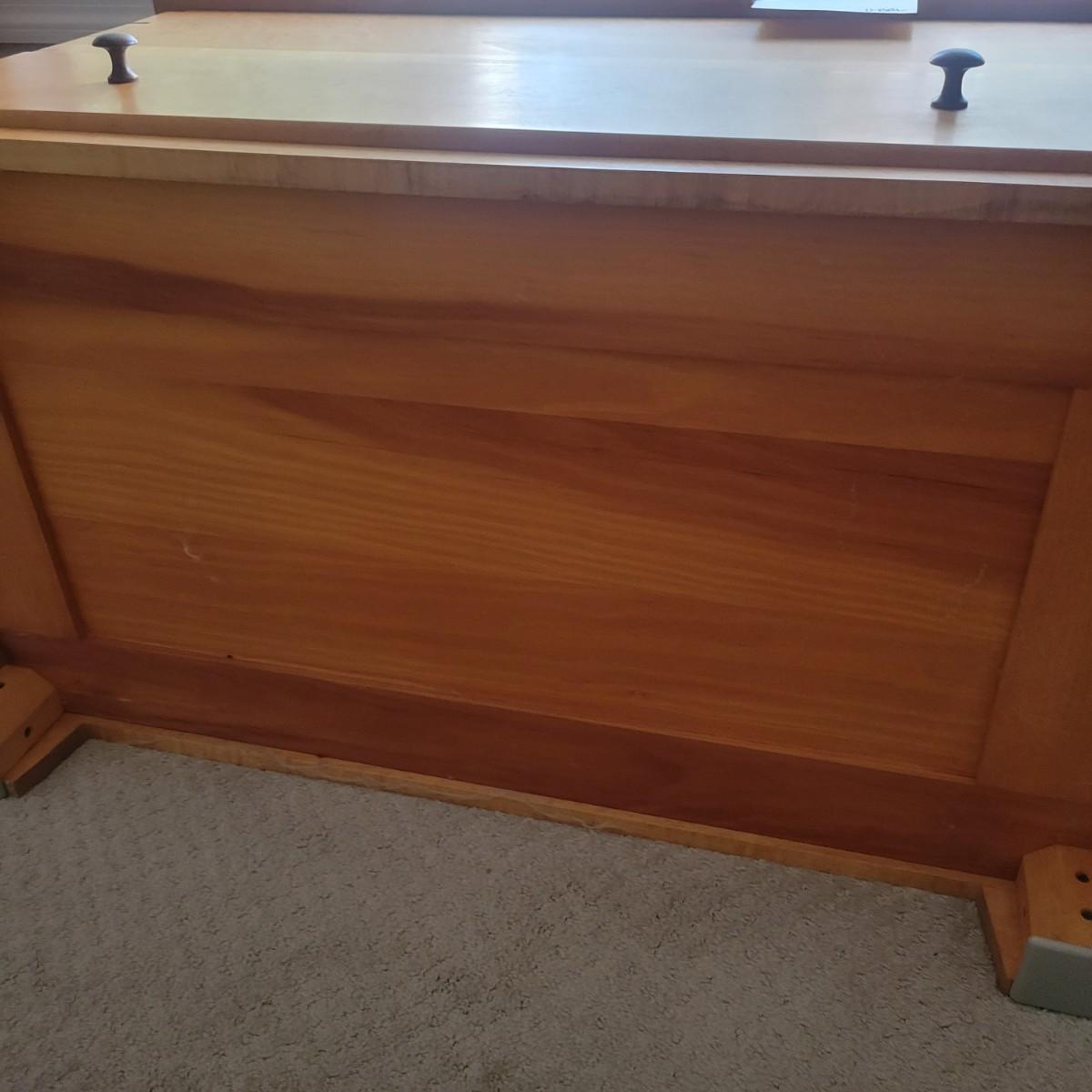 Shaker style solid wood hope chest. Chest is made of a beautiful blonde colored wood and is cedar lined. It has inside blanket storage with a bottom drawer. Measures 37.5" x 21" x 23.5"H. Local Pickup Only.