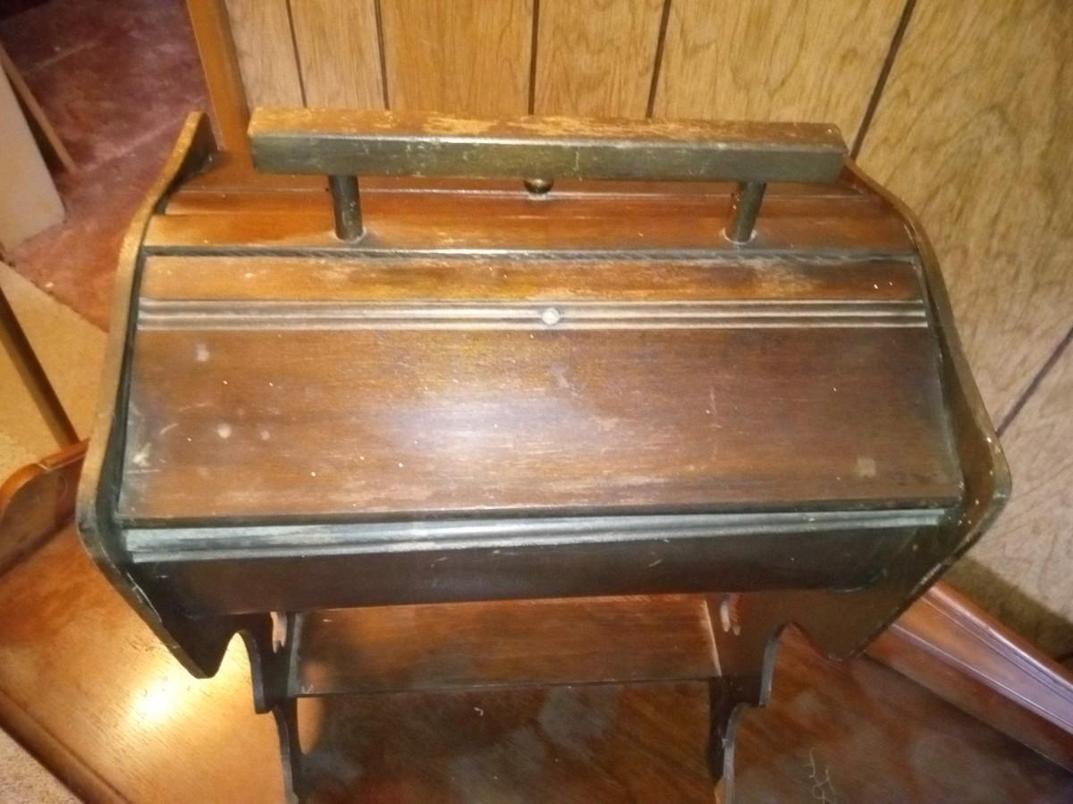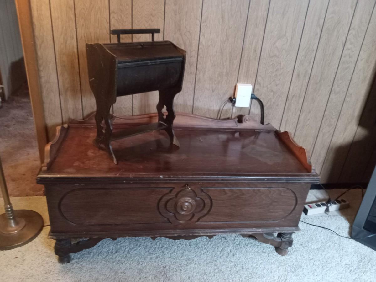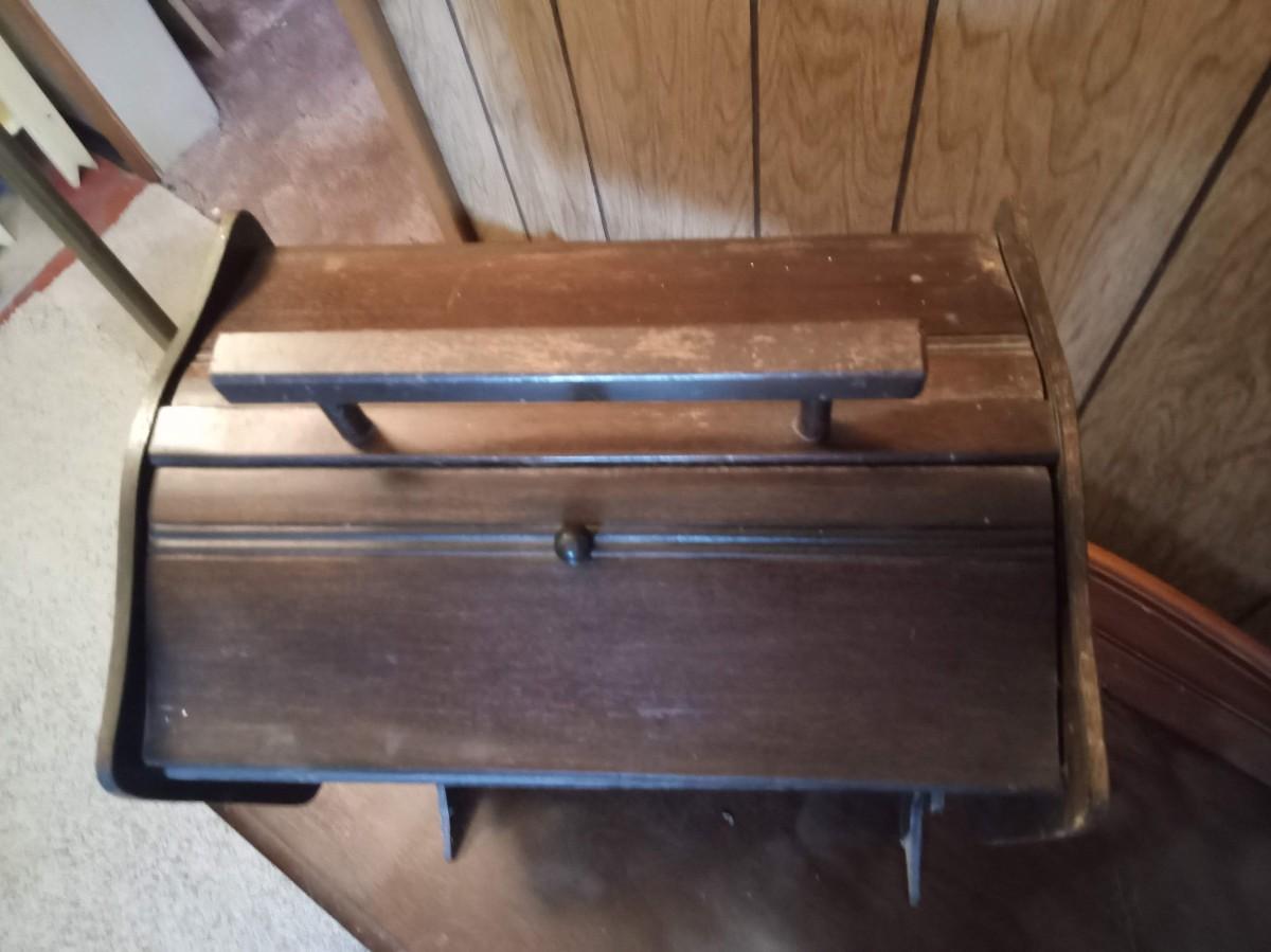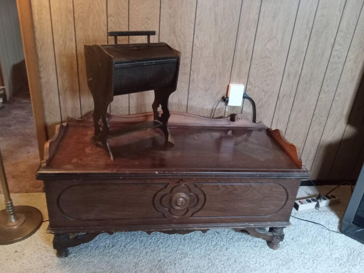 THE SEWING BOX IS MISSING A KNOB AND ALSO HAS SOME DAMAGE 20" X 13"