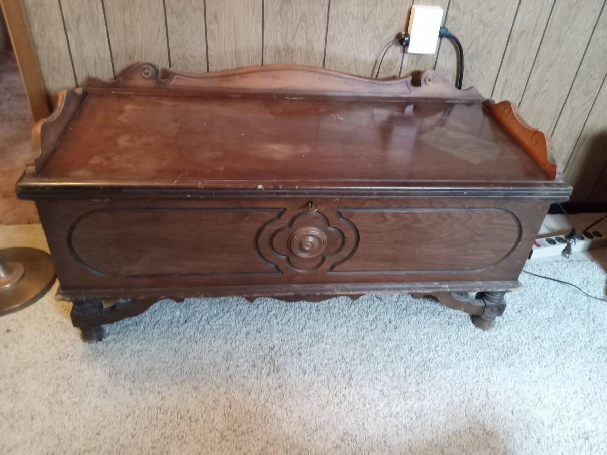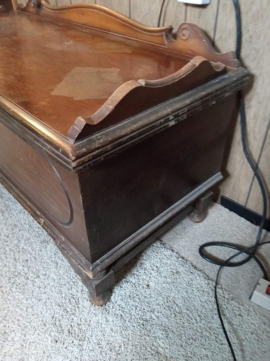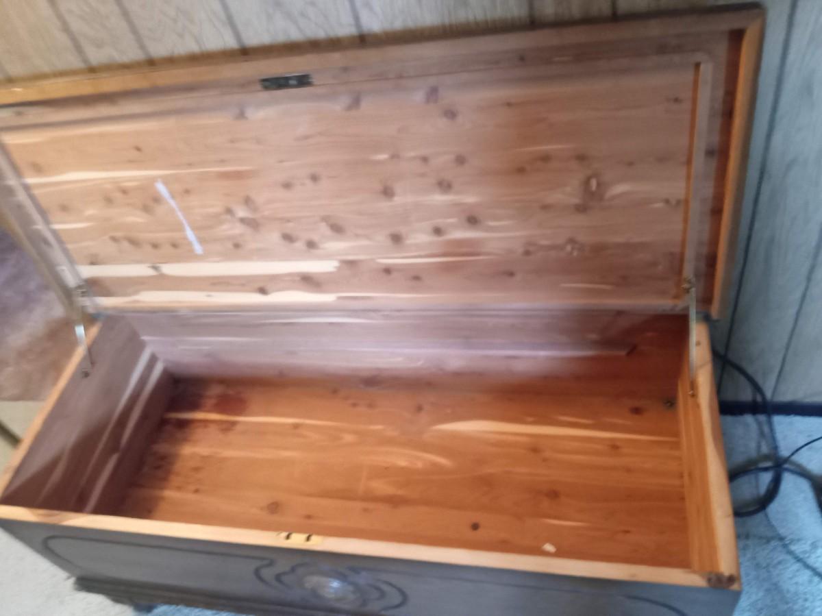 CEDAR CHEST HAS DAMAGE TO THE FINISH ON THE LID IT MEASURES 45" X 19" X 22"